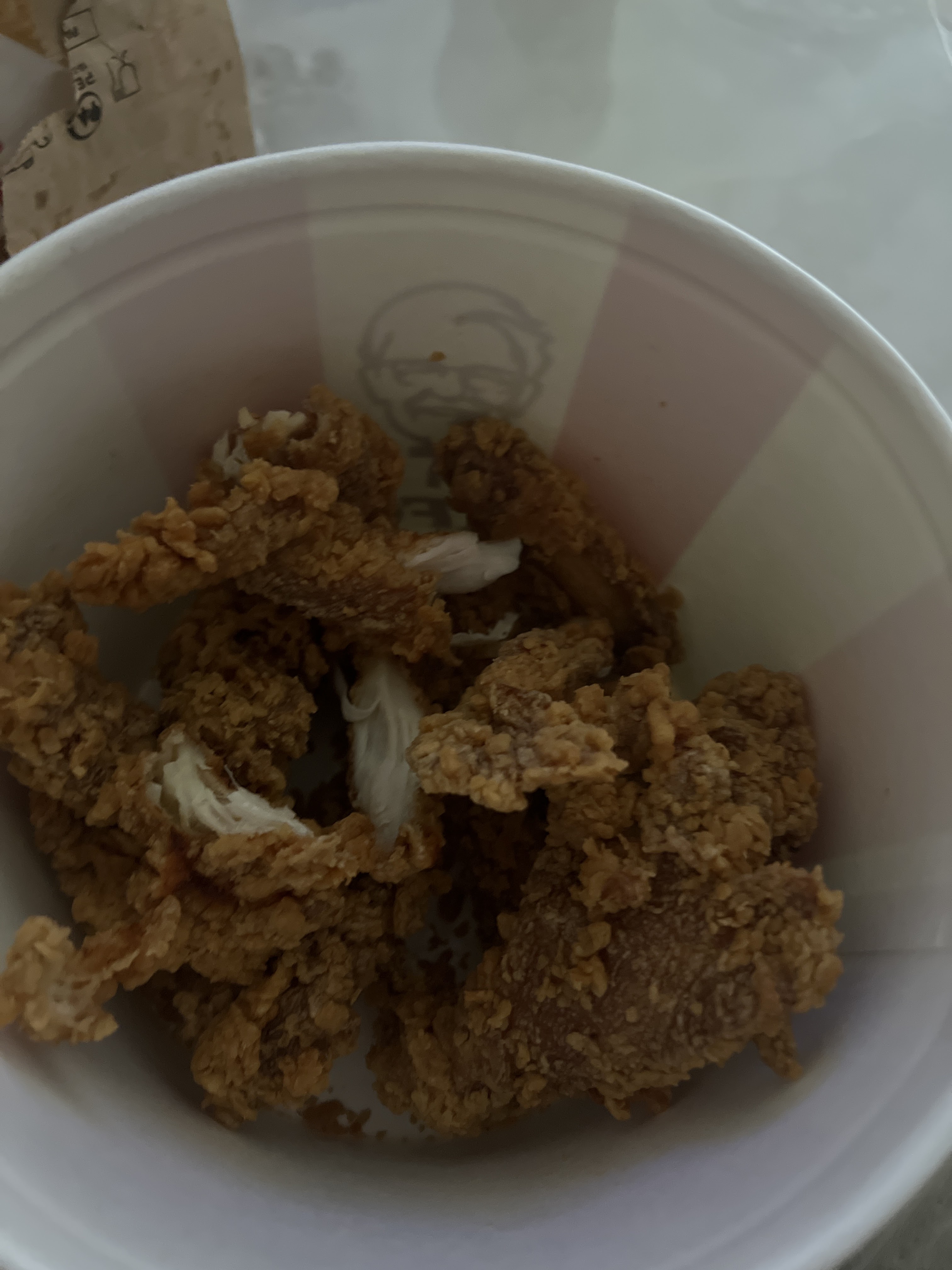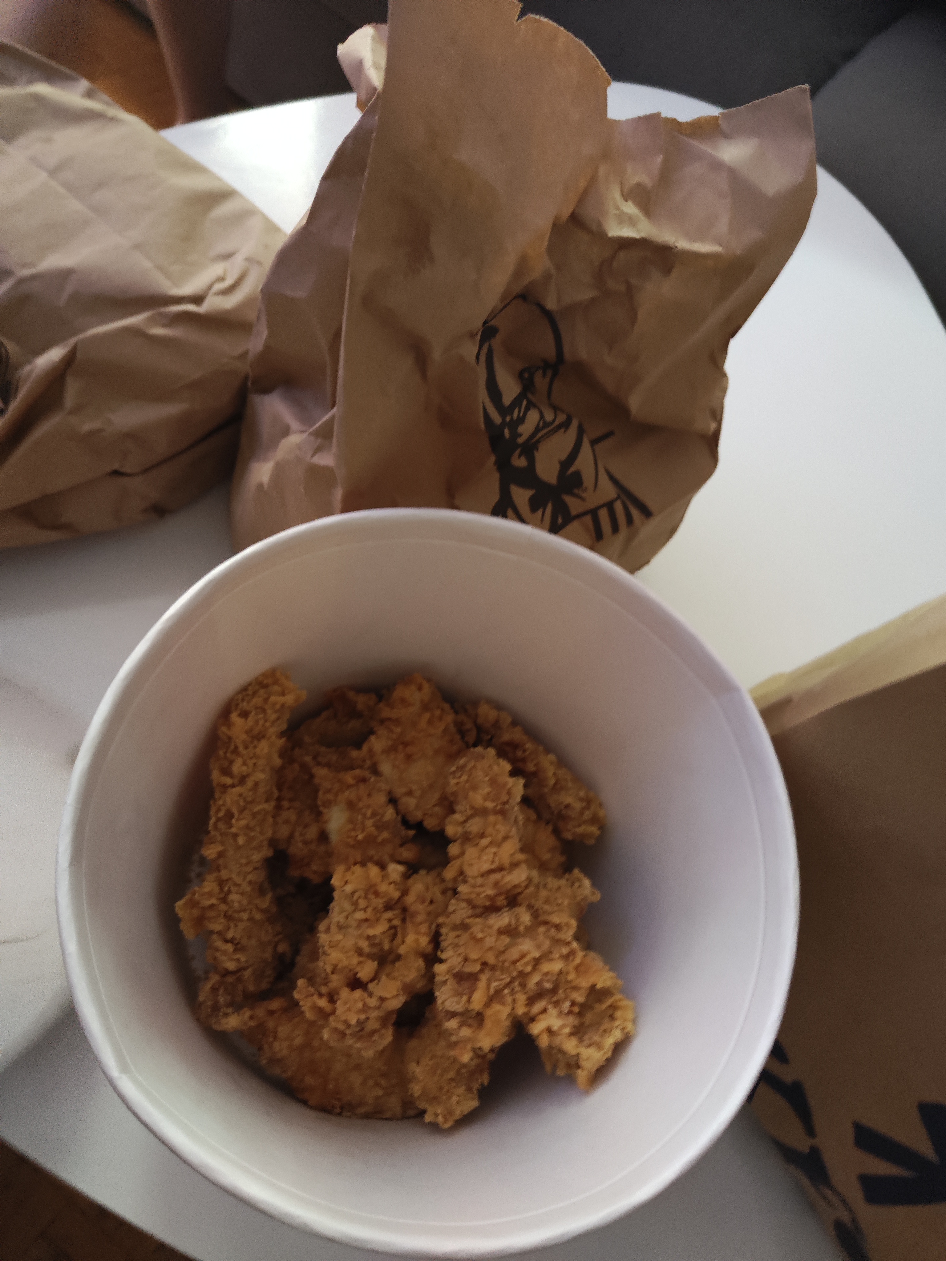 Je comprends mieux pourquoi KFC est en chute, j'ai le souvenir d'avoir dégusté par le passé des tenders épais et moelleux, aujourd'hui nous sommes très déçus de constater ma famille et moi que les morceaux de poulets sont très fins on a l'impression de ne manger que des céréales, c'est la dernière fois que je commande chez eux