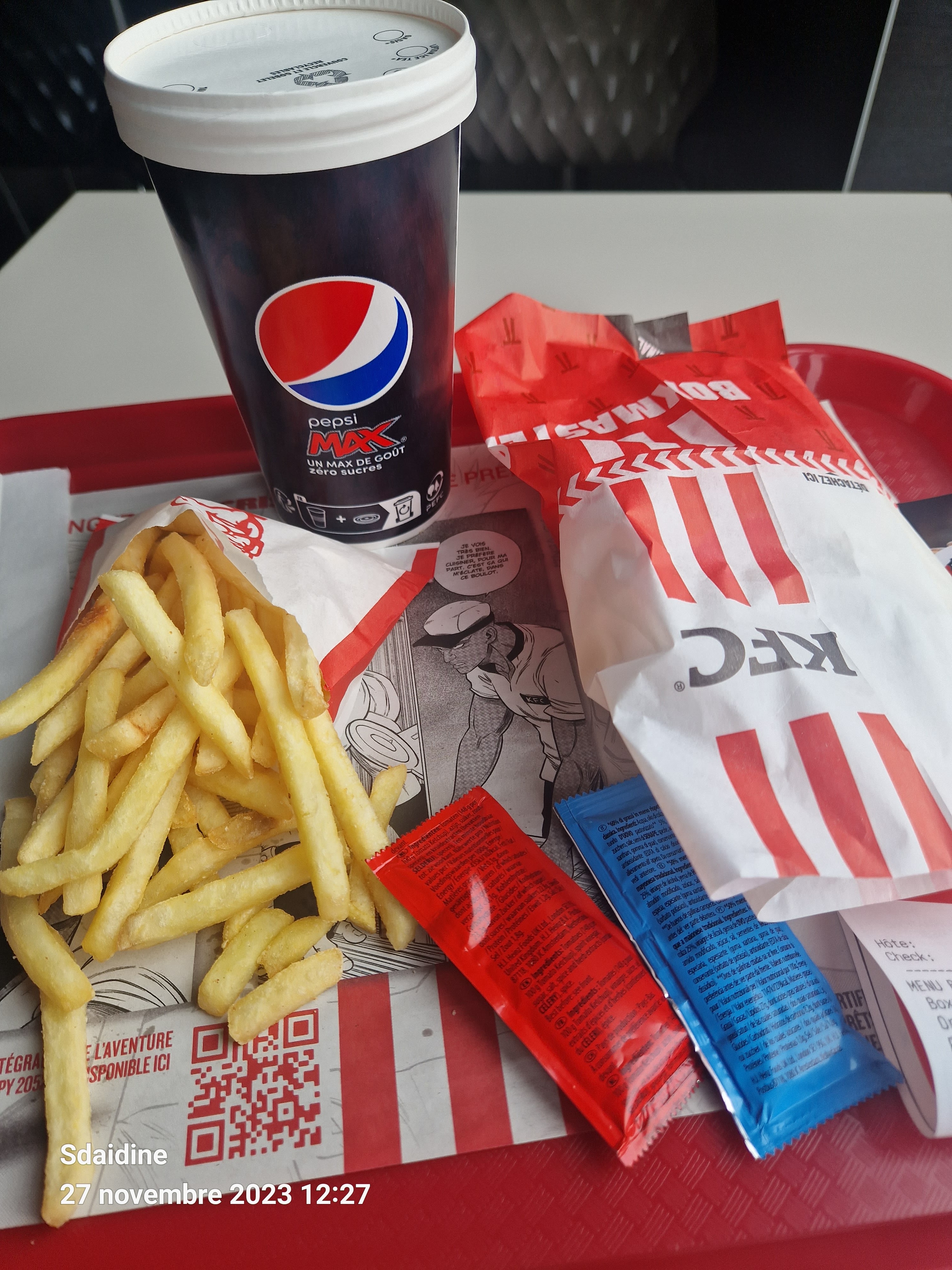 Bonjour, je viens de passer au drive en pensant à une commande d’un menu Bucket pour deux personnes. Les poulets ils sont dégueulasses ça se voit que ça fait 10 heures qu’il s’en sortis. J’habite à 35 minutes. Vous vous imaginez bien que je ne retournerai pas pour 20 €, mais quand même c’est le fait de vous prévenir KFC, à éviter Les poulets sont vraiment dégueulasses, tout durs, un mangeable