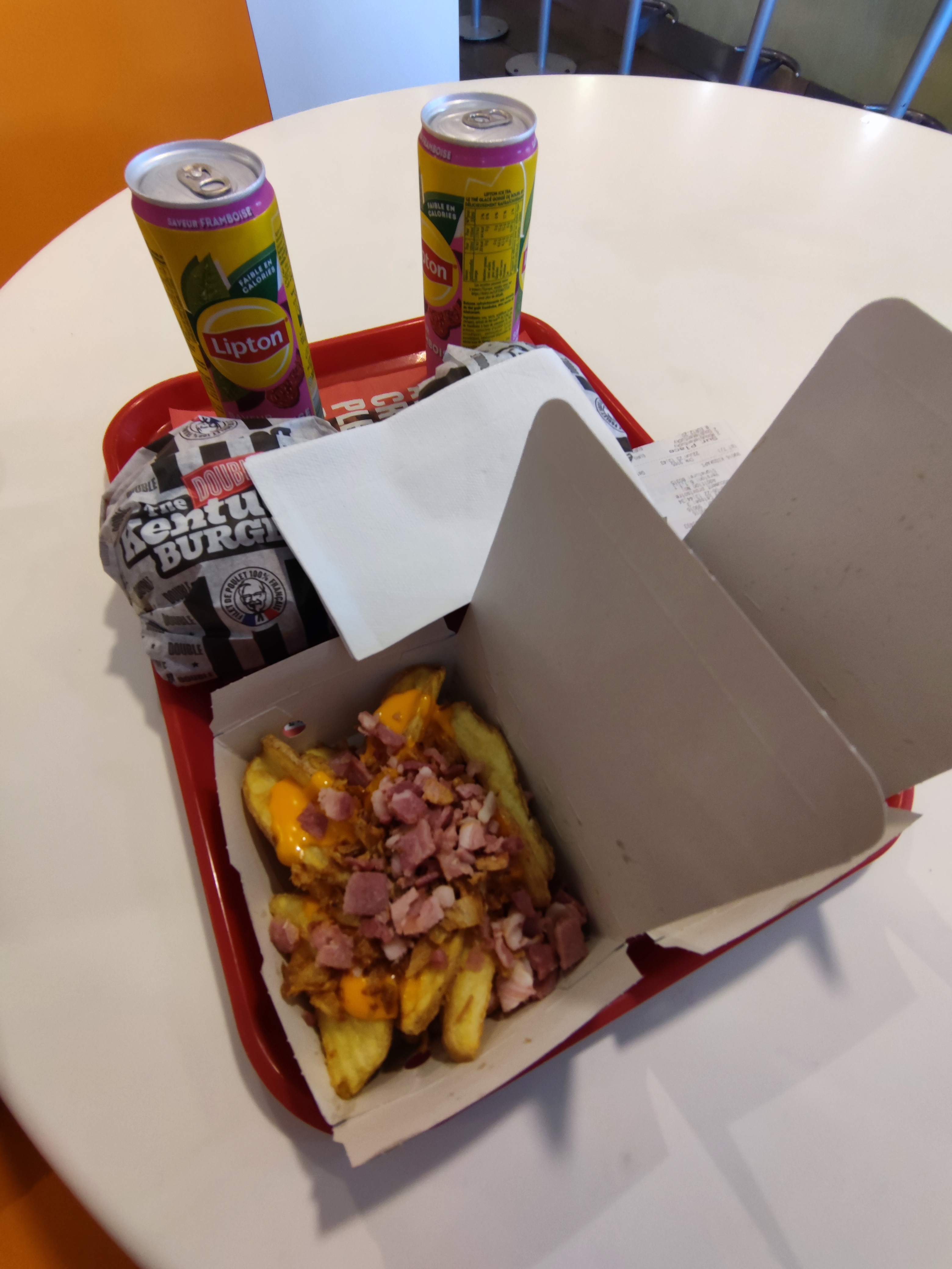 Paiement au comptoir, une dame nous force à mettre 5 étoiles partout pour augmenter les avis. Je comprends pourquoi, - service froid sur tous les produits (frites, tenders, wings…) - quantités maigres - boissons sans bulles KFC ne vaut pas son prix et surtout pas son ancienne réputation.