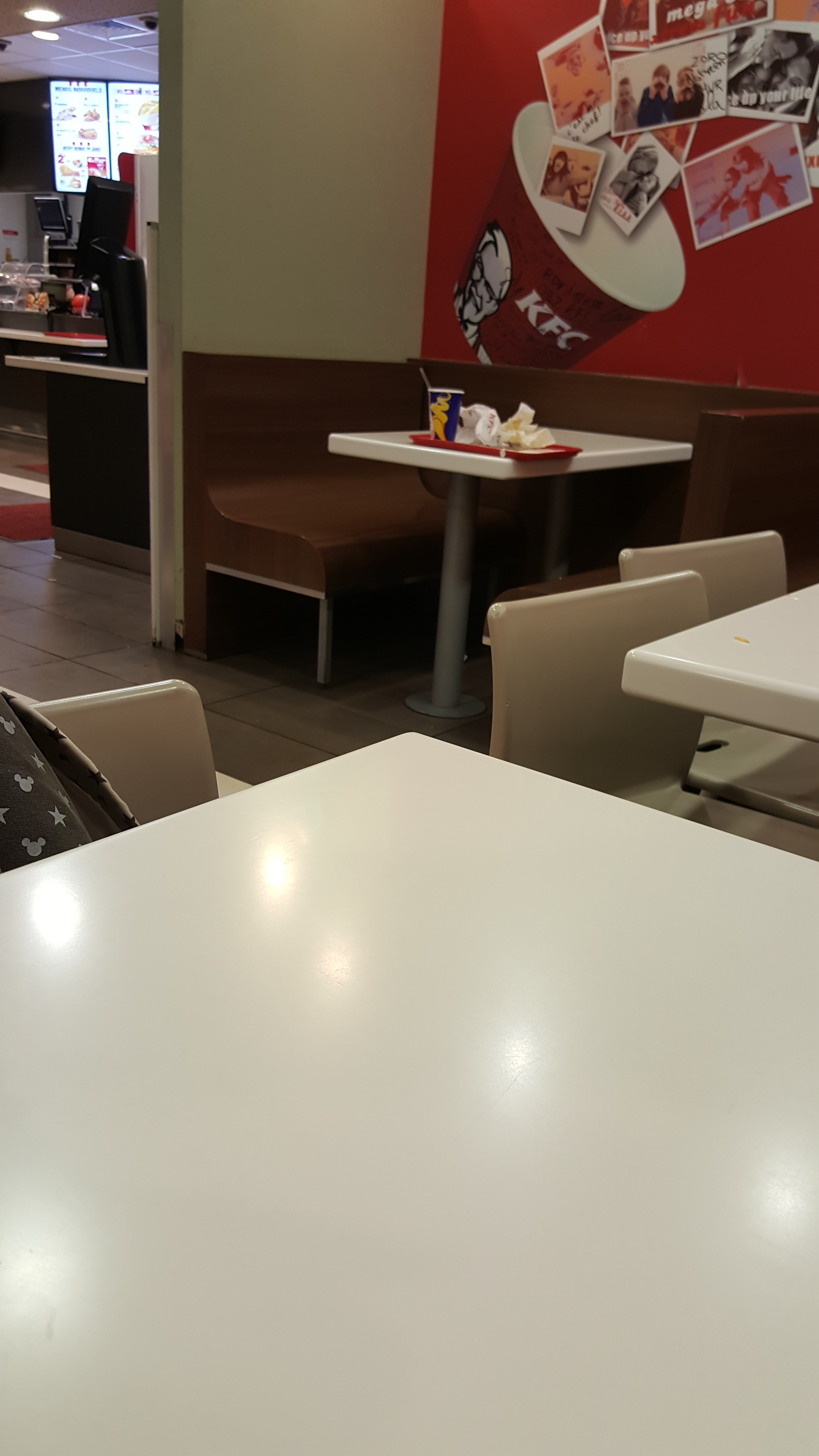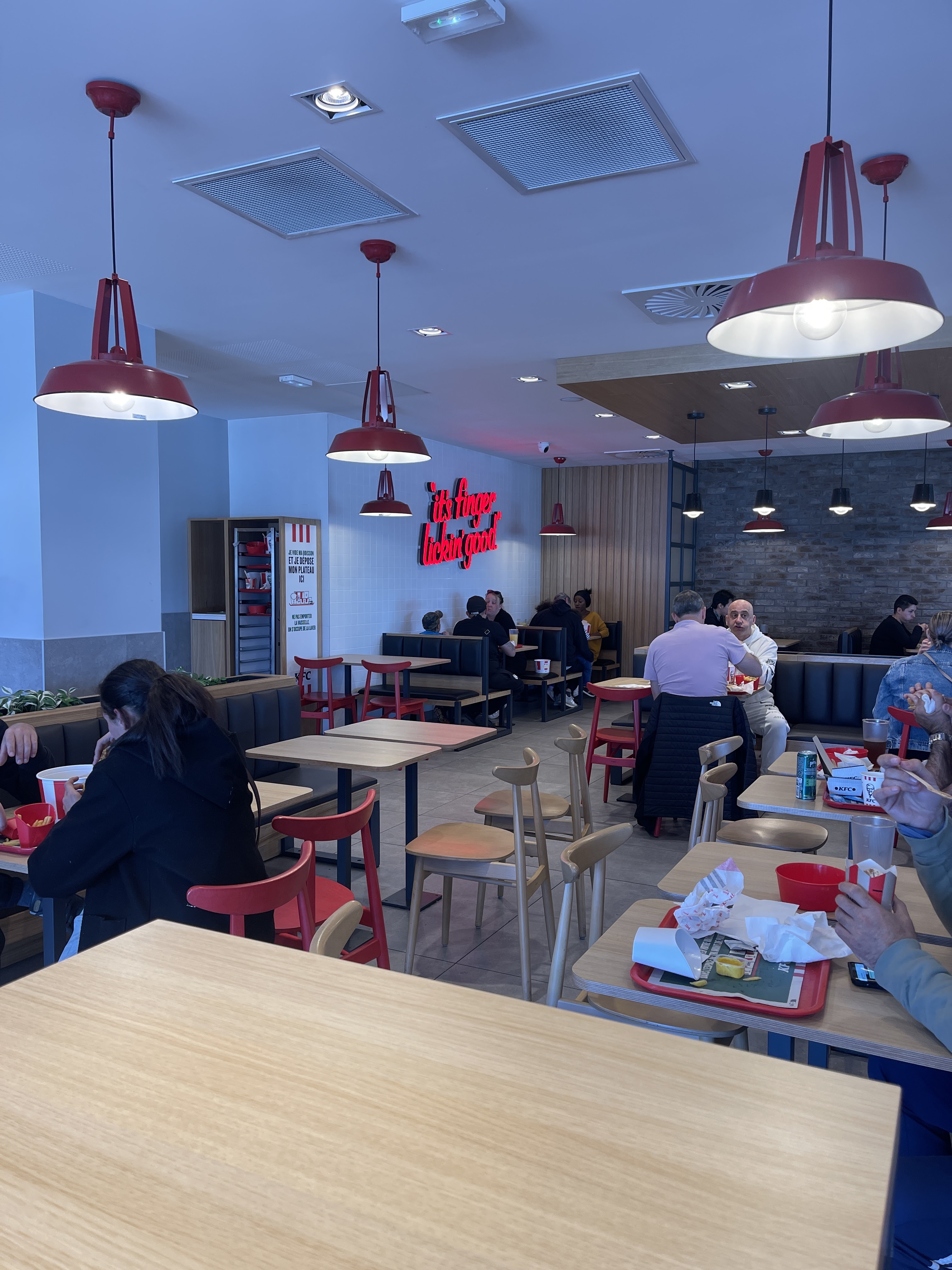 Je pense que ce type de restauration plaît à une tranche d'âge de façon systématique, celui qui aime la viande blanche frite plus encore. C'est assez bon, l'accueil est inexistant, encore plus aujourd'hui avec les bornes de commandes qui enléve d'avantage la convivialité que nous recherchons en vain dans une société de plus en plus égoïste et indifférente. Bref, nous n'étions pas là pour faire ripaille simplement nous sustenter. Ce KFC par contre mérite véritablement un bon coup de nettoyage, les chaises étaient dans un état déplorables , une demoiselle nettoyée inlassablement les tables et balayant le sol en oubliant les chaises. des travaux dans sa totalité également serait important, peintures et changements de mobiliers.
