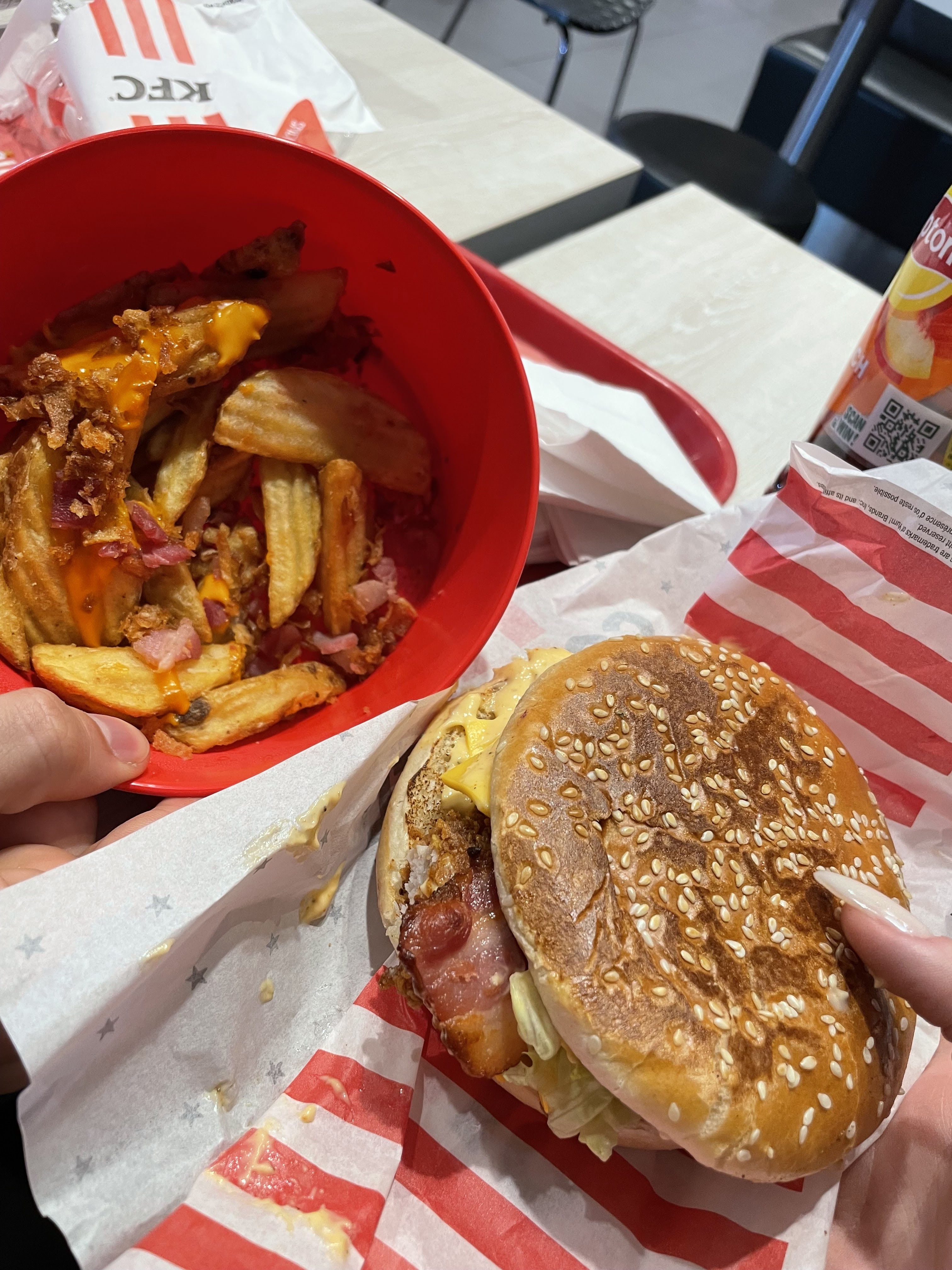 Petite visite chez KFC Mondelange... Et je pense que ce sera la dernière... Commande reçue assez vite... Après un dimanche entre midi, il y avait personne. Commande reçue...x3 mais même pas chaudes, que dire de la garnison... Le fromage en tranche même pas fondu.... Jamais vu cela.... Que dire du pain sorti du congel sans être chauffé.... La boîte de frite reçue avec cheddar et bacon.... Encore pire.... Bacon carbonisé et cheddar toujours pas fondu.... Première et dernière fois pour nous. Je ne recommande pas du tout ...