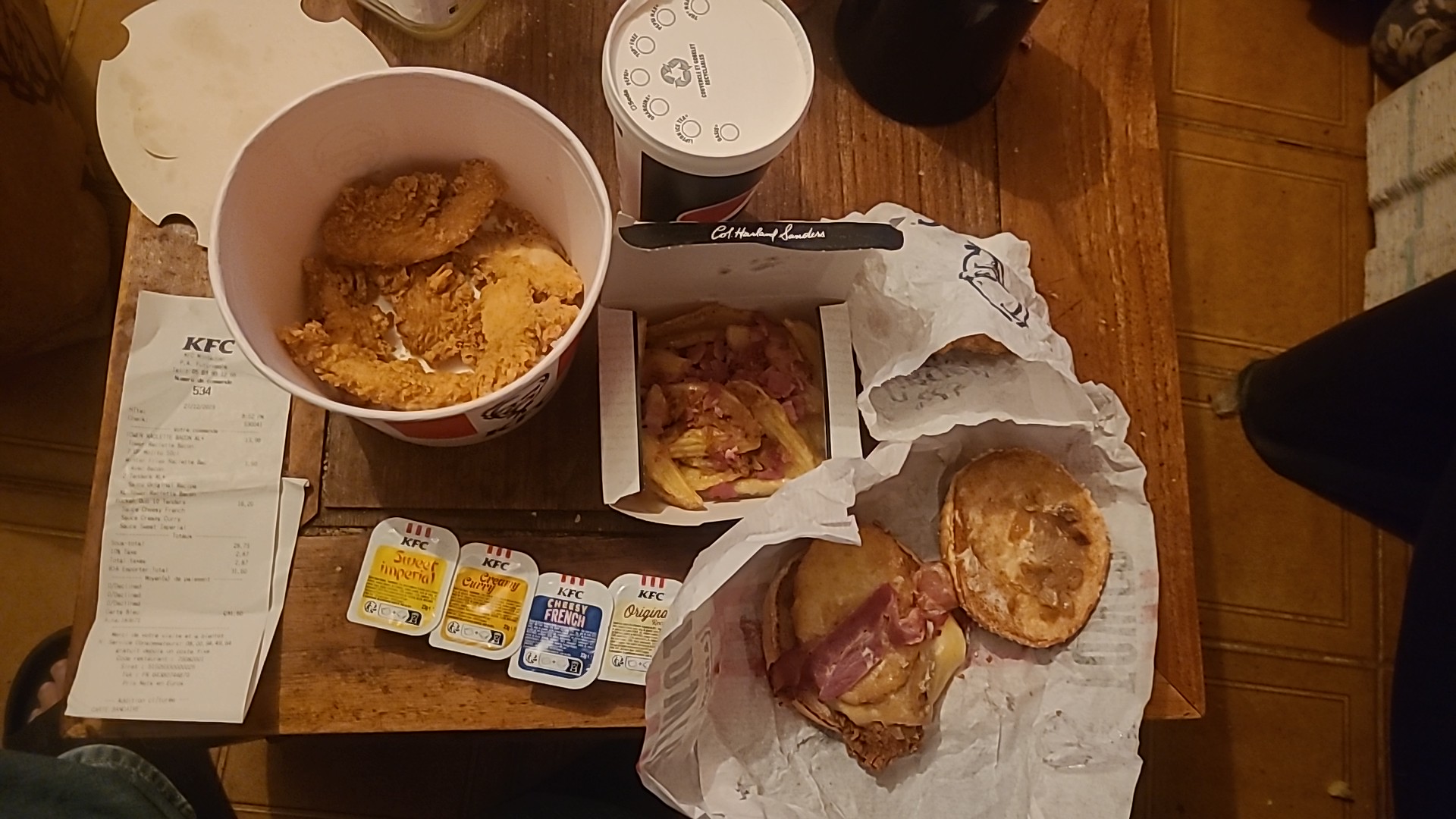 Commande à presque 60 euros à la borne, pas grand monde dans le magasin arrivés à la maison 2 sandwichs manquants et une boisson qui n'est pas la bonne... je suis une grande adepte de KFC mais pour le coup très déçue...