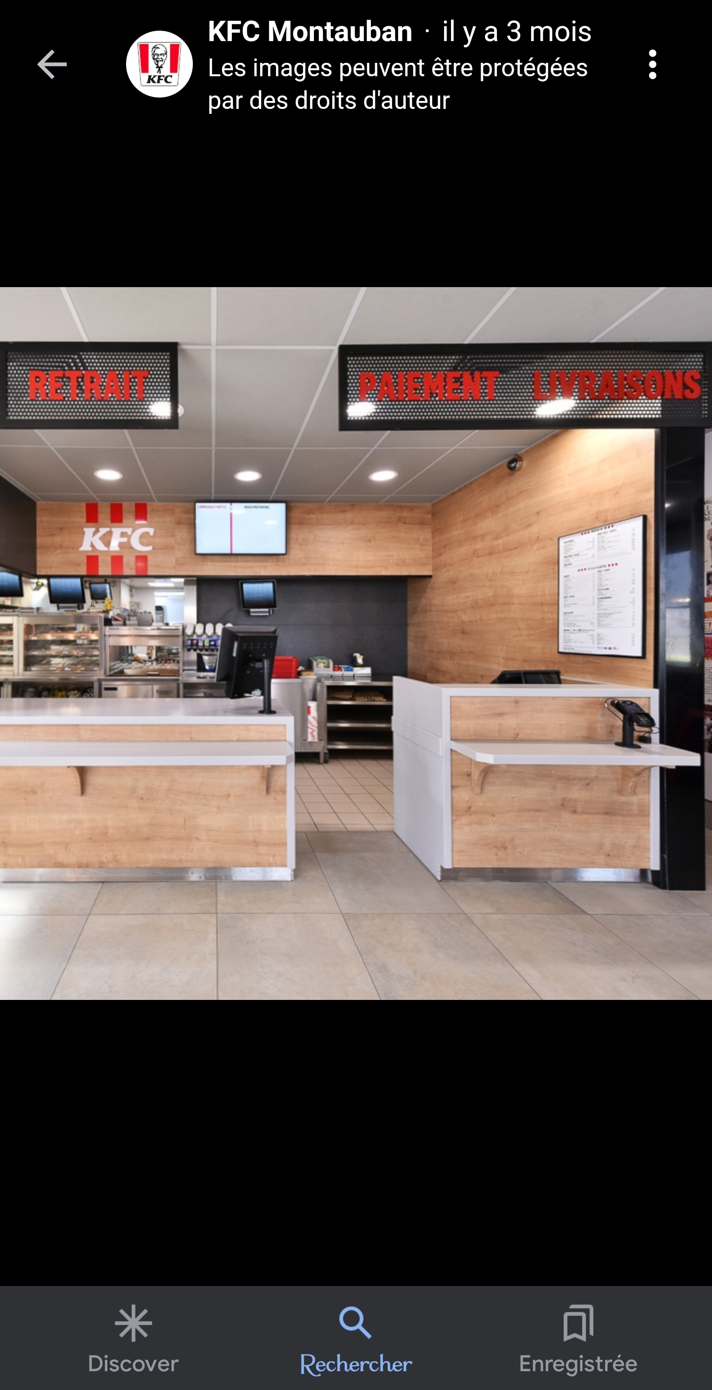 Le service ainsi que l'ambiance rien a dire , ce n'est pas contre le KFC de Montauban que j'en est , mais plutôt contre la marque KFC qui pour moi est vraiment pas bonne je ne retrouve pas un bon goût de poulet alors que ces censée être leur marque de fabrique. Désoler mais je préfère largement le chicken louisiane de chez BK. Les prix de KFC sont trop cher pour ce que c'est.