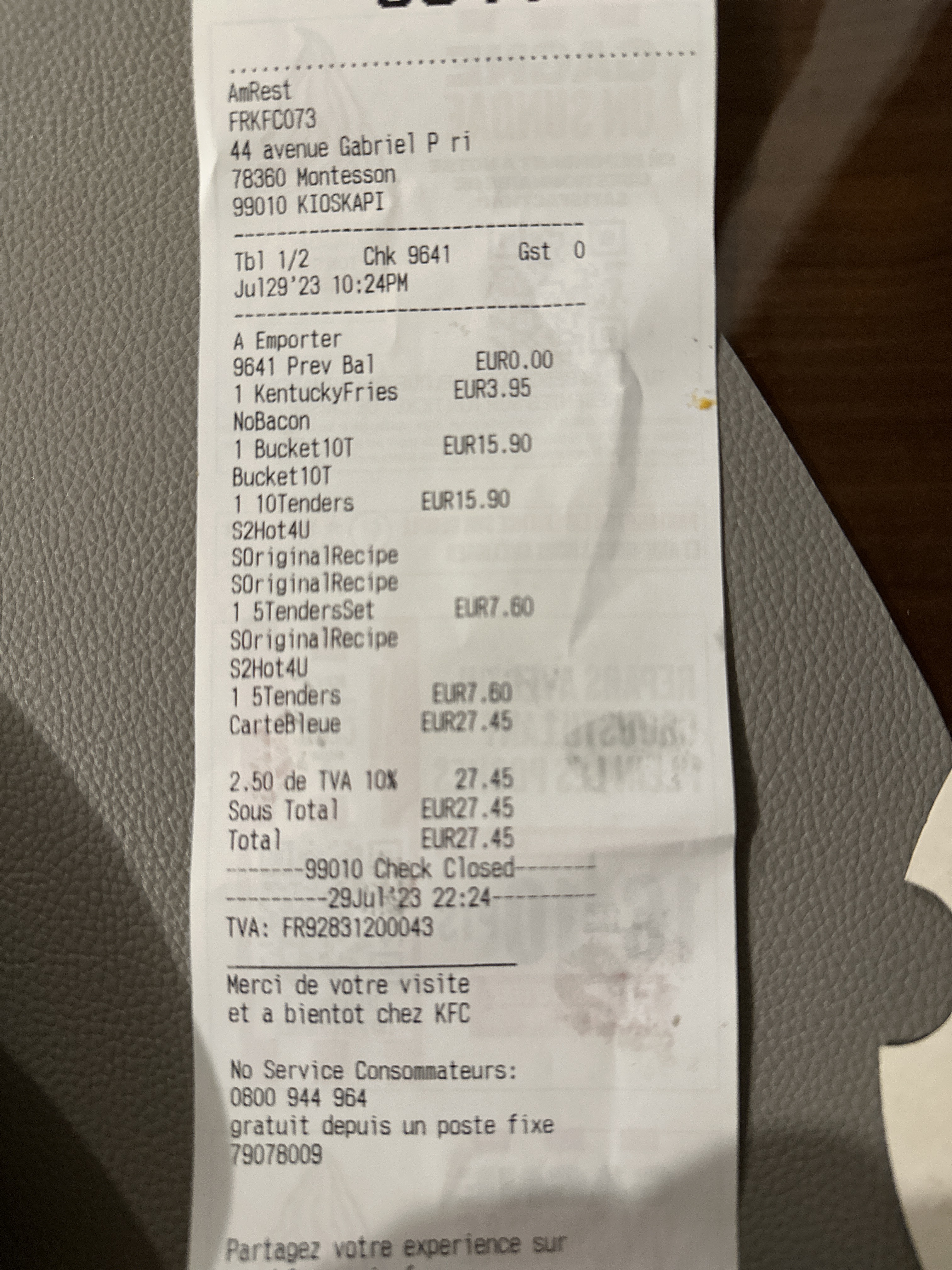 Bonjour, Je vais résumer car j'ai pas envie de perdre plus de temps suite à votre service pourri. Commande à emporter ce jour à 14h36 (9233) 1 bucket 2 personnes 2 boxmasters Pas trop dur ? et pourtant après 30 min d'attente, etla gentillesse de m'avoir offert 6 tenders pour l'attente. Eh bien il manquait un boxmaster (bien entendu je m'en suis rendu compte revenu chez moi après 30min de voiture) Du coup 8,70€ pour 6 tenders ça revient cher... Apparemment je suis pas le seul a avoir un avis négatif sur votre établissement, reprenez vous en main, ou changez de métier parce que là c'est juste pas possible. Du coup plus jamais j'irais au kfc montesson, merci de m'avoir ouvert les yeux Cordialement, M. Lemarcis