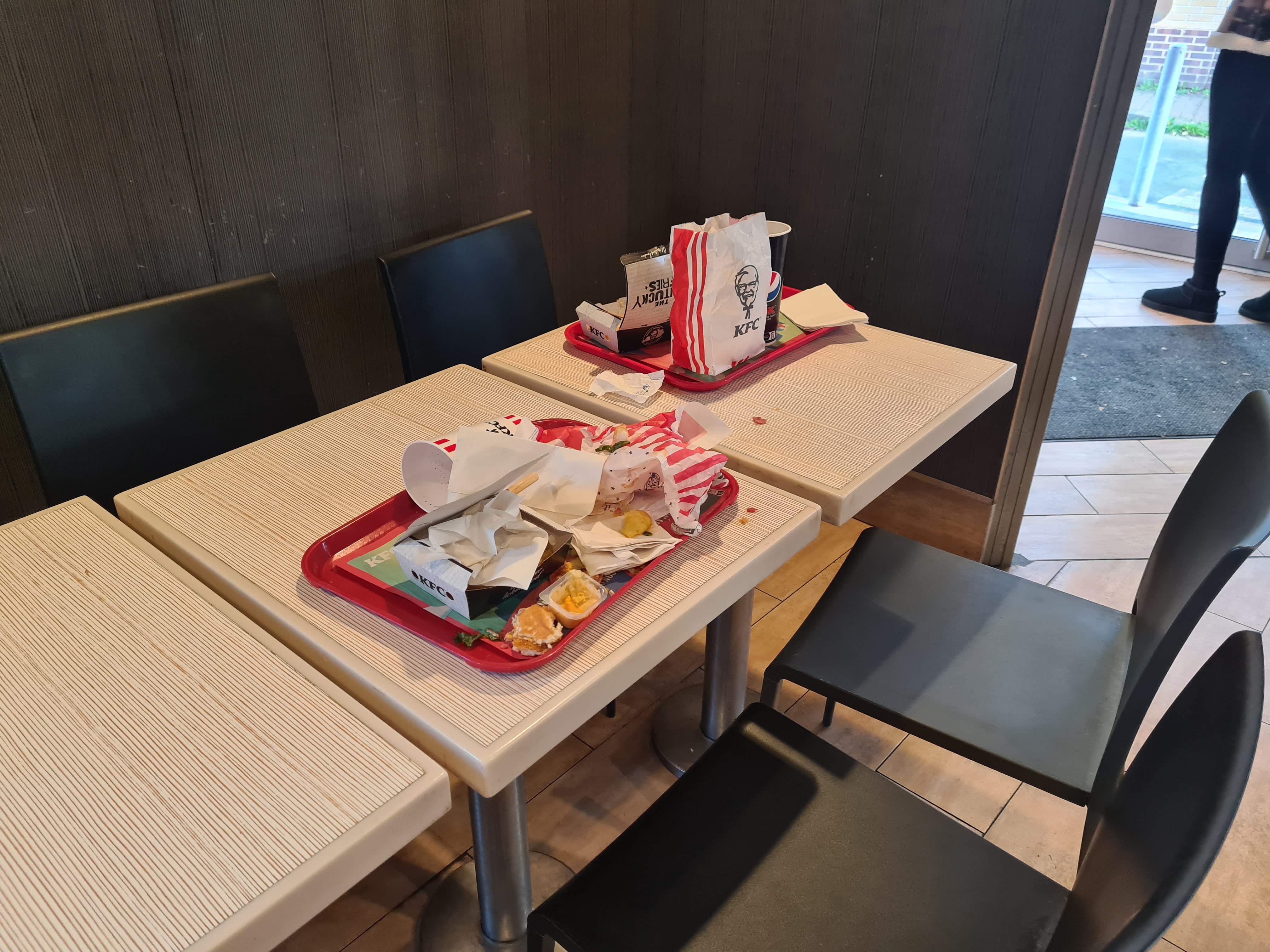 Très sale. Si la salle est à l'effigie de la cuisine ... ça fais 5 fois que nous venons et à chaque fois c'est sale le sol les poubelles les tables les chaises ... clairement on reviendra pas. Et les sandwich sont froid les frittes il y a pas beaucoup de fromage dessus les boissons on dirais de l'eau 1 fois sur 2 ... KFC svp réveillez vous j'adore votre poulet mais là vous abusez.