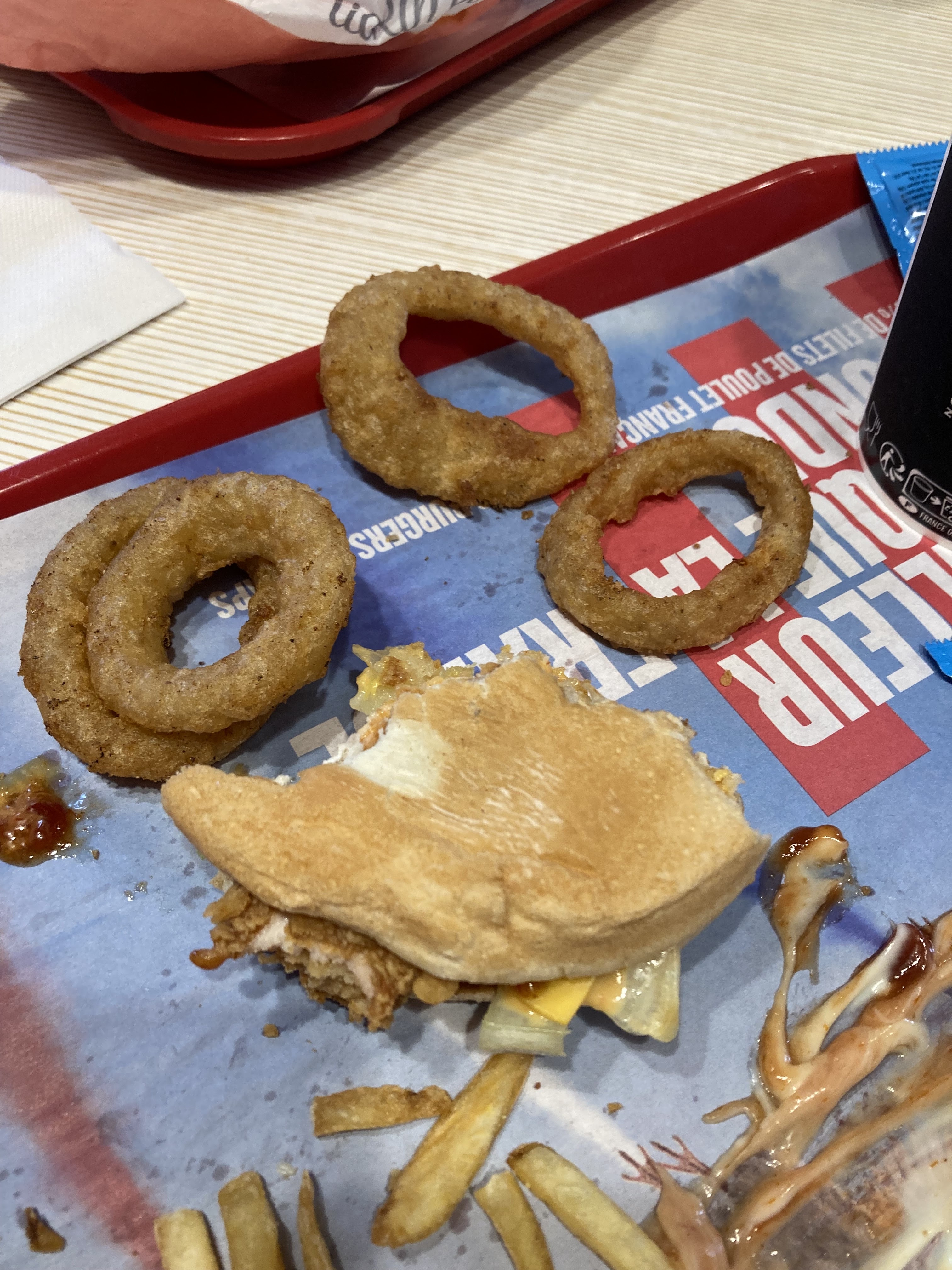 Dommage. Nous sommes venus à 22h00/22h15 nous restaurer à ce KFC ce lundi 22/08. Visiblement, c'était une mauvaise heure où y aller. Sur google, il est marqué que le restaurant est ouvert jusqu'à 23h. Toutefois, arrivé à 22h, nous trouvons une salle fermée par des chaises sans aucune indication. C'est en voyant une voiture s'infiltrer dans le drive au moment de repartir pour la concurrence, que nous avons compris après 5min que c'était ouvert qu'à emporter. Ce n'est pas grave mais cela porte à confusion. Nous commandons un menu tower spicy avec frites cheddar bacon et un menu kentuchy. Tout ceci accompagné avec une portion d'onions rings par 10x. Nous attendons un quart d'heure, ce qui est compréhensible puisque c'était l'heure de close malgré l'absence d'affluence. Toutefois, ce qui ne l'est pas, c'est de servir au client des produits froids qui dataient probablement d'un moment. En effet, le poulet des burgers ressemblaient à du caoutchouc sous la dent, la panure était molle. Les onion rings étaient par moment huileux et mous et d'autres étaient durs comme du bois ! Sur les 9 (il en manquait 1 lol), 4 étaient mangeables. De plus, les frites cheddar bacon n'avaient rien de frais, le cheddar avait pris une couleur orange et était durci. Et tous ces problèmes ne se justifient pas par le fait que c'est à emporter: il n'y a que 5min de trajet. Note à moi-même: j'aurais du faire attention si c'était bien chaud au lieu de céder à l'inadvertance de la fatigue. Si je l'avais vu avant d'arriver chez moi, je les aurais fait changer, mais cela ne mérite pas un nouvel aller/retour. Il n'y a rien de plus énervant que des onion rings dépourvus de leurs qualités: croustillants et bien chauds. C'est ce qui me pousse à rédiger cet avis. La facture est salée, 26€ de produits que l'on a eu l'obligeance de manger par respect. Mais ce qui est sûr, c'est qu'on ne reviendra probablement pas de sitôt. En bref, nous déconseillons aux personnes qui souhaitent satisfaire leur faim durant les heures creuses de s'adresser à ce restaurant rapide au risque de manger des invendus froids des rushs.