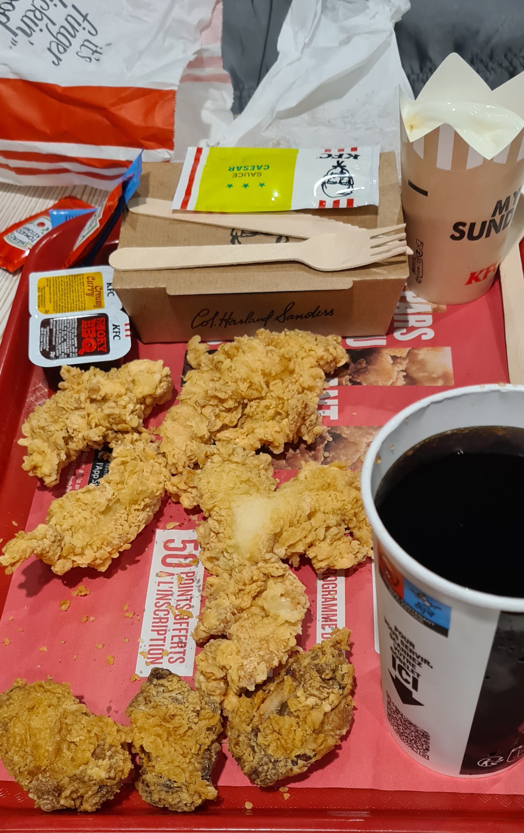 J’ai commandé sur une application connu et une fois a table je me rend compte que j’avais que la moitié de la commande. Je me déplace au KFC qui m’expliquent que les livreurs se trompent suivant et que normalement je devais passer par l’application mais que c'était pas à moi de payer pour les fautes des autres et il me propose de refaire la commande complète avec des extras. Il a vraiment était pro le Menager . Merci à eux