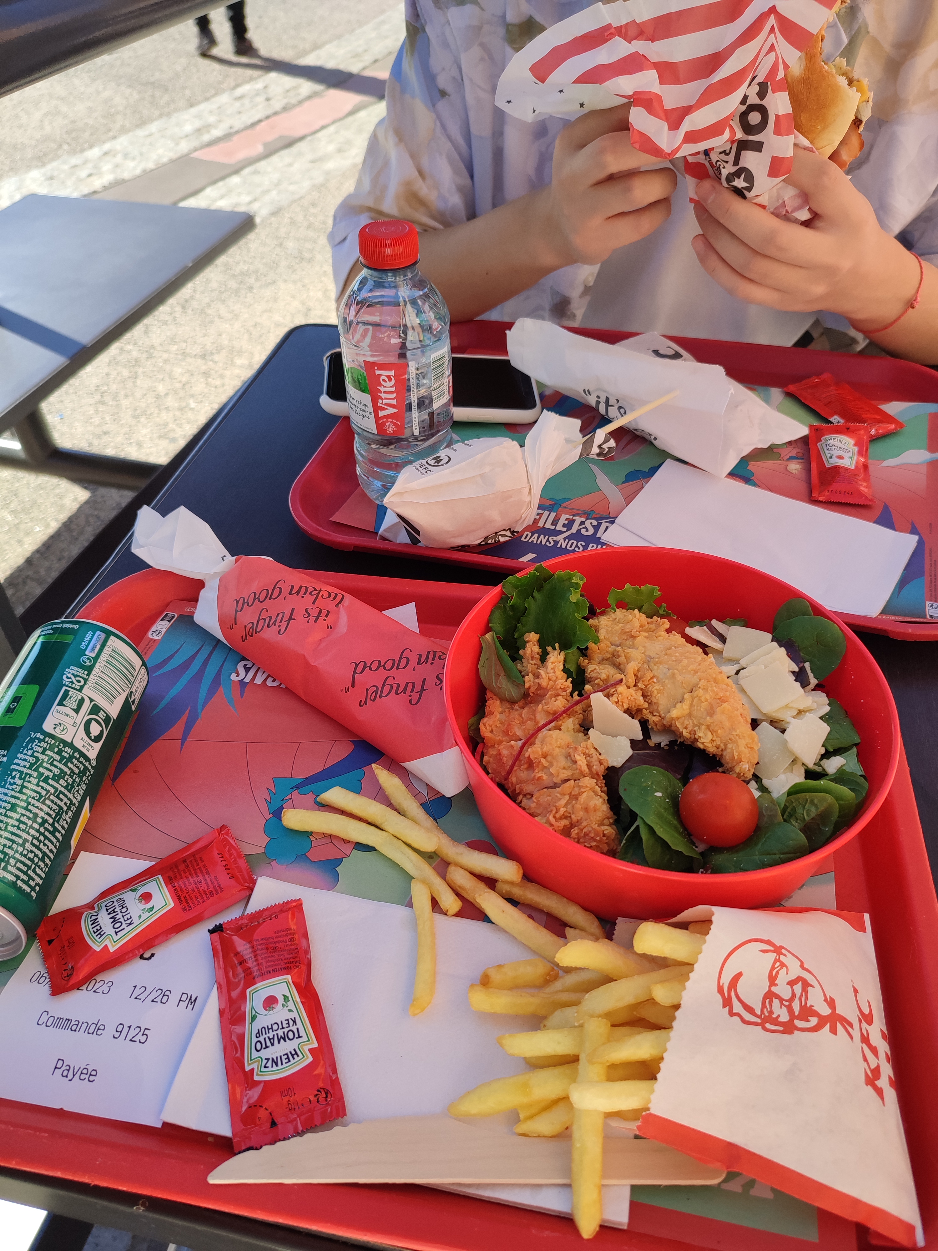 Je suis aller au kfc le samedi 3 février 2024. J’ai commander à emporter Hot dog . Le classique est le bacon cheese. Après avoir attendu 15 minute pour juste 2 hot dog - 1 portion de frite - 1 boisson Ceci était déjà très décevant.. Après avoir ouvert ma commande. J’ai reçue la moitié de la boisson.. Au lieu de 40 Cl j’ai eu 20 cl. Les 2 hot dog était super sec. Les frite avait pas de goût. On sentait même pas la sauce dans les hot dog! Super décevant… Je suis la commande 9123