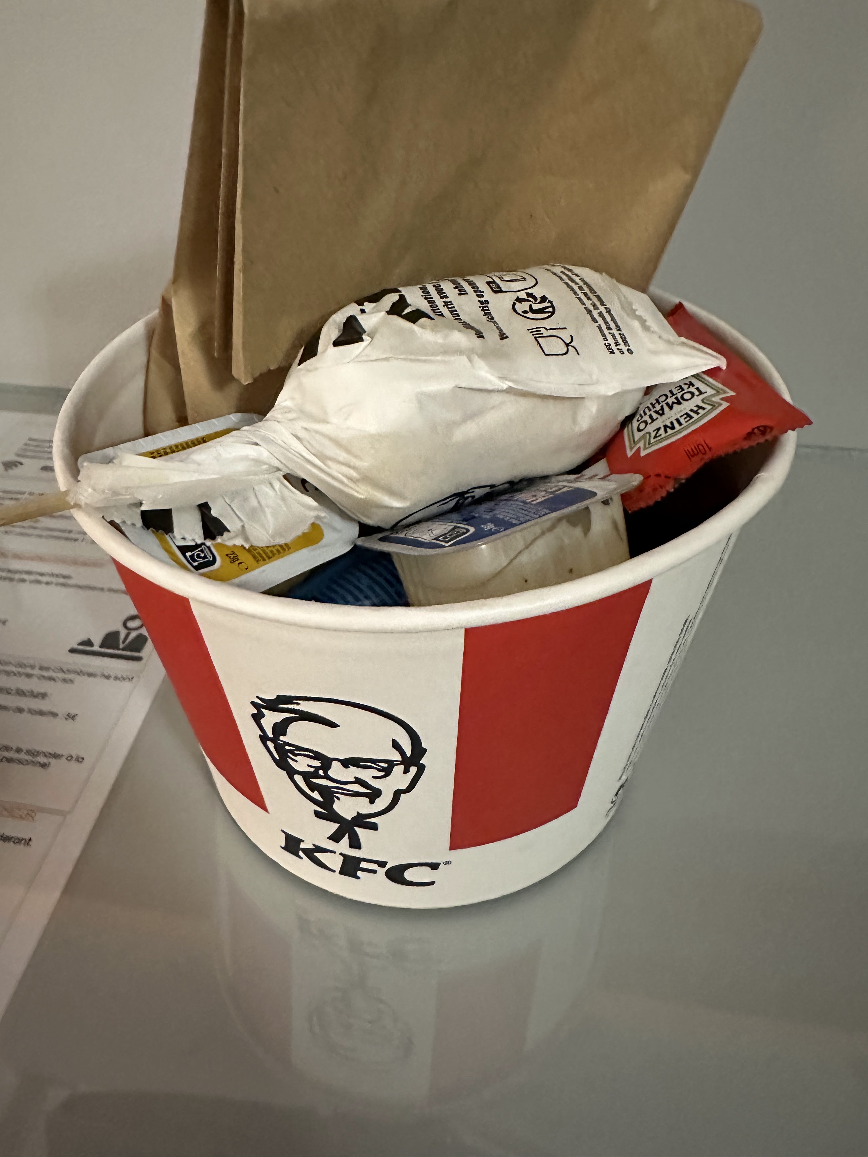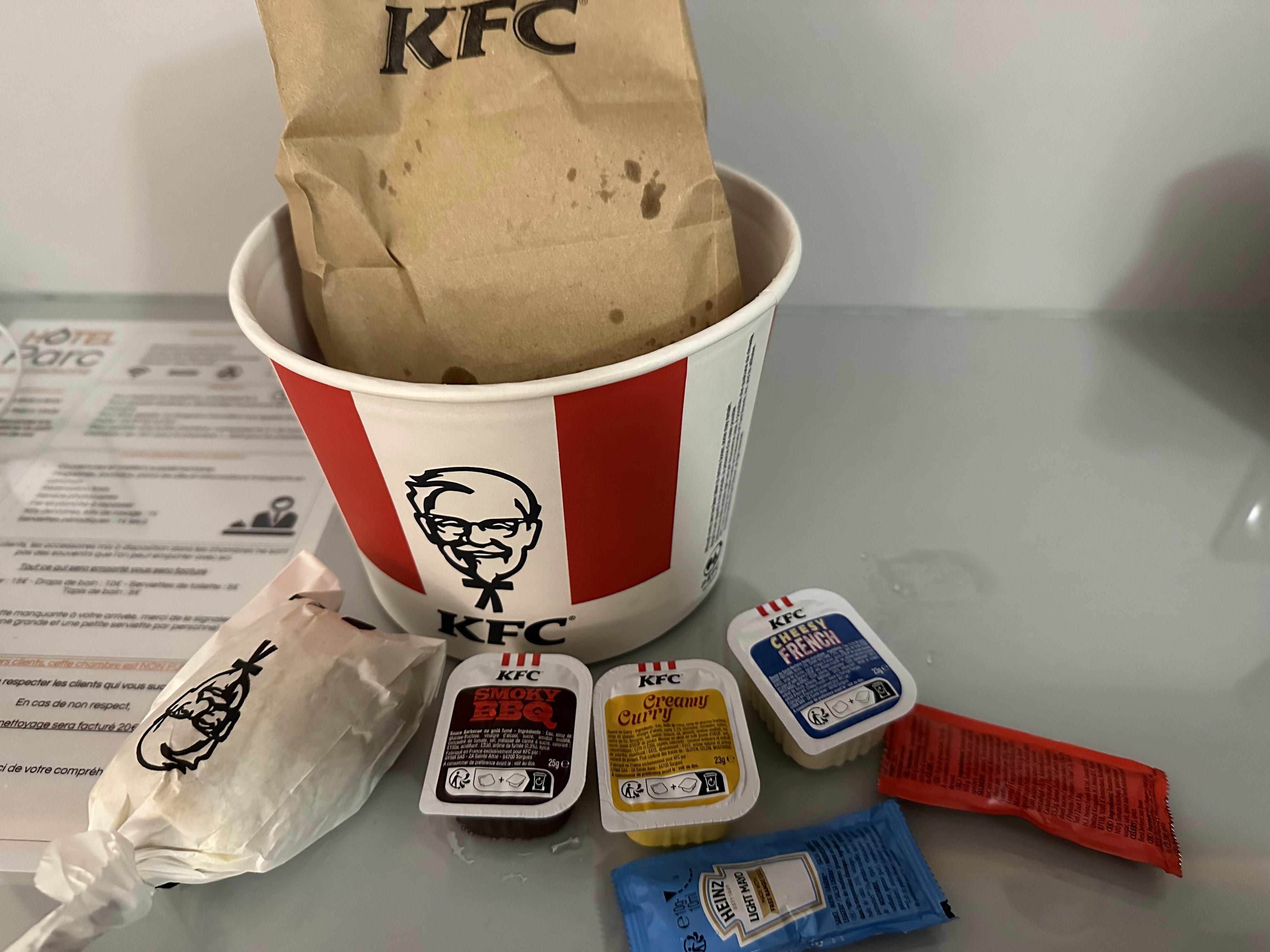 Fast food de proximité à 2 pas de chez moi qui servent du poulet cuit et recuit au goût cartonné, c'est déjà arrivé plusieurs fois que ma commande finisse à la poubelle plutôt que dans mon estomac... dommage car j'aime vraiment l'enseigne au point d'y dépenser très généreusement de l'argent chaque semaine, mais là les tenders plus fines que des aiguillettes et servies recuites c'est juste impossible et c'est pas la faute à la guerre en Ukraine...