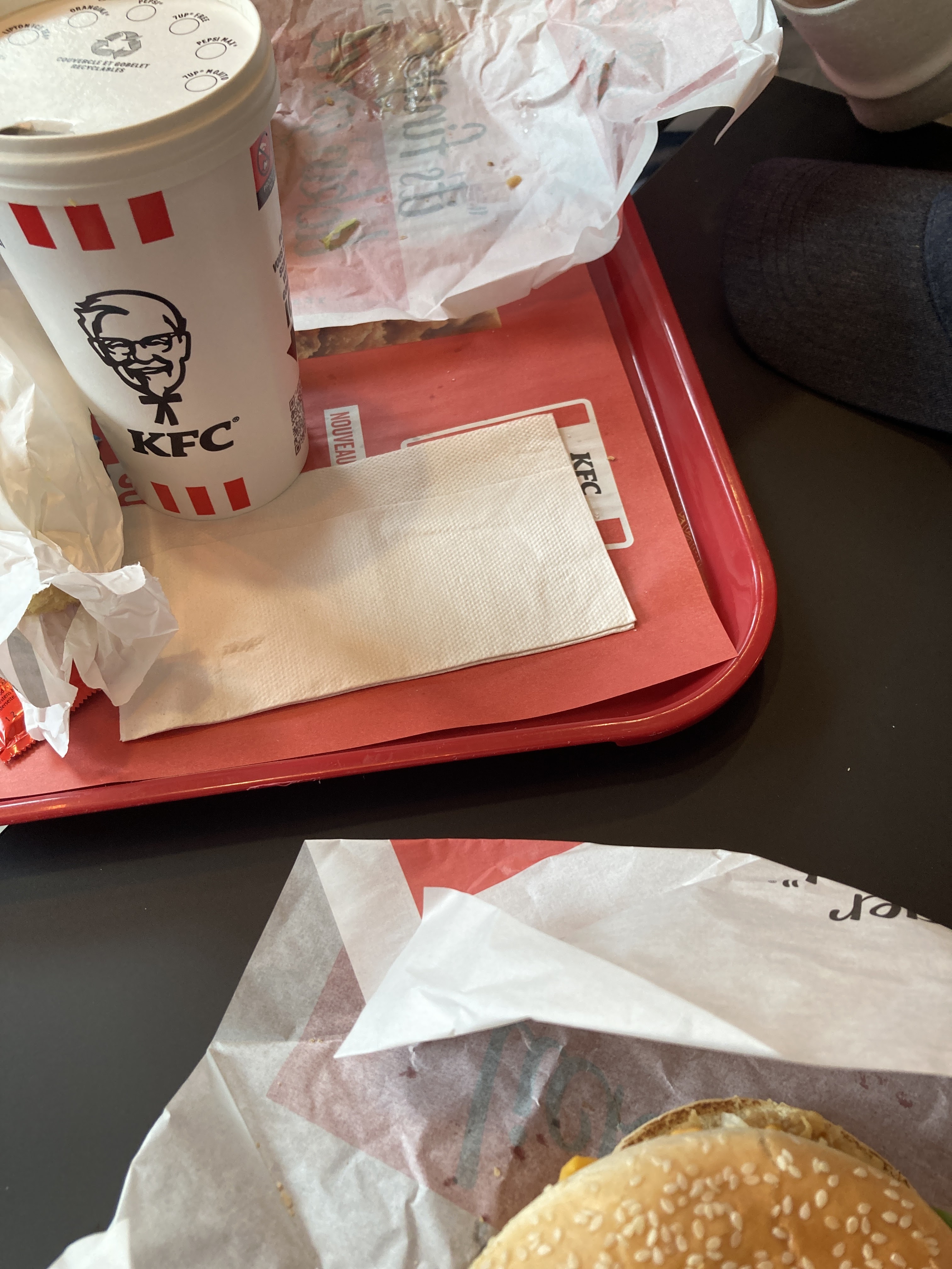 - les toilettes ne sont plus à disposition de la clientèle, « parce que les clients les prenaient pour des toilettes publiques » vous allez donc dans un restaurant dans lequel vous devez manger avec les mains, puis vous n’avez pas la possibilité de les laver - aucun de nous 4 n’a reçu de serviettes en papier avec sa commande - impossible de prendre de l’eau avec un menu, ce n’est pas même disponible parmi les choix : soda ou rien - j’ai voulu prendre commande au guichet, l’employé m’envoie sur une machine parce que ça l’arrange - pas possible de prendre du cheddar sur les frites un samedi soir, rupture de stock Nous ne reviendrons pas, et sommes curieux de savoir comment cet établissement peut être noté 4,4 étoiles avec 1200 avis si ce n’est en ayant fait appel à des robots. L’expérience que nous avons eu n’est pas digne d’une franchise KFC, rien à voir avec celui de Morshwiller-le-bas. Bien à vous, Mr. RITTER
