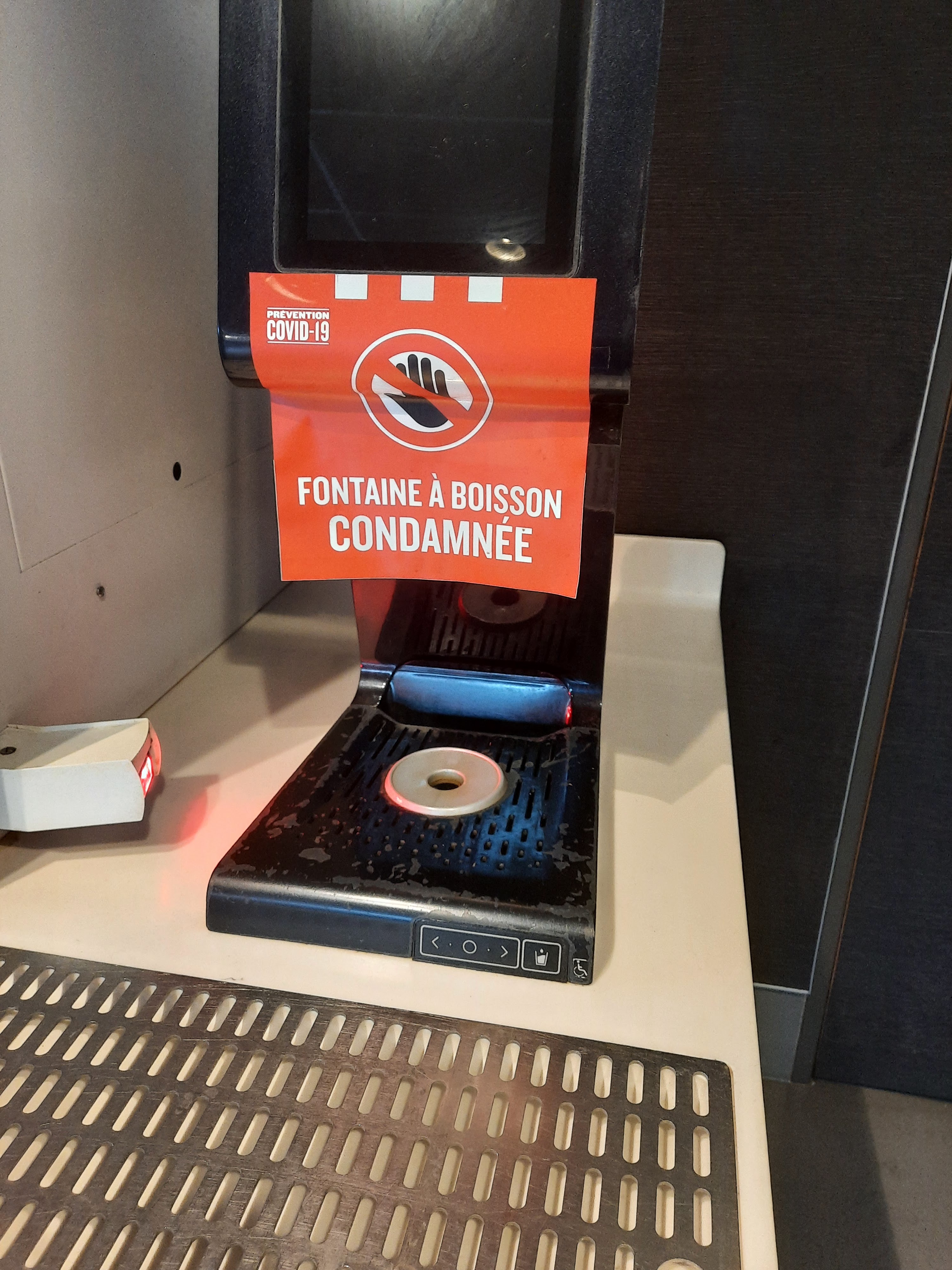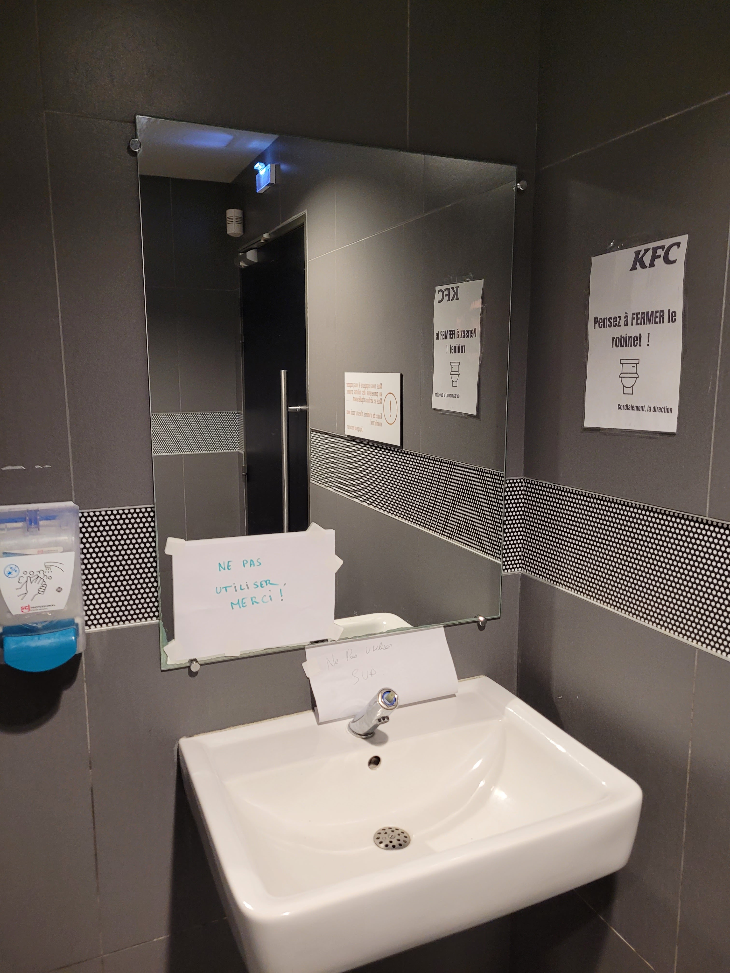 Bornes qui fonctionnent pas, erreur sur commande plusieurs fois, et l état des lieux 🤮 que ce soit au comptoir ou dans les toilettes 🚻 inadmissible ! Ha oui !!! et même pas de gel hydro