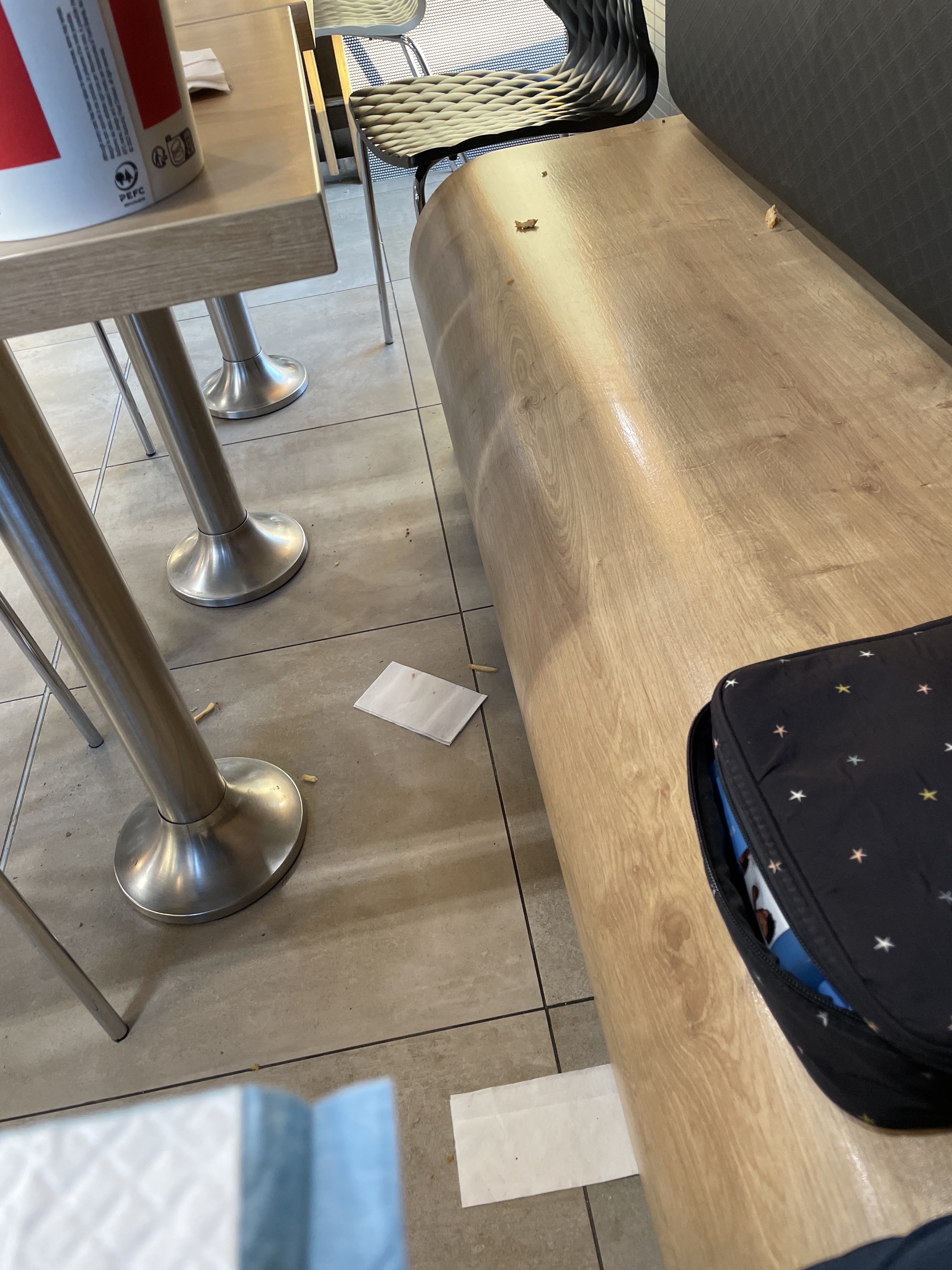 C'est la premiere fois que je vois un kfc aussi sale toutes les table sont sale le sol aussi de la nourriture par terre et sur les tables ont a demander si c'etait possible d'en nettoyer un soupire et personne n'est venu finalement ont l'a fait nous meme pencarte sol glissant qui reste au sol au lieu de nettoyer.