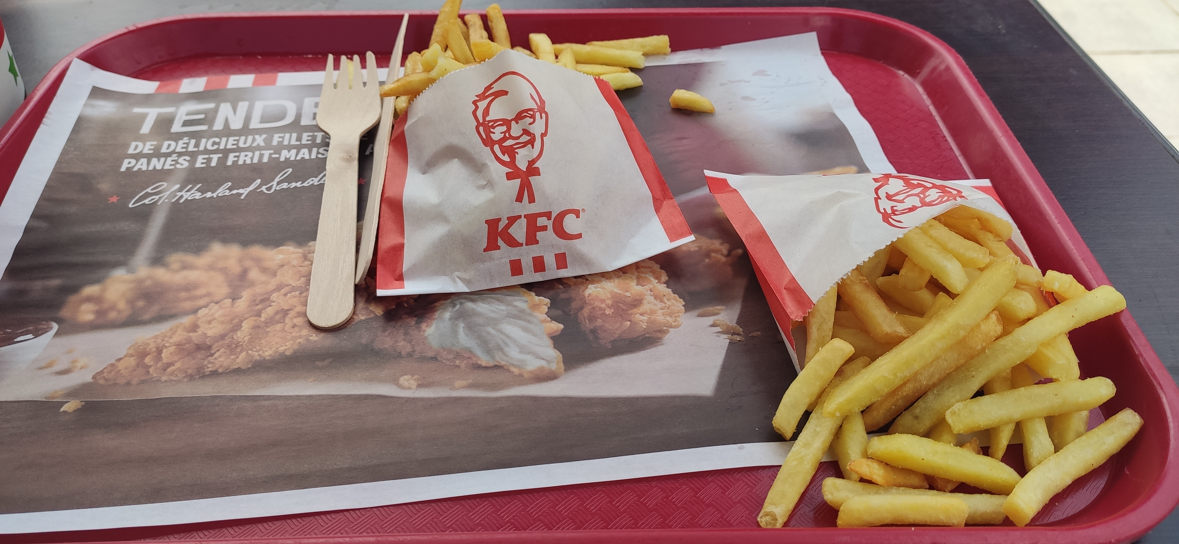 Profondément déçu. Personnel à l'interphone pas aimable. On demande 2 menus pour un total de 20 euros. Il est 15h un dimanche (donc affluence faible) Cela faisait 5 ans au moins que je n'avais pas mis les pieds chez KFC. Me voilà vacciné à tout jamais. Un menu boxmaster avec frites taille normale Le boxmaster (cf photo) est ridiculement petit, vide ou presque et quasiment froid. Quant aux frites il s'agit d'une microportion. Digne d'un menu enfant d'autres fast food. Pas de demande pour les sauces, normal il n'y en a pas. Pas de proposition d'alternative lorsqu'on demande un sprite la réponse on n'en a pas alors il faut insister et demander une alternative pour obtenir un 7up. Idem concernant le détail sur les Kentucky fries. Si on ne demande pas on ne sait pas ce que c'est. Ni que c'est en supplément. En bref passez votre chemin. Allez dépenser votre argent ailleurs. Vous serez forcément plus satisfaits. Difficile de faire pire me direz vous.