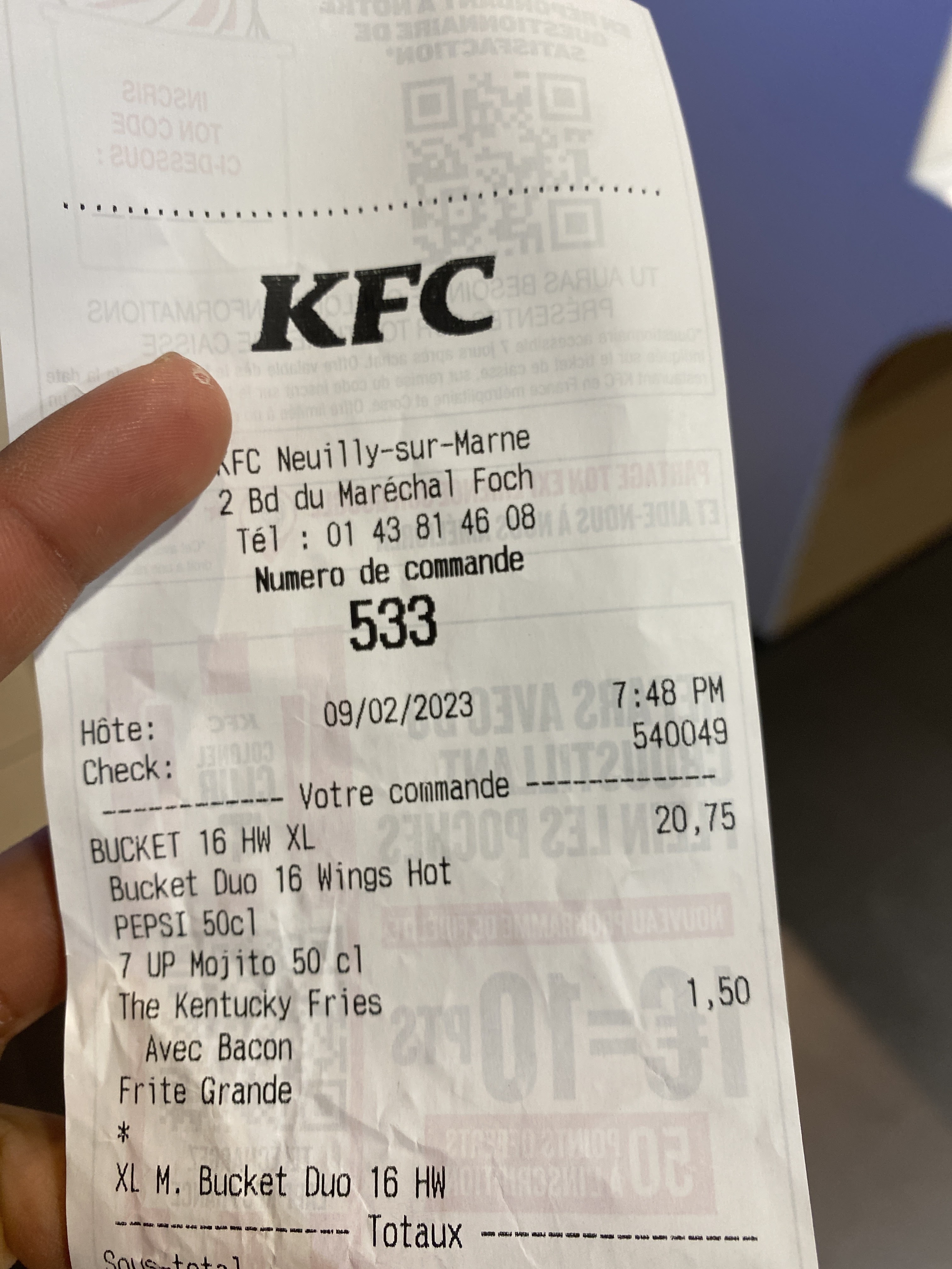 J'ai récemment eu l'occasion de tester le restaurant KFC et je souhaite partager mon expérience. J'avais beaucoup entendu parler de leurs tenders et, pour de la restauration rapide, on m'avait dit que c'était plutôt correct. Nous nous sommes arrêtés au KFC de Neuilly-sur-Marne. Étant donné que nous étions 3, nous avons opté pour le bucket de 20 tenders, une formule prévue pour 4 personnes au prix de 32,95 €. Ma femme a décidé de prendre des frites. Malheureusement, ce n'est pas leur point fort et je ne m'étendrai pas davantage sur le sujet. Quant à moi, j'ai choisi une cobette, qui correspond à un demi-épi de maïs. J'ai eu l'impression d'en avoir plutôt un quart, mais j'ai tout de même apprécié cette option. En ce qui concerne les accompagnements inclus dans notre formule, nous avions droit à 4 choix parmi les suivants : frites, cobette, petite salade, ainsi que 6 sauces disponibles (curry, original, impérial, 2Hot4You ou barbecue). De plus, nous avions la possibilité de choisir 4 boissons ou une bouteille. En ce qui concerne le service, nous sommes arrivés après 13h et il n'y avait pas d'attente. Notre commande nous a été livrée assez rapidement.