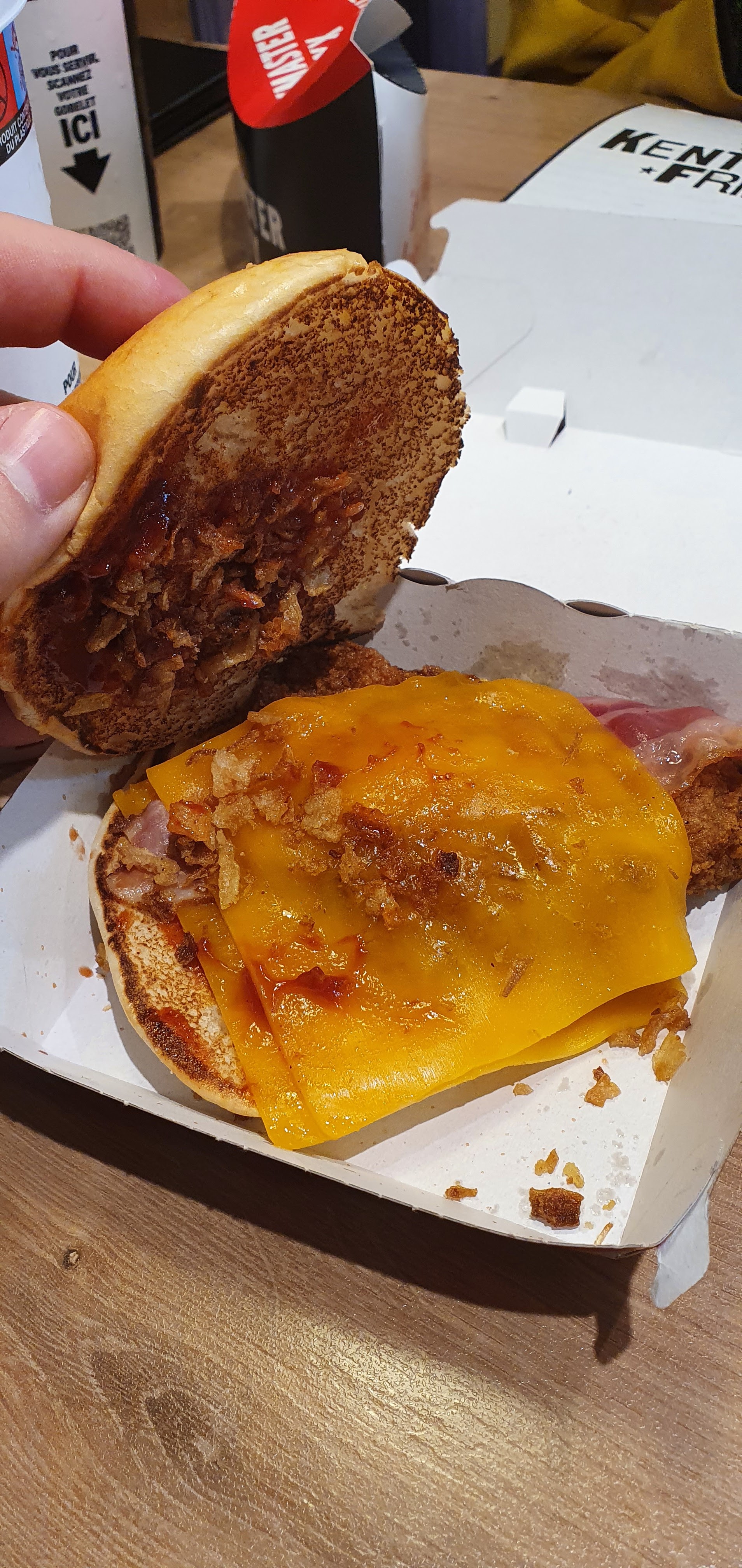 Arrivée au drive. J’étais seul, grosse attente avant que quelqu’un un prenne ma commande. Je demande gentiment à cette personne d’être vigilant à la température du repas car j’ai eu plusieurs mauvaises expériences consécutives au même endroit, on me répond « nous n’avons pas de toaster c’est normal… » Je vérifie la commande qui est complète ( contrairement à la fois précédente) Un bon point. Je arrivée au domicile je suis voisin et à 3 minutes de route. Les frites froides, tenders froids, Hamburger froid et avec un goût de brûlé. En l’ouvrant, je comprends mieux (cf photo) Merci KFC Neuville en Ferrain de me décevoir à nouveau. Je n’ai pas pour habitude de laisser ce genre de commentaire mais 5 fois de suite ça commence à faire beaucoup.