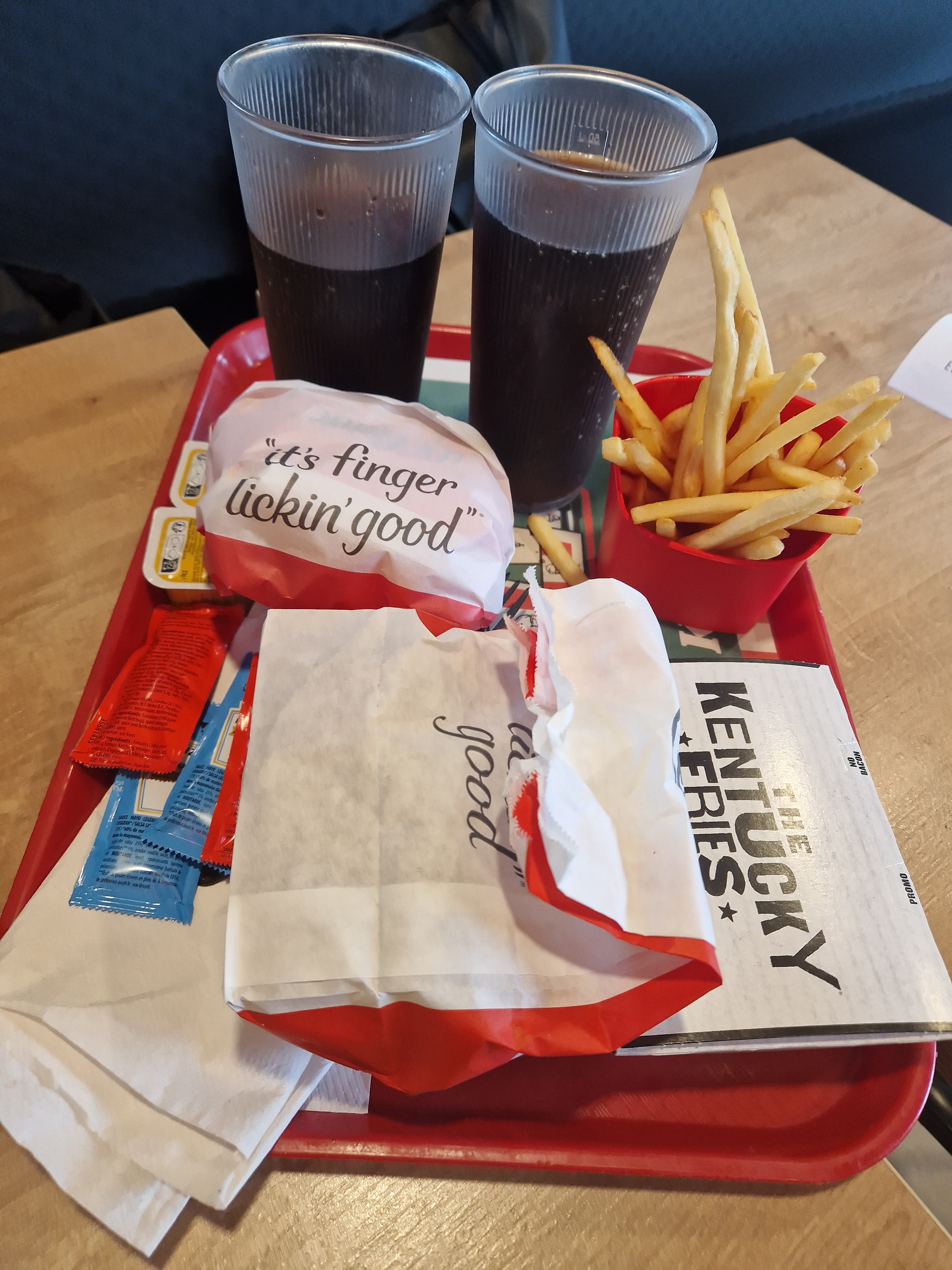 Photos datent du 27 mai dernier. Des Tendres moins gros que les sachets de sauce. Je vais avec mon bucket à la caisse pour me plaindre, réponse : on y peut rien, c est livré comme ça, même pas un geste commercial... belle arnaque ! Et quand je lis les autres commentaires, oui ce resto est trop souvent sale. PS : service client KFC, vu votre réponse, vous êtes lamentable ! Peut on trouver votre cahier des charges quelque part ?