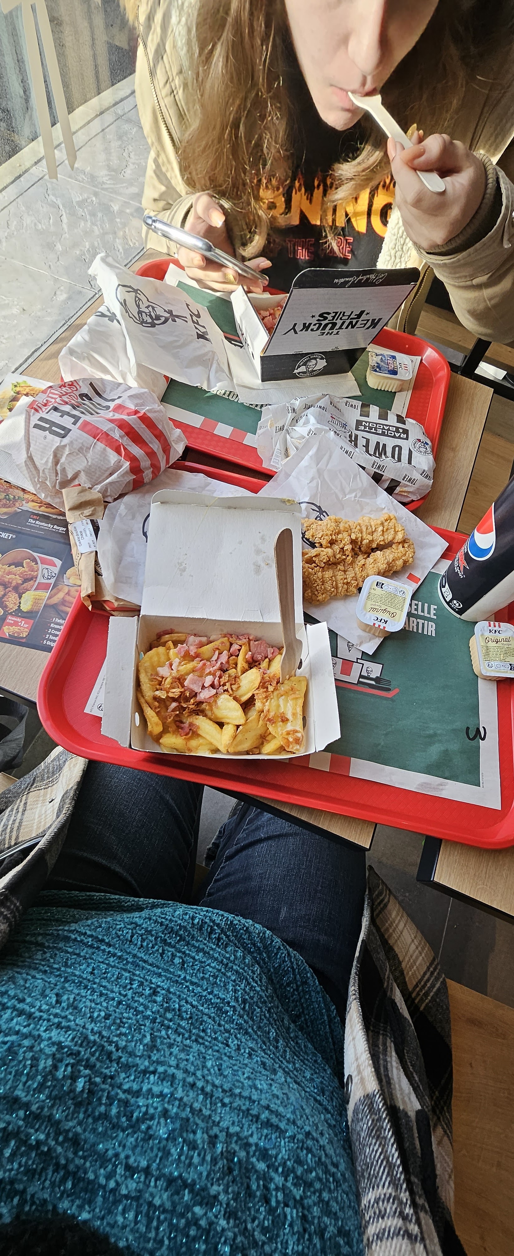 Pour une première fois au kfc je suis un peut entre deux chaise dans l'ensemble c'est bon malgré que le The Kentucky fries était tiède et pas assez fromage dedans le hamburger Tower raclette était super bon niveau ambiance un peut bruyant mais ne gêne pas le repas la glace ultimate délicieuse je trouve vers 18h 20h il a vraiment beaucoup monde mais le temps d'attente est correcte ce qui concerne le parking on ce demande ou rentrer quand on arrive de la route rien est indiqué pour trouver par ou rentrer et les chaises en métal je trouves qu'elle méritait un cousin ou autre car elle font mal au dos
