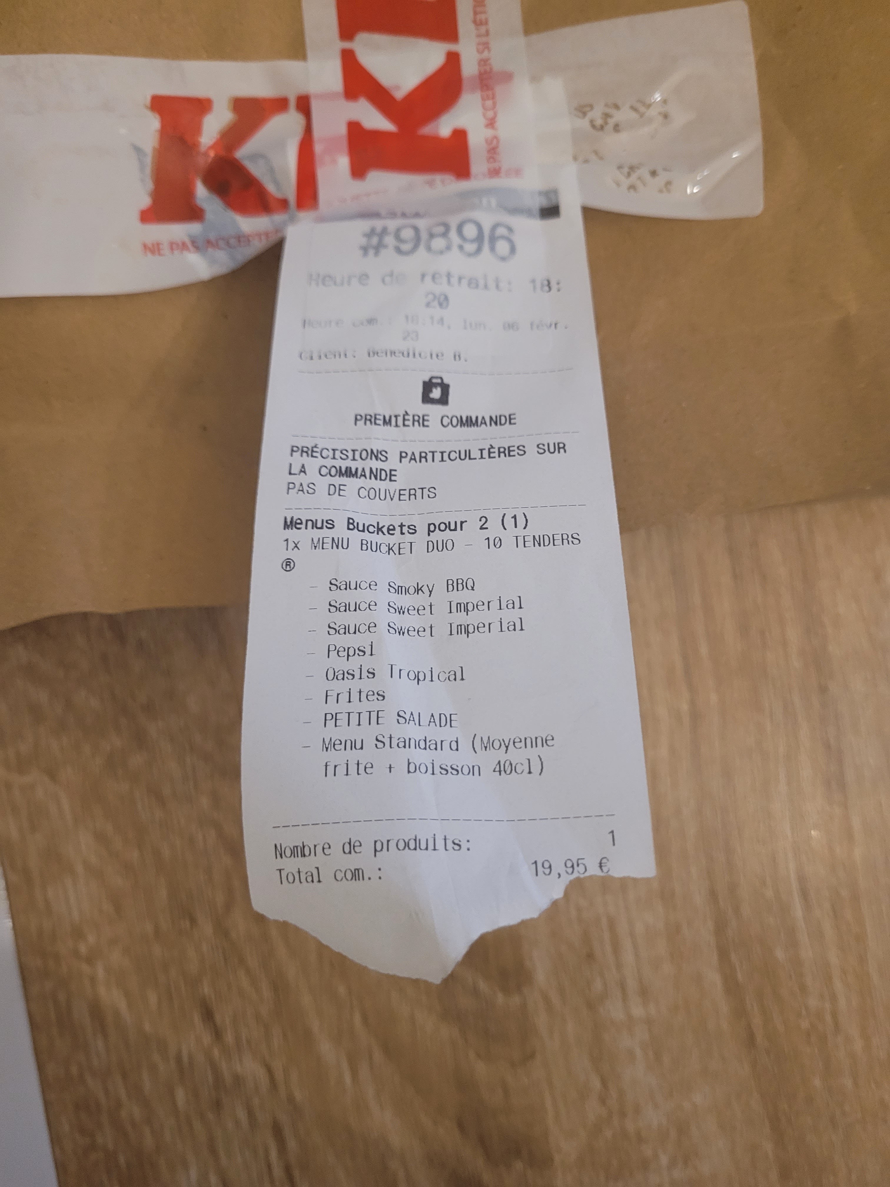 J’ai commander 3 fois avec uber eat. Les 3 fois il manquait quelque chose. Surtout la deuxième fois quand on a fait une grosse commande. La première a été remboursé sans problème par uber eat. La deuxième fois rien alors qu’il manquait un burger des frites et des onions. On devait avoir 3 sacs on a reçu le 1/3 et le 3/3. Il en manquait un. Uber a expliquer qu’il fallait contacter le restaurant et forcément aucune réponse. On a appeler peut être 20 fois. Jamais personne n’a répondu. On mange en horaire décaler à cause du boulot (entre 15h et 17h). J’aurai compris que personne ne réponde a 12h etc mais là… Ce soir ma collègue a proposer de retenter KFC..résultat va arrive froid. La commande est arrivée en retard forcément … bref je ne commanderai plus chez eux. C’est dommage on aimait beaucoup KFC mais commander 3 fois et être déçu 3 fois …