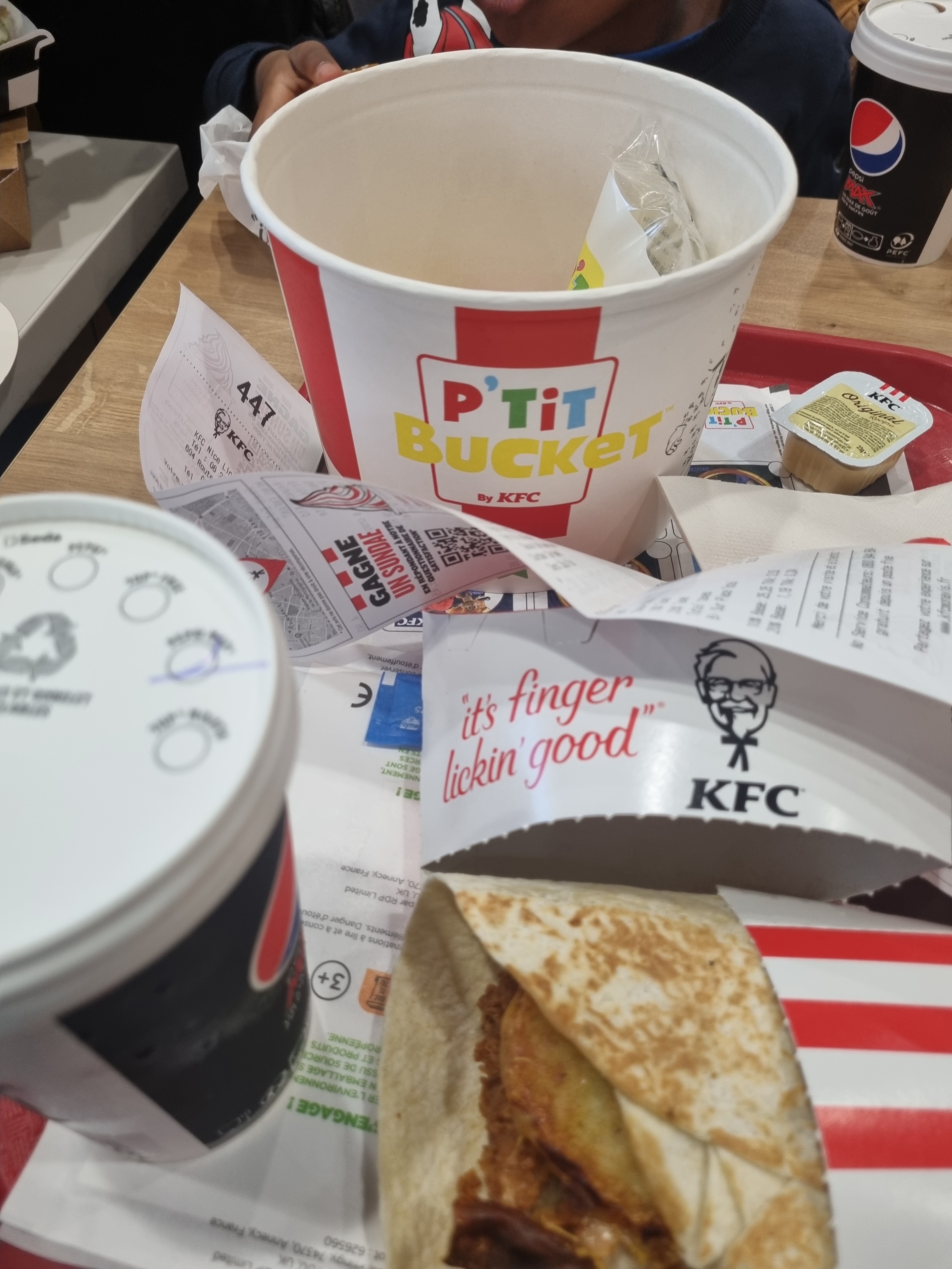 Déçu : les buckets sont moitié vides. 20 pièces de toute petite taille par rapport aux autres kfc de France. C'est loin d'être suffisant pour 4 personnes. Vraiment dommage...