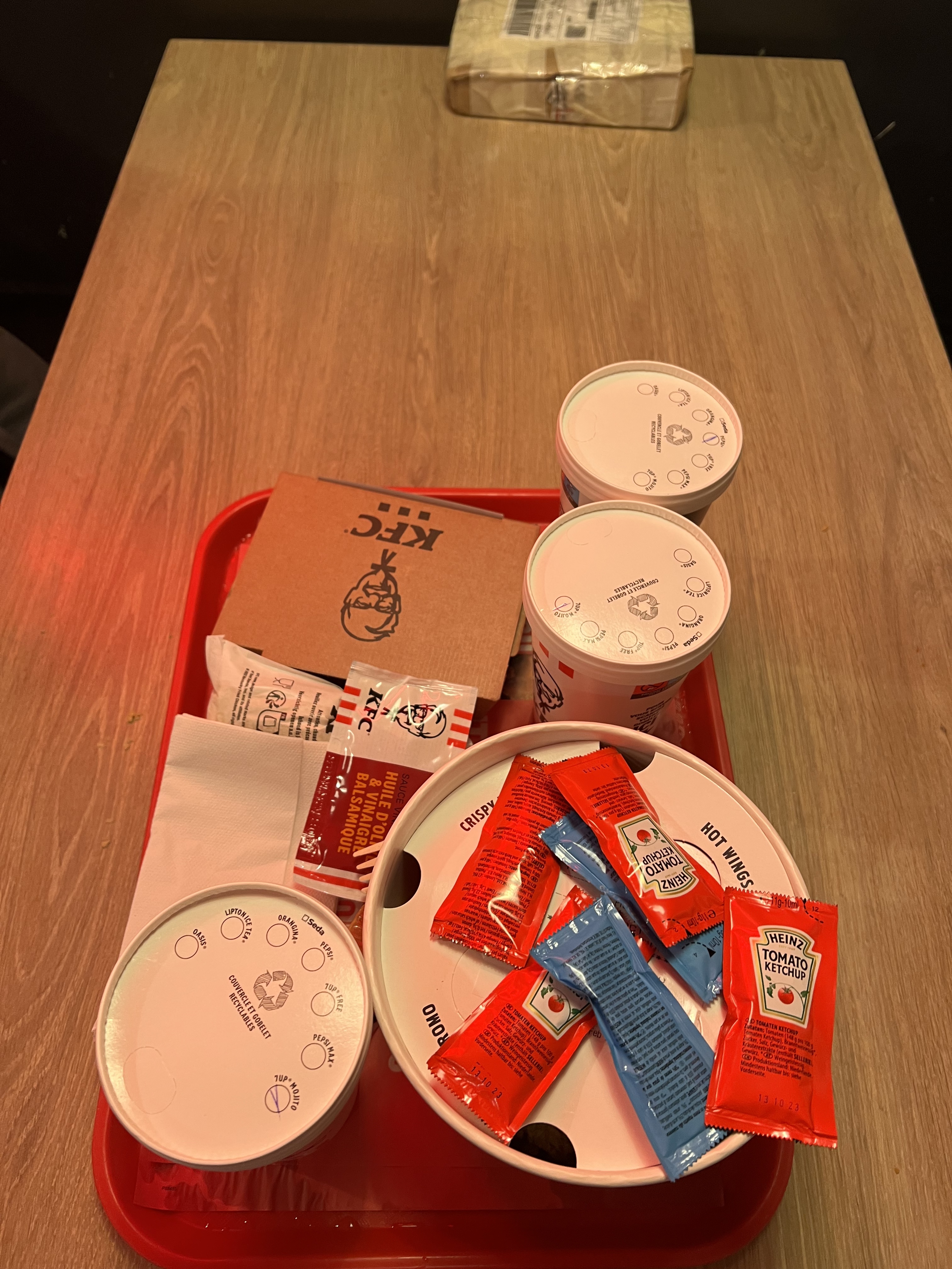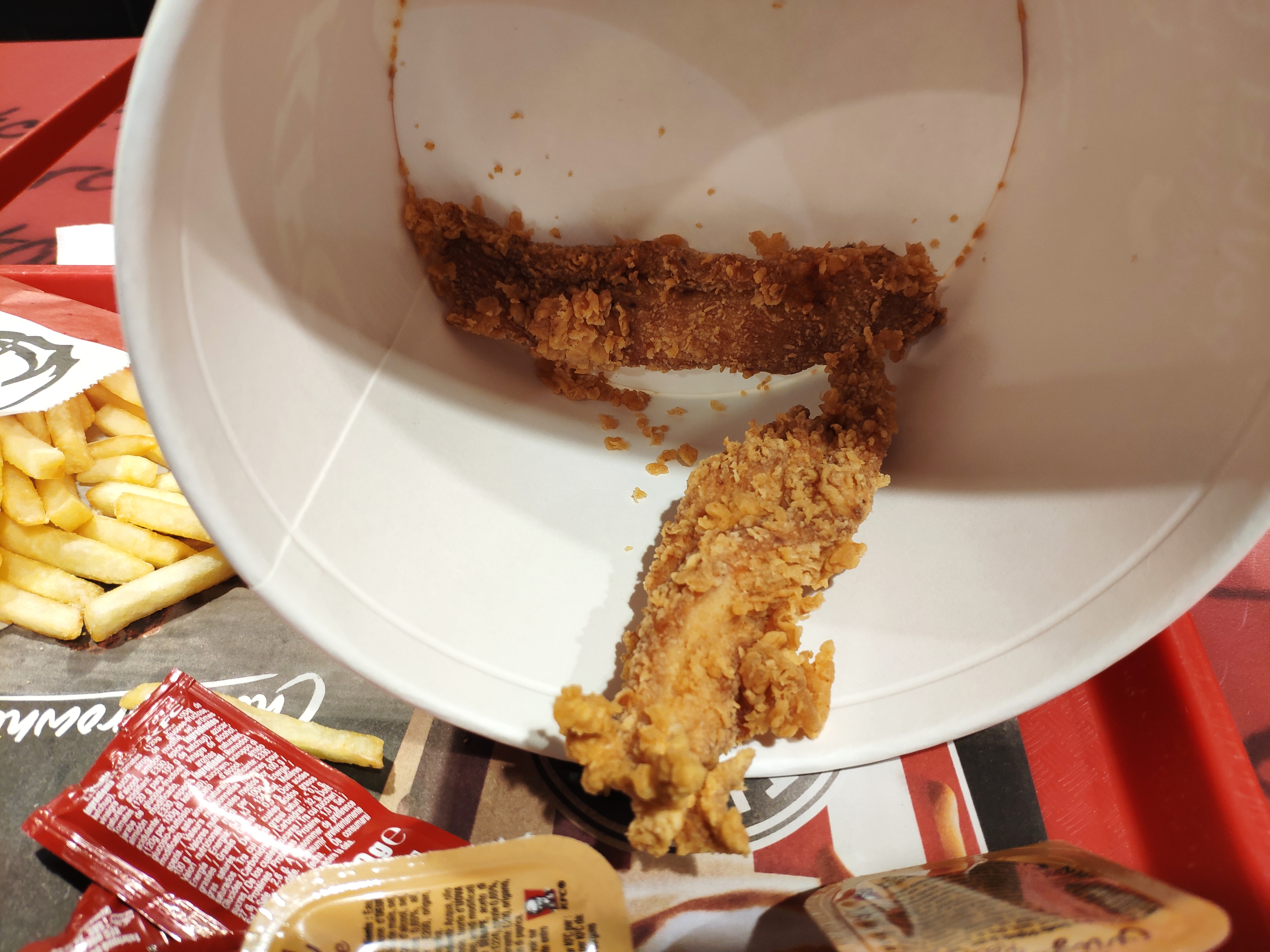 Poulet sec et tiède, quel dommage lorsque l'on prend un seau !! Les onions rings étaient rocailleuses, aie ma mâchoire. Petite touche positive, les frites étaient bien cuites et à hauteur de la mémoire du Grand Colonel. Enfin, bonne quantité de serviettes, très utiles pour essuyer la table à l'arrivée o_O