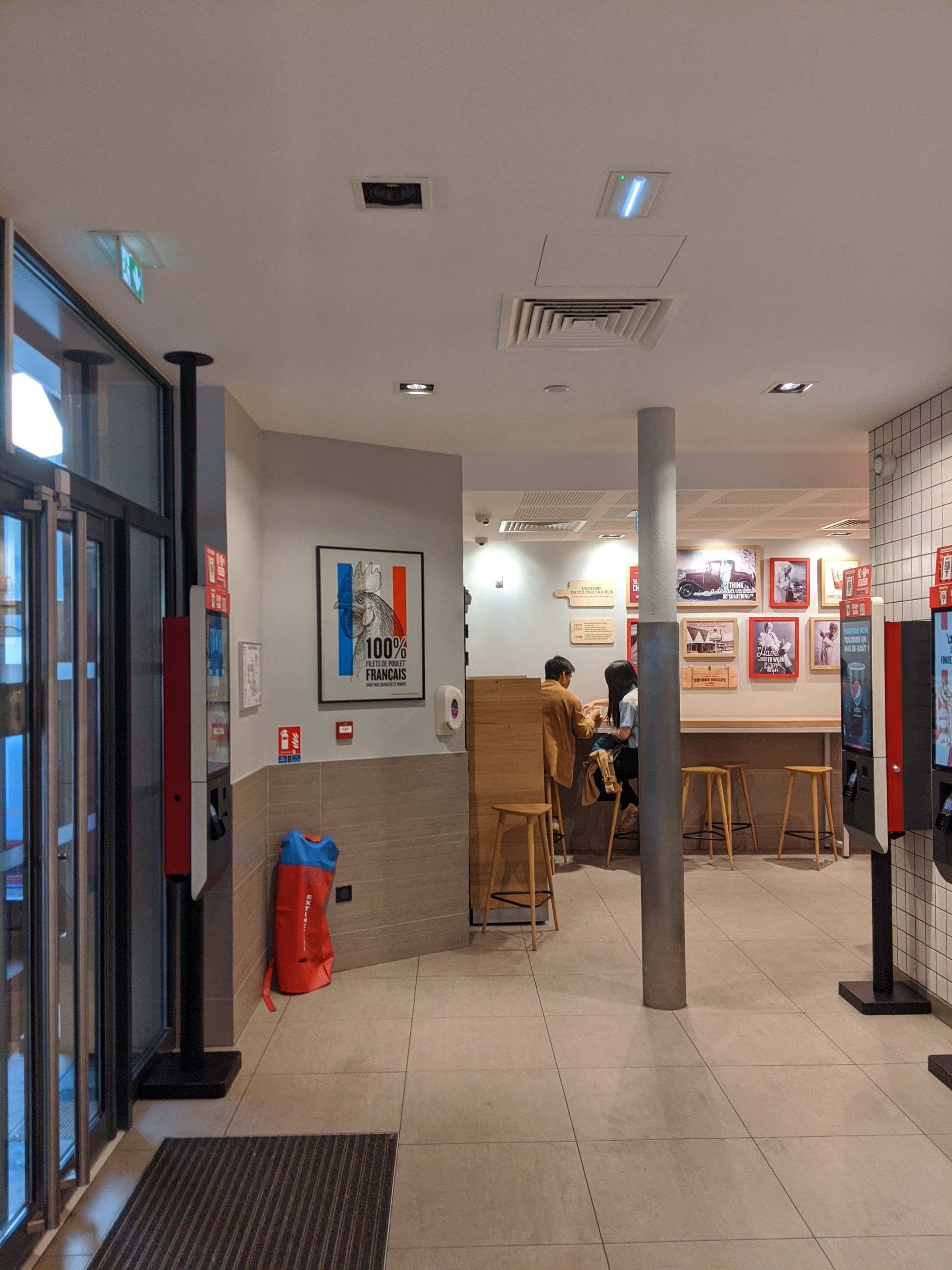Excellent service et j’ai trouvé facile d’utiliser l’écran tactile. Un repas avec un burger coûte environ 7,20 euros. Assez propre partout et dispose de toilettes basiques à utiliser. Je ne recommanderais cependant pas l'option poulet roti - tenez-vous-en à leurs articles les plus populaires !