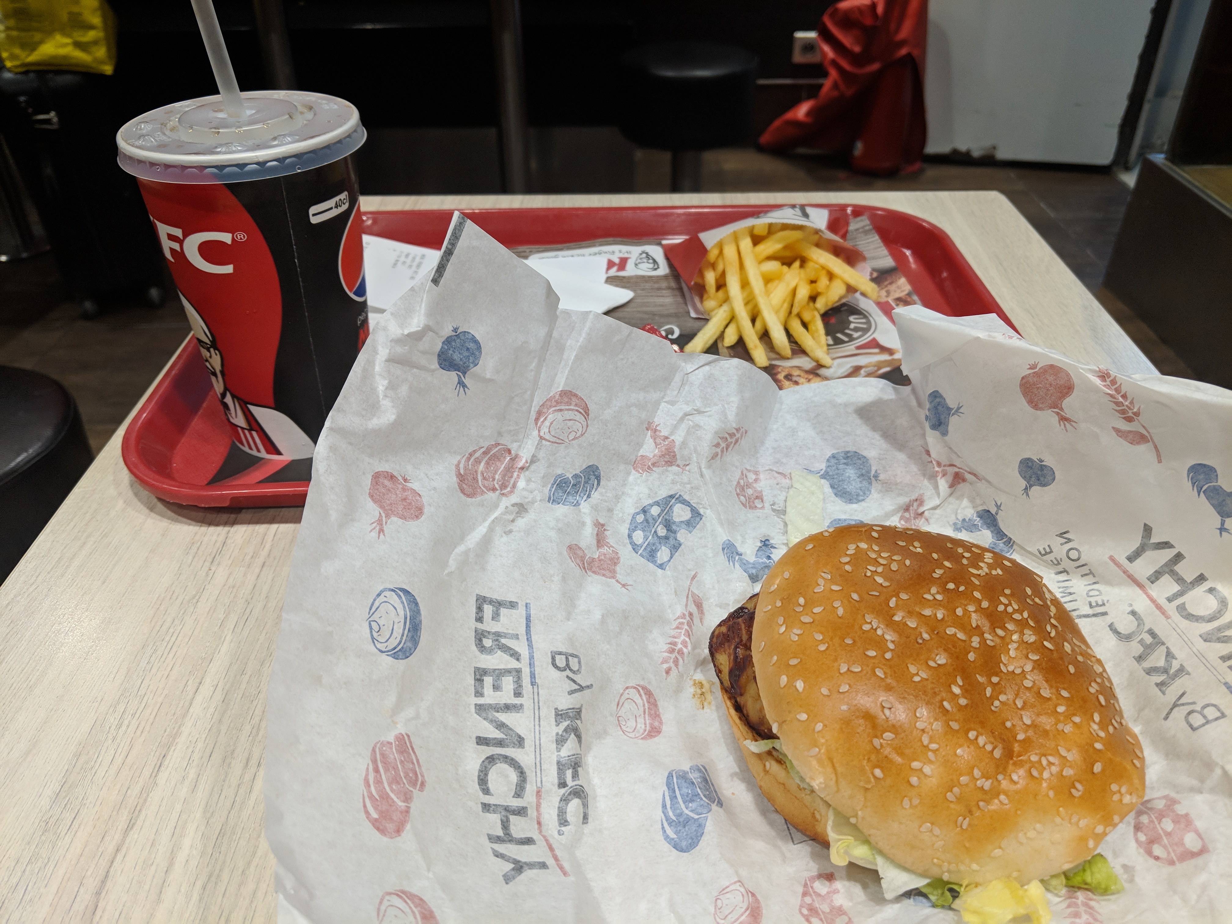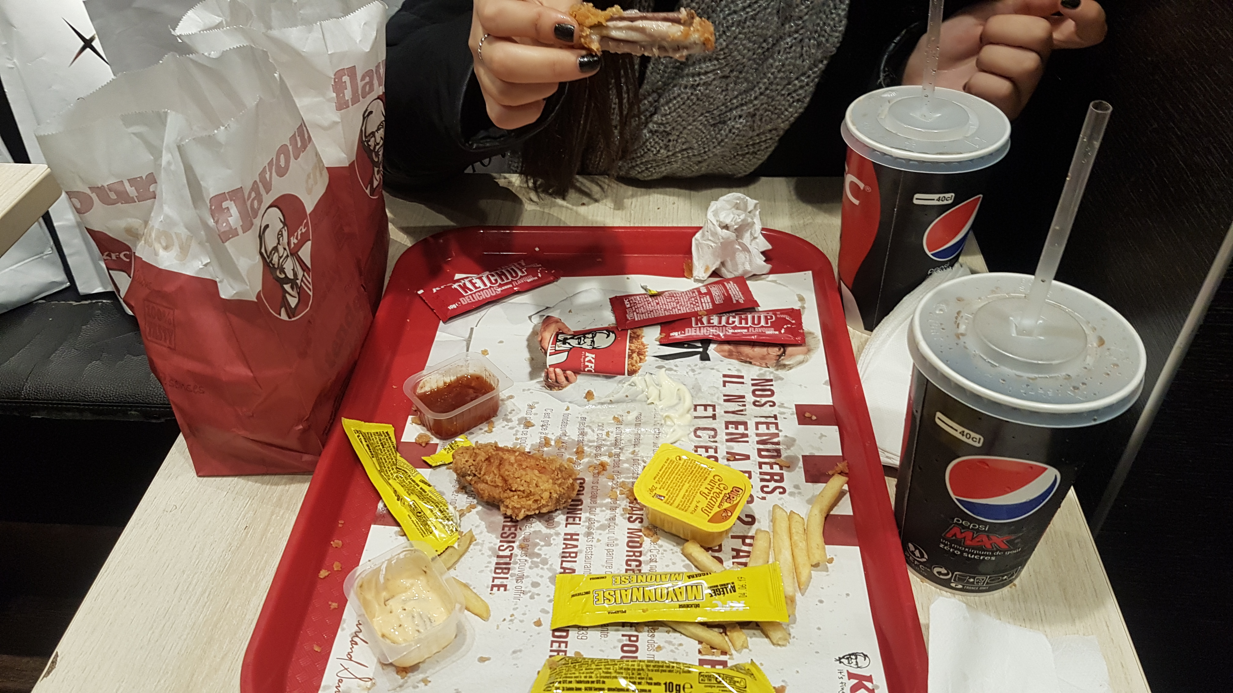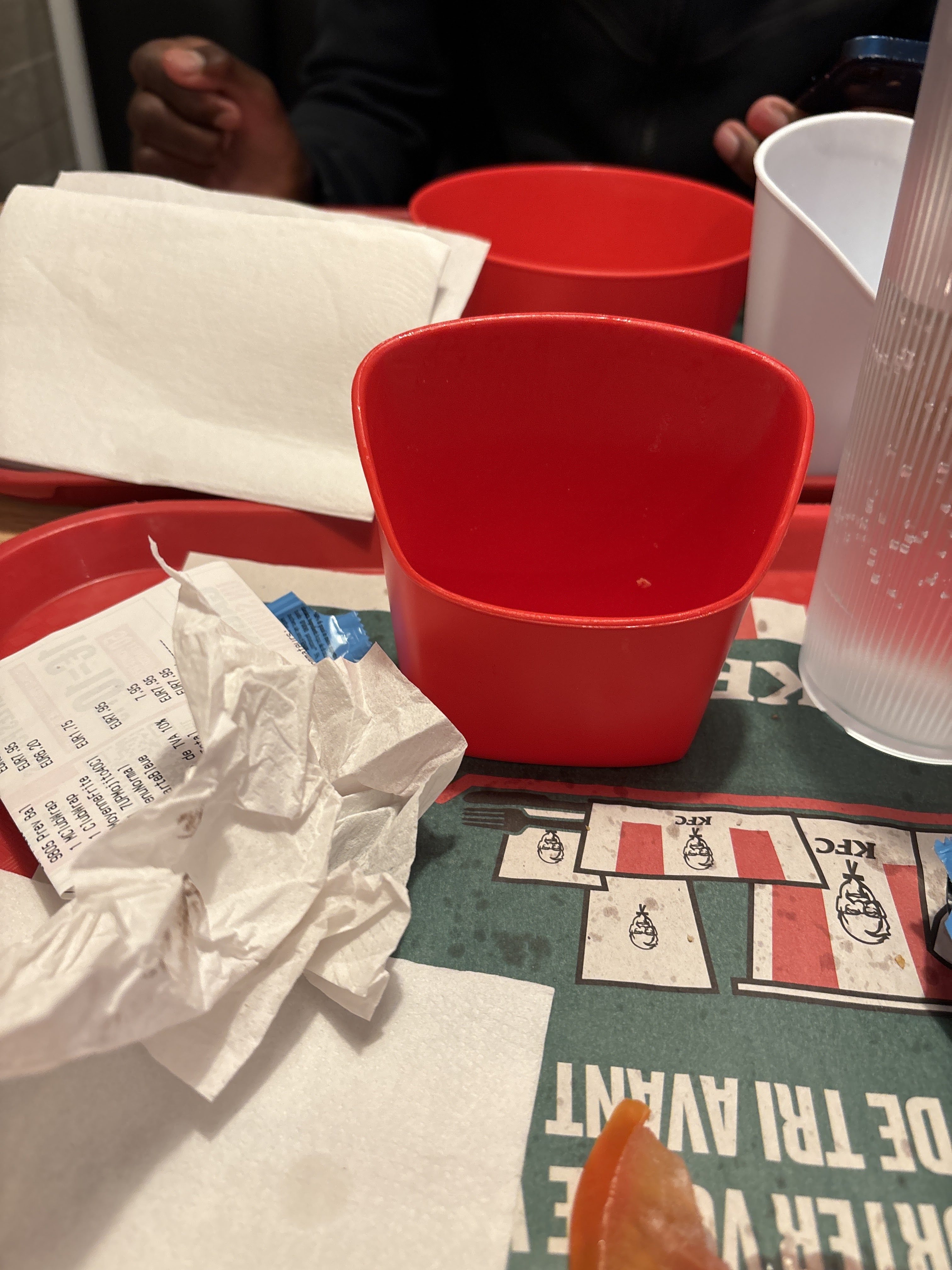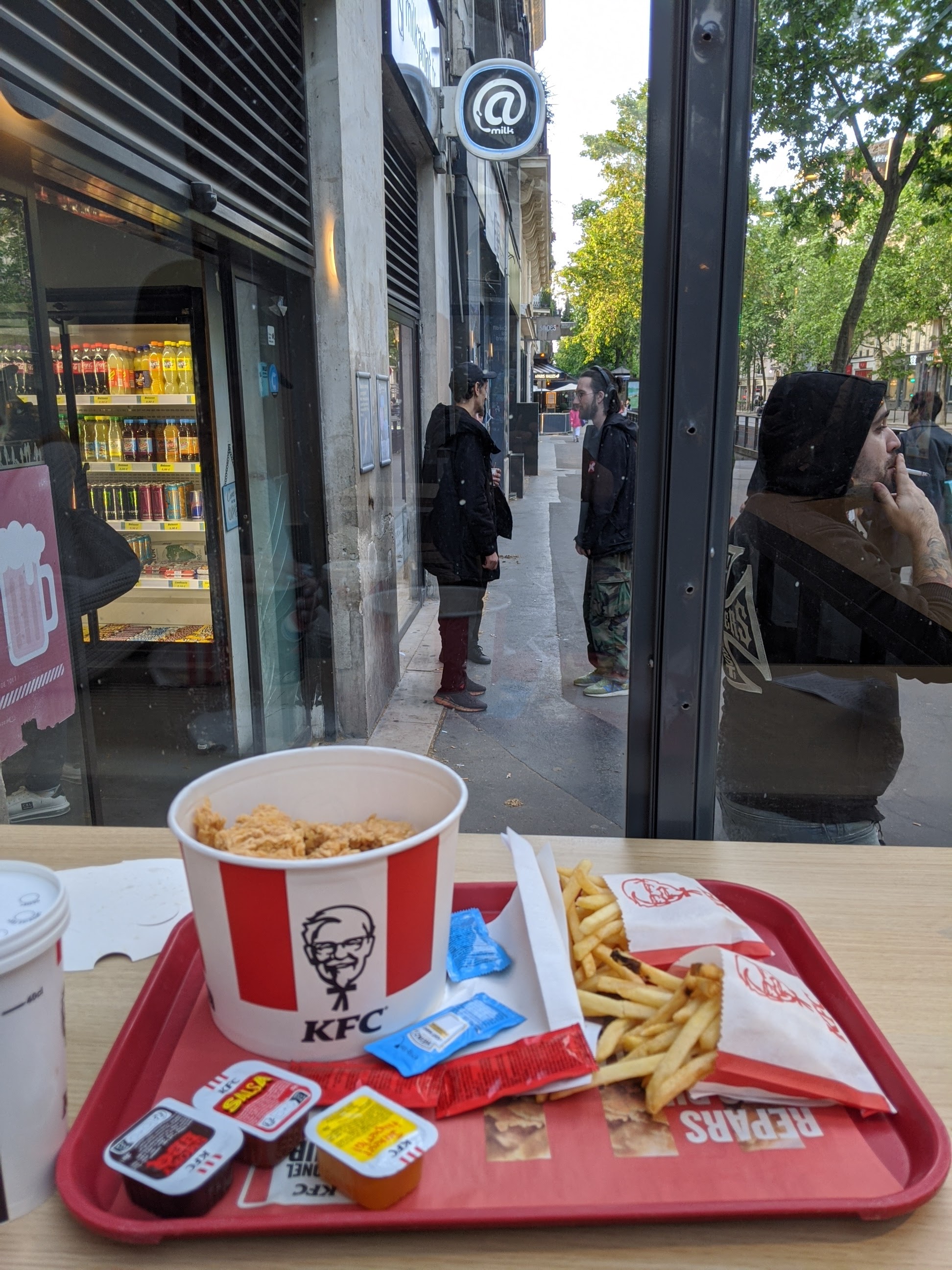 Nous ne connaissions pas KFC avec ma fille... Ben c'est fait... Et plus jamais... Pourtant, on se disait que du poulet frit avec des frites, ça ne pouvait pas être mauvais... Au goût... Parce qu'on savait bien que pour la santé... Bref... Au final, un personnel totalement lassé, du poulet frit dans une huile usagée à l'évidence, des pommes de terres théoriquement mouelleuse totalement ratatinées nappées d'un truc orange, des sauces industrielles moins goûteuses que celles de Lidl... Et pompon, LA GLACE... enfin planquée sous une bouse de Chantilly intortable... Ben KFC plus jamais... Et je précise qu'on a testé des fast food en Angleterre et ailleurs... Donc on est capable... Mais là... Ça promet pour les JO et les souvenirs culinaires des visiteurs étrangers !... Allez, on va tenter de digérer le peu qu'on a avalé !