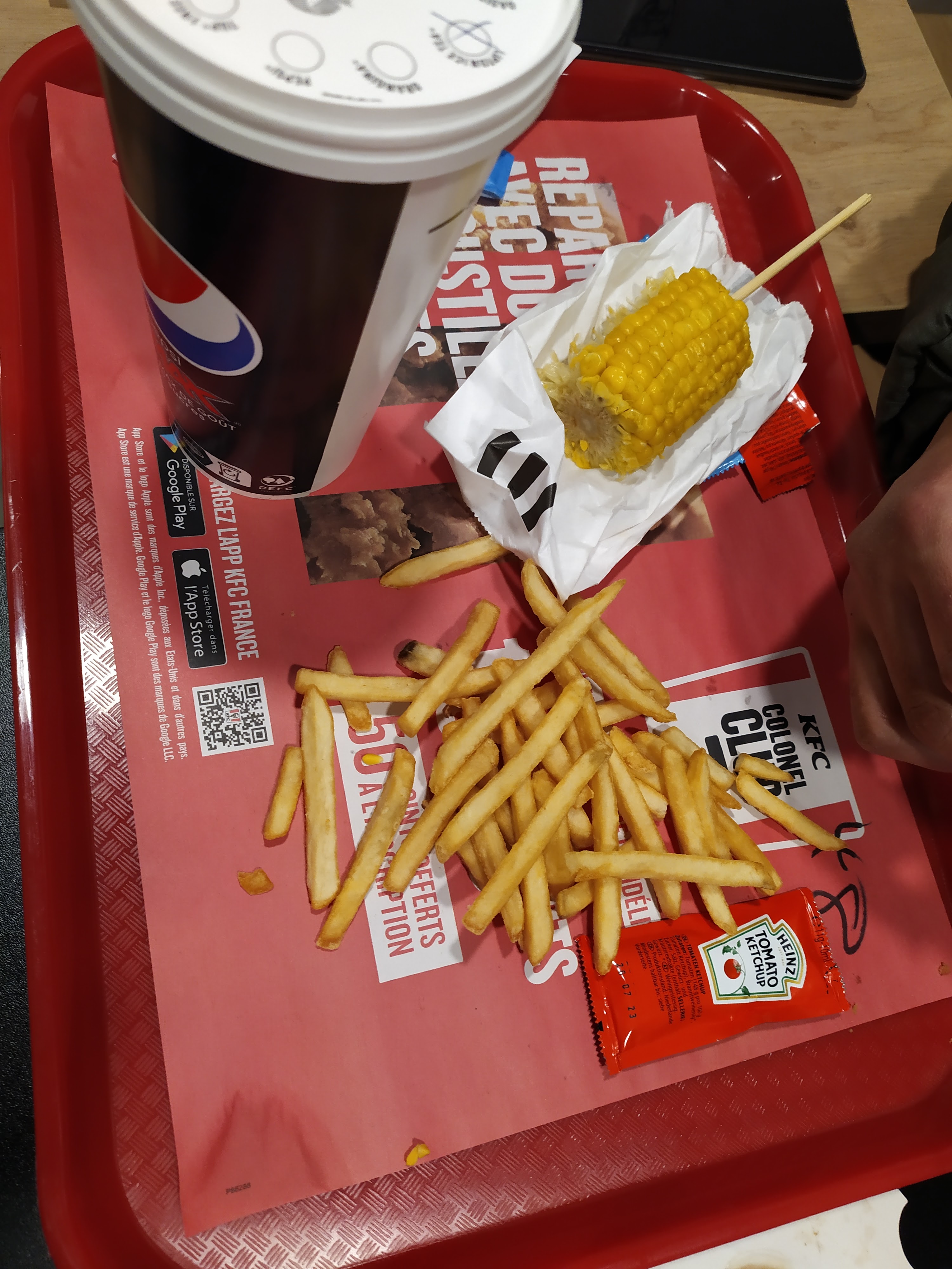 poulet pas bien cuit, sont d’une taille pittoresques, des cobettes toutes molles qui doivent dater de plusieurs jours, frites mal cuite également, j’ai demandé de la mayo pour une commande de plus de 50€+ elle m’en donne QUE 3, j’insiste pour en avoir quelques une de plus la personne derrière le comptoir me regarde tres tres mal. KFC DE SAINT LAZARE A FUIRE
