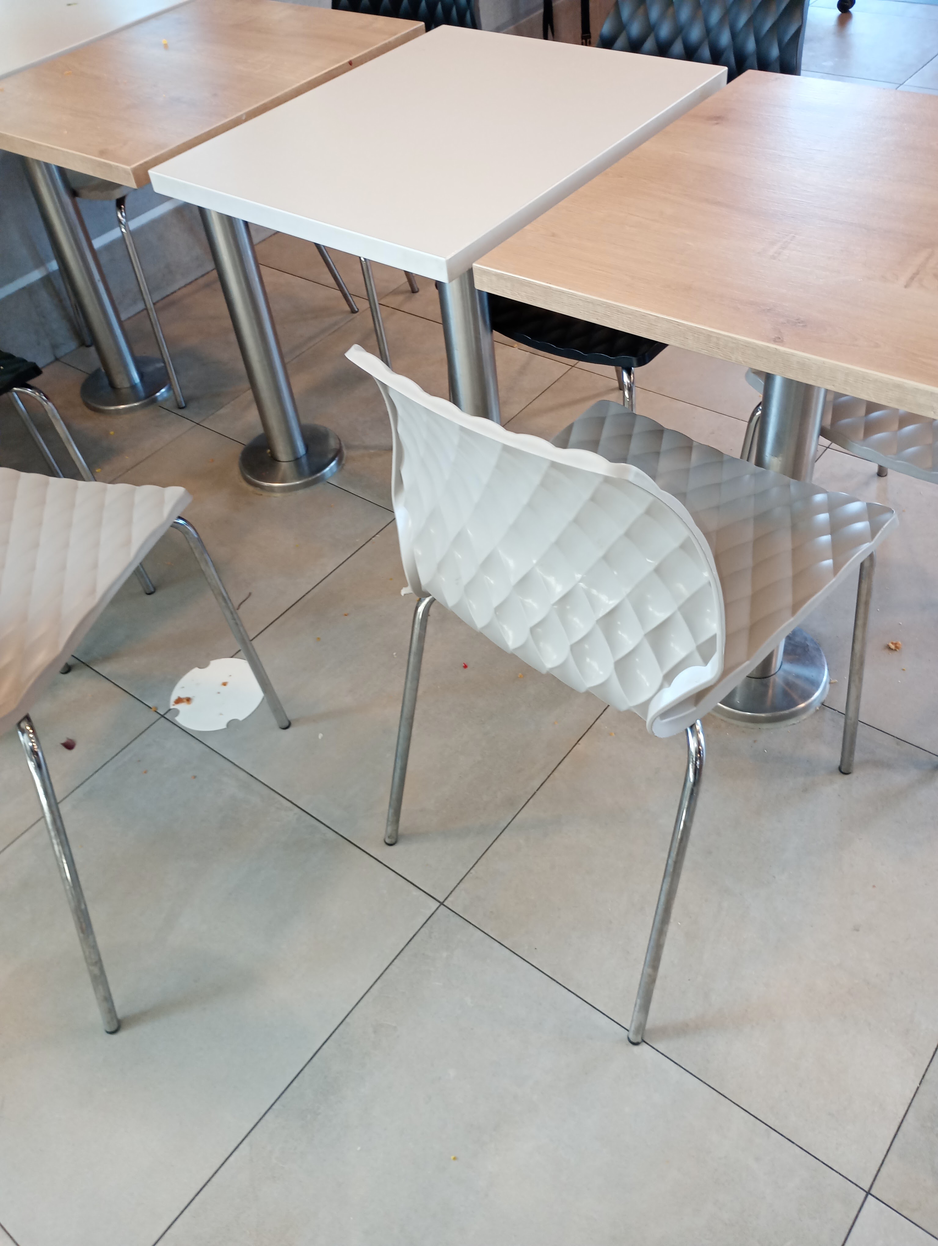Attente au service (pourtant salle pas compète) tables et chaises sales et poubelles débordantes sol très sale …