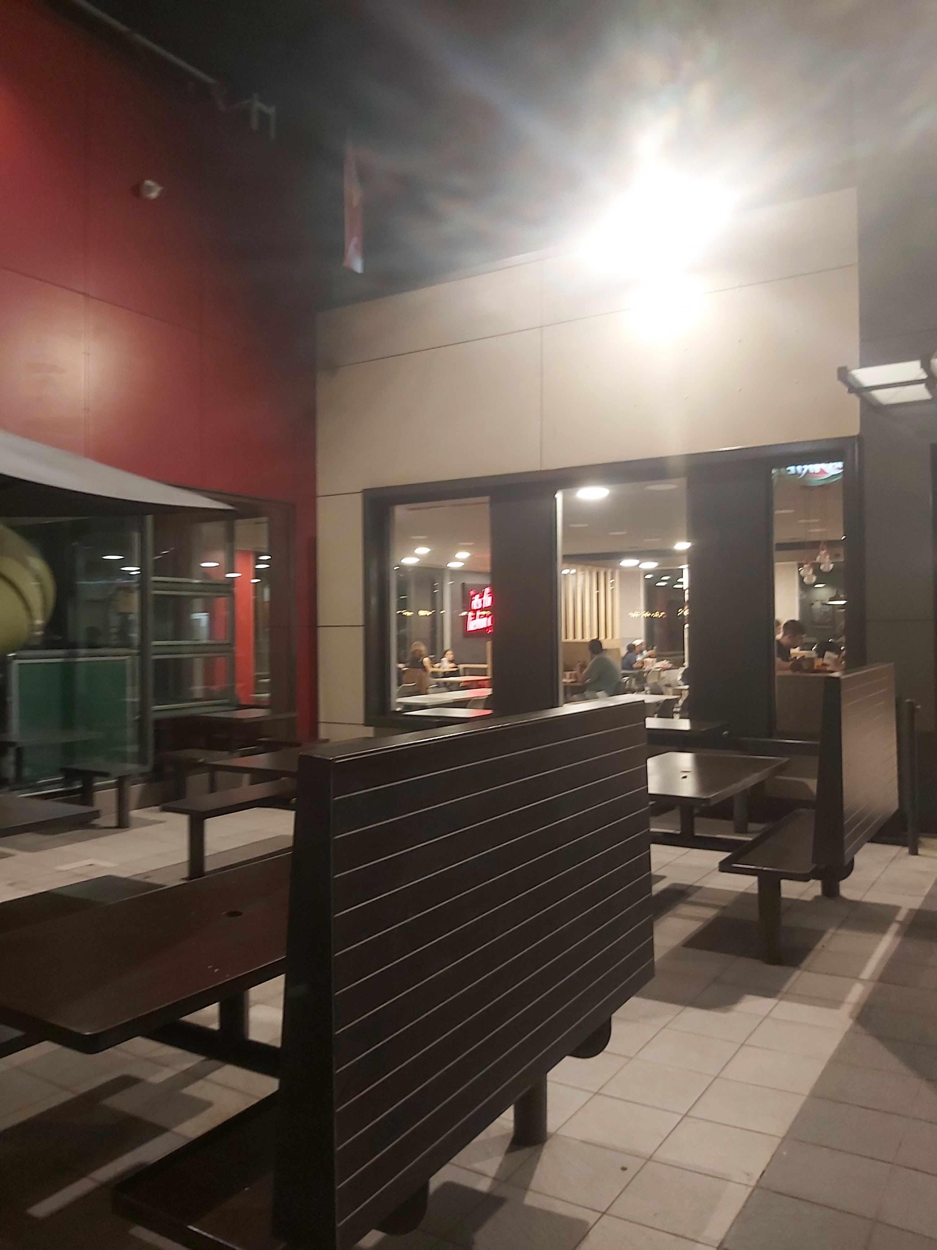 Arrivée à 18h45. Les tables ne sont pas propres, l équipe fume dehors coté drive. Le sol plein de miette et autres taches... 1 personne au service, 4 dehors en pause pendant plus de 30min. Y a t il un manager ? A éviter....