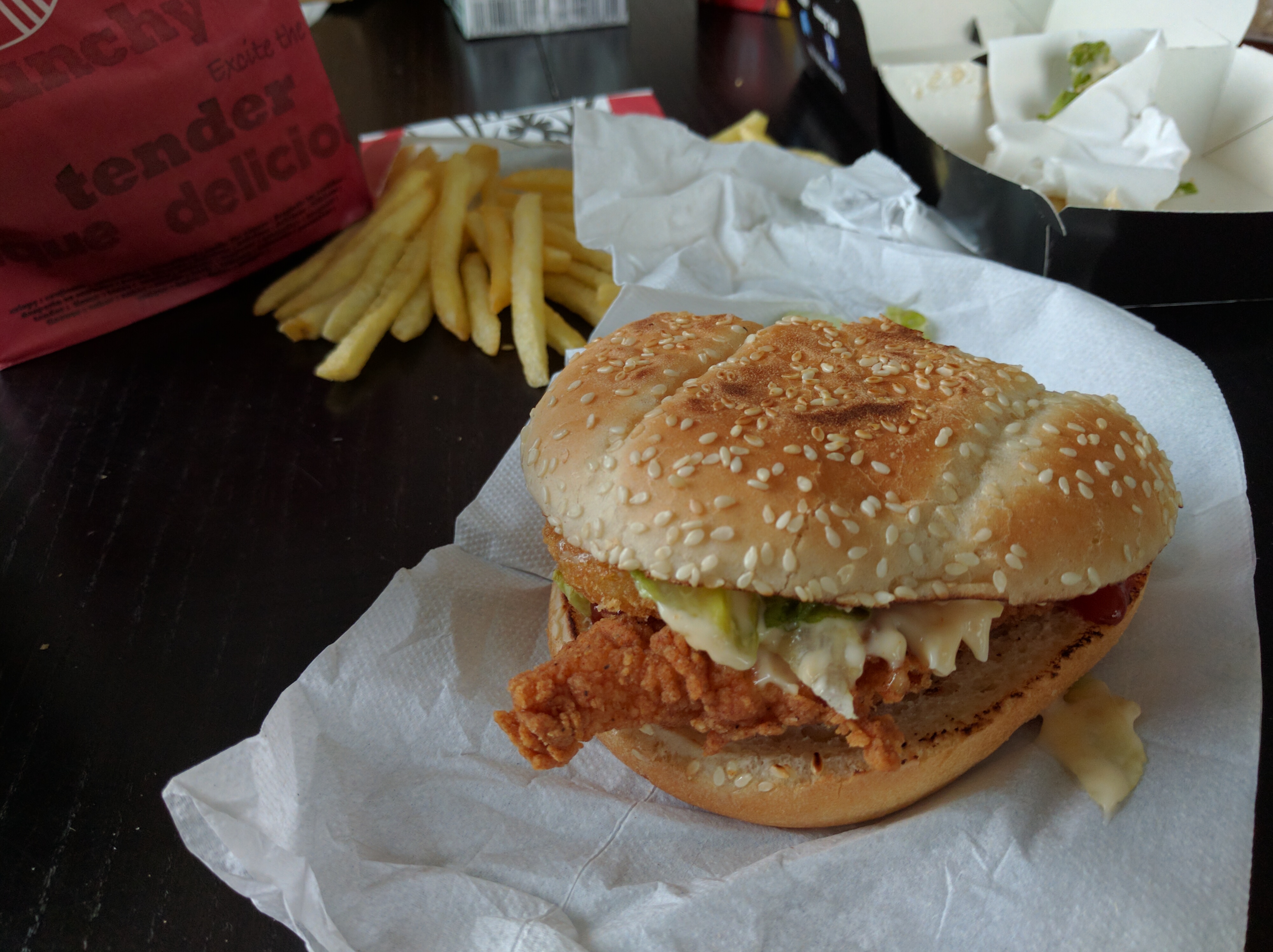 Sincèrement déçu de cette expérience. Je pensais revenir dans L’une des plus grande chaîne de restauration rapide et me rappelé mon enfance avec ce poulet si tendre et croquant. Malheureusement la réalité est tout autre, je me retrouve à manger des bouts de carton sans saveurs avec des sauces toutes aussi exécrables. Sans même pouvoir m’essuyer la bouche par manque de serviette je dois me contenter d’utiliser des emballages bien plus sales. Le service quand à lui est plus ou moins bon. Les employés sont assez agréables mais sans plus. Merci pour votre gentillesse cependant l’idée de me remplir le ventre sans prendre véritablement de plaisir ne me donne pas envie.