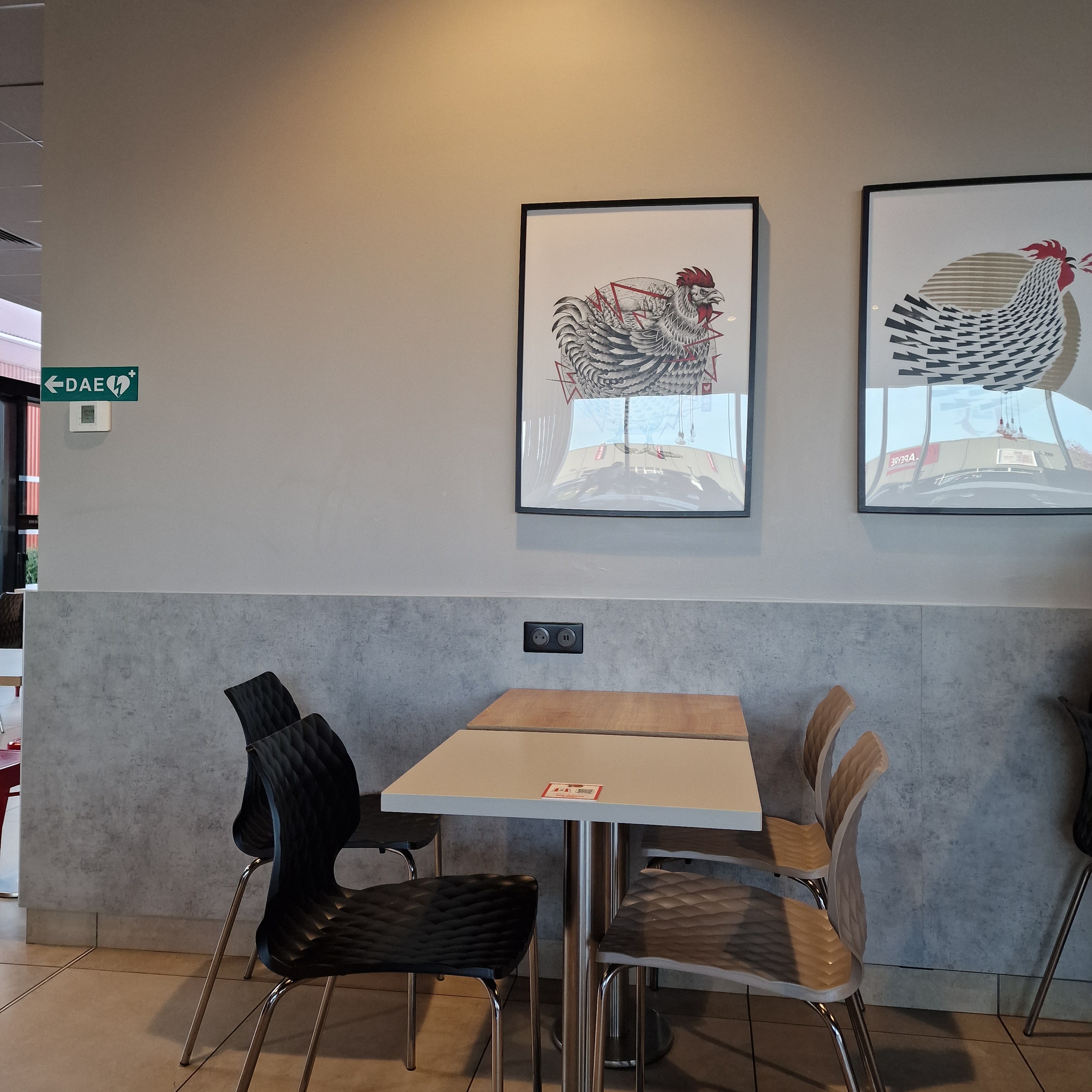 Grande salle bien entretenue, nettoyage régulier. Décoration bien réalisée à l’effigie du Colonel Sanders. Repas servi bien chaud comme il faut, très bon.