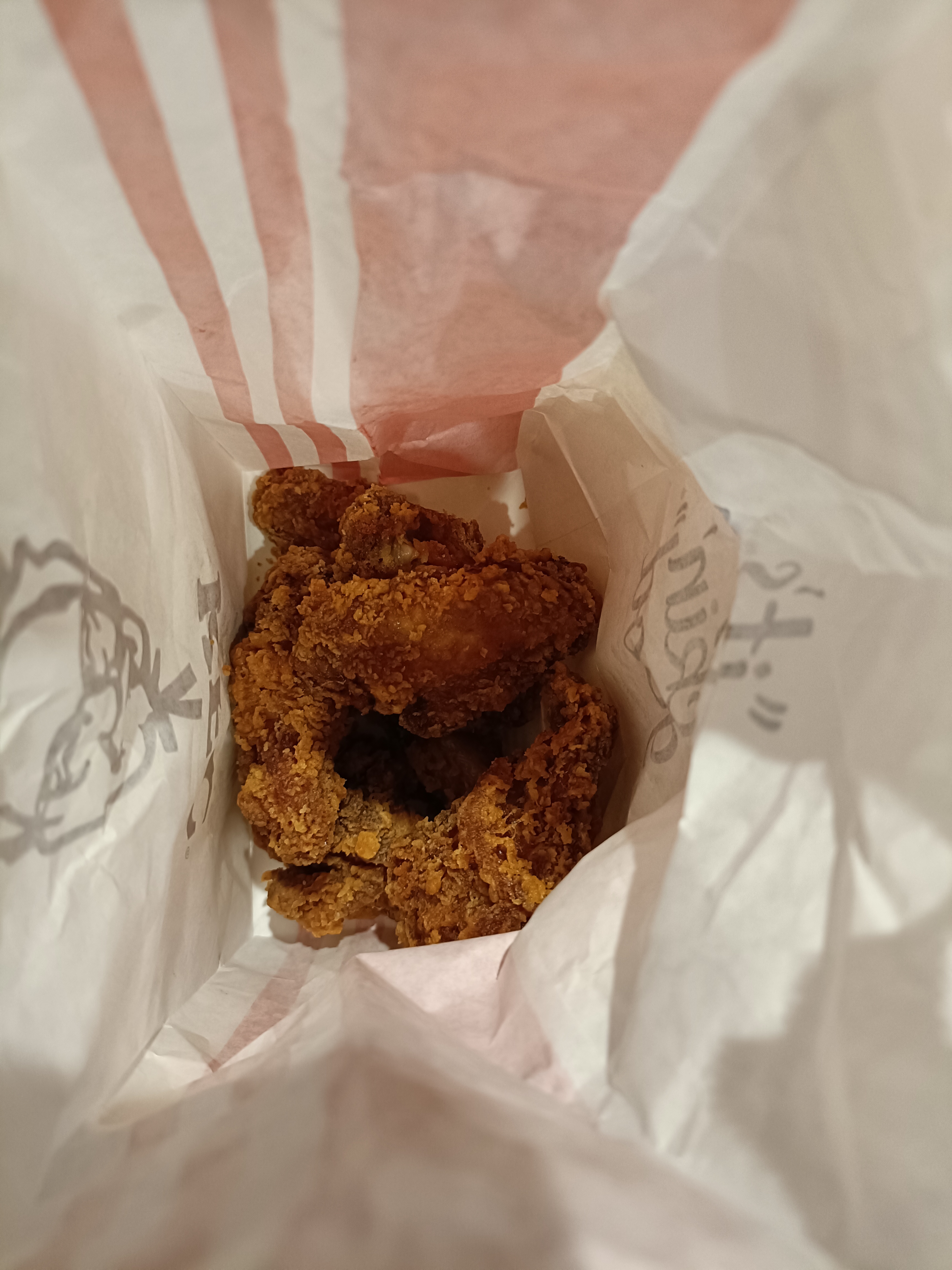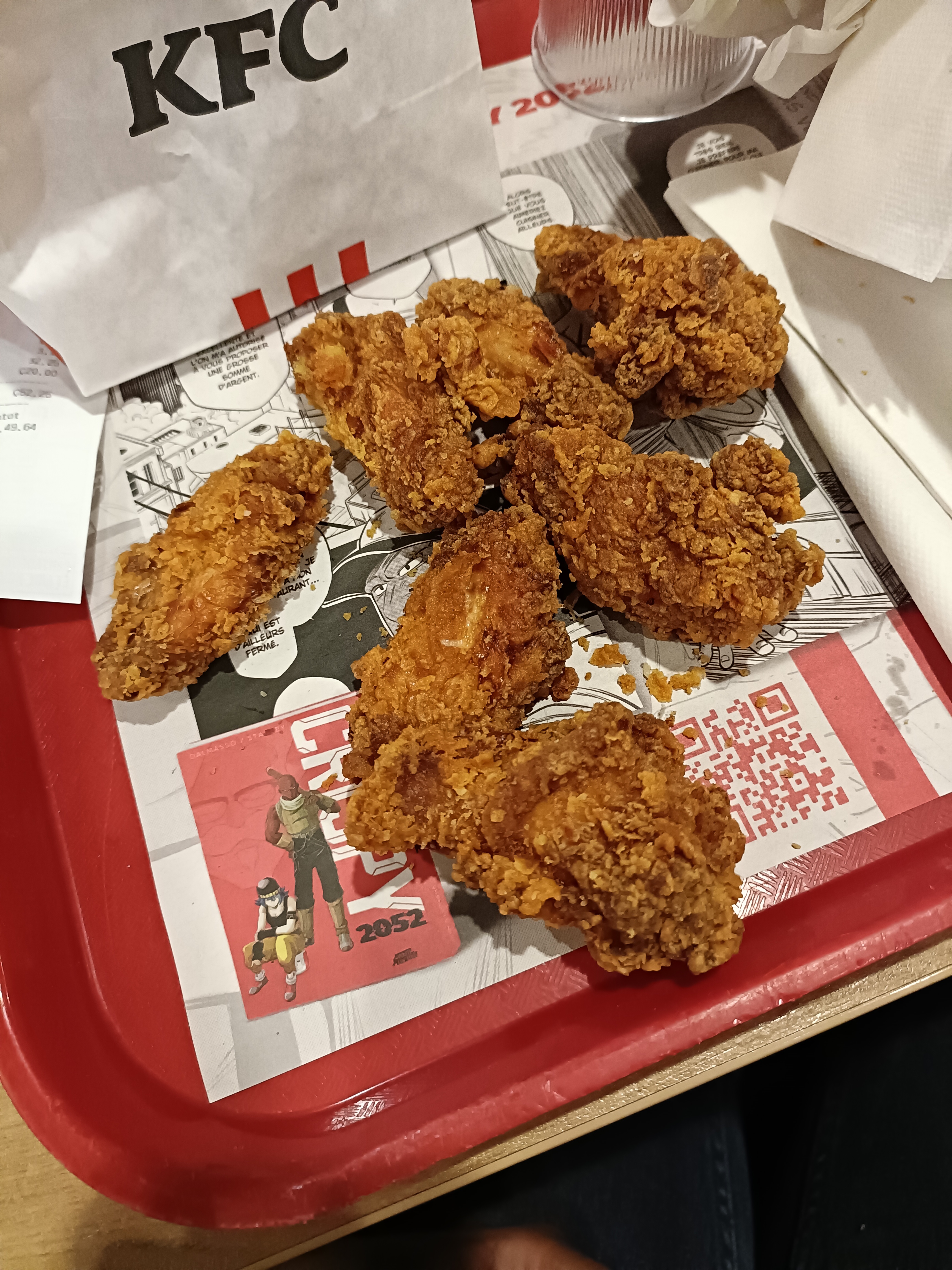 Kfc= arnarque 20€ pour trois frites dans la portion, 2 tenders ridicule et 8 hot wings moisie ( bon les 2 tenders 8,10€ erreur de service) bref plus jamais.🤮