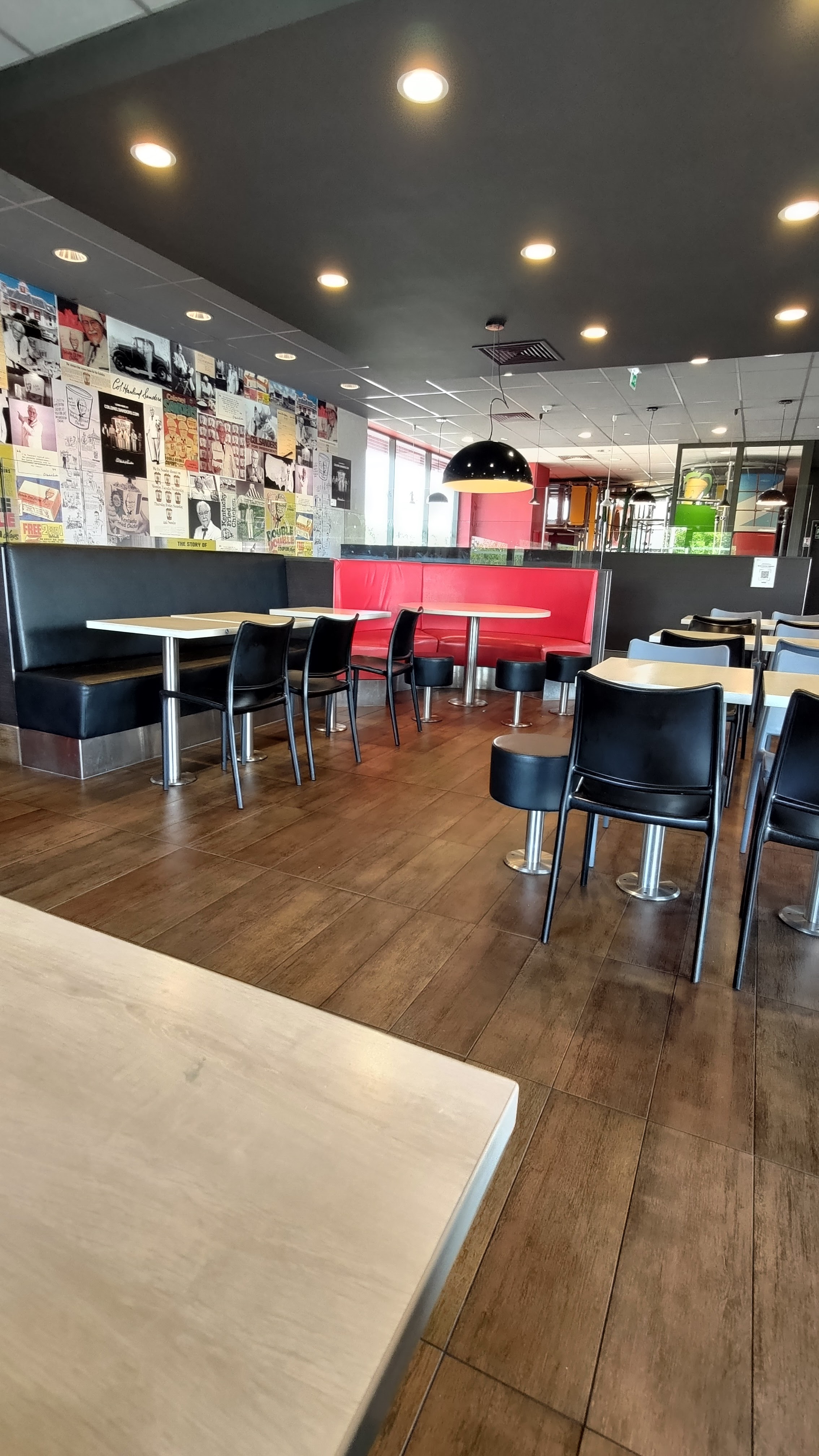 De passage en vente à emporter ce jour, restaurant calme à mon passage, servi très rapidement, pas de manque, rien a dire. Je ne viens pas souvent mais quand je viens, le restaurant est très propre, les jeux pour enfants et les toilettes sont propres aussi. Il y a pas mal de borne pour passer commande. Grande terrasse exterieur, Grand parking pratique. Je recommande 👍