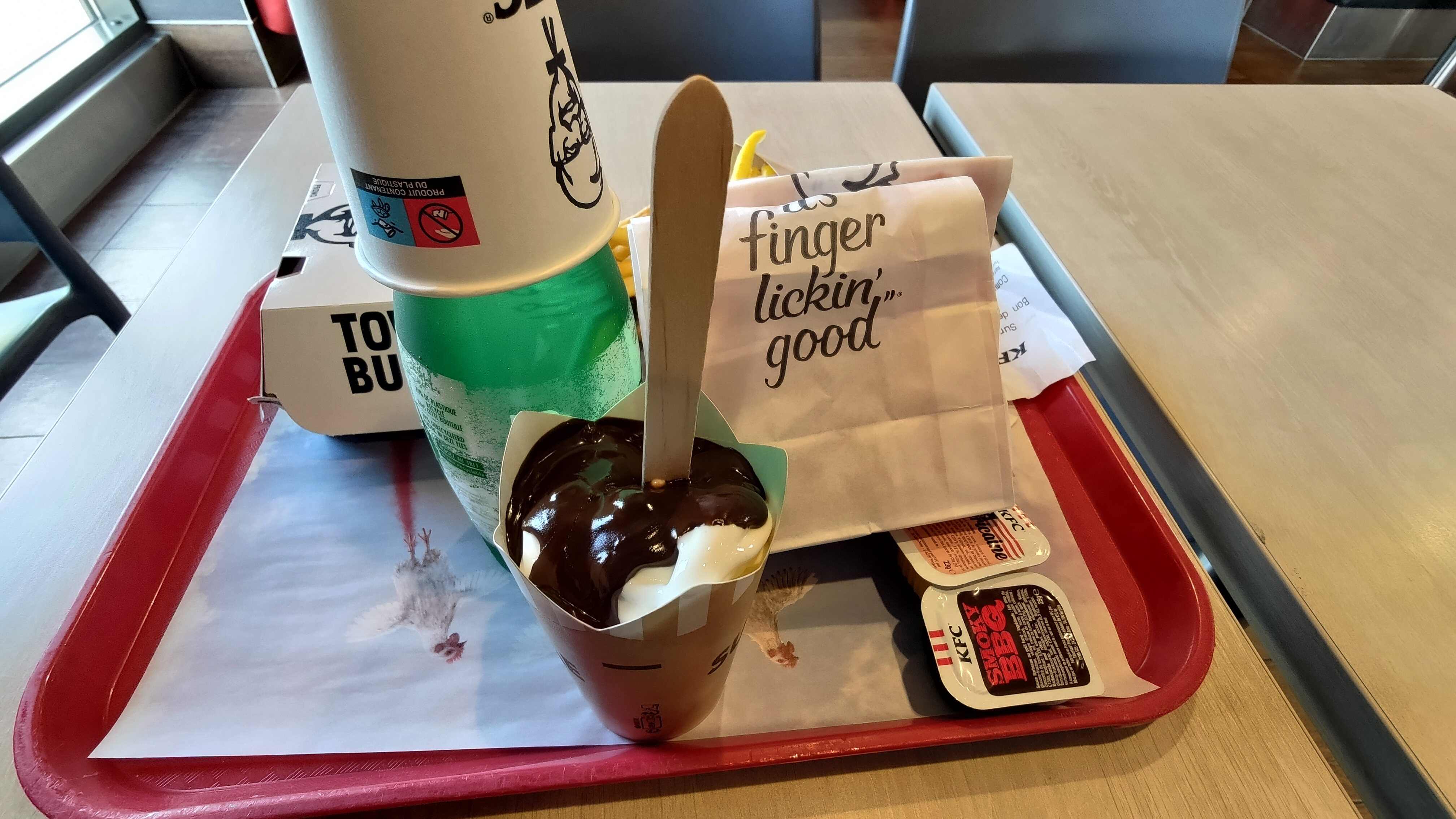 C'était génial. Le service était très rapide, tout était propre des tables au sol en passant par les toilettes. Le compte fidélité a fonctionné contrairement à des tas d'autres KFC ou ça faisait planter la borne. La nourriture était succulente et chaude. Et en plus, la rédaction de cet avis m'a permis d'obtenir une glace gratuite. Je recommande. 😊