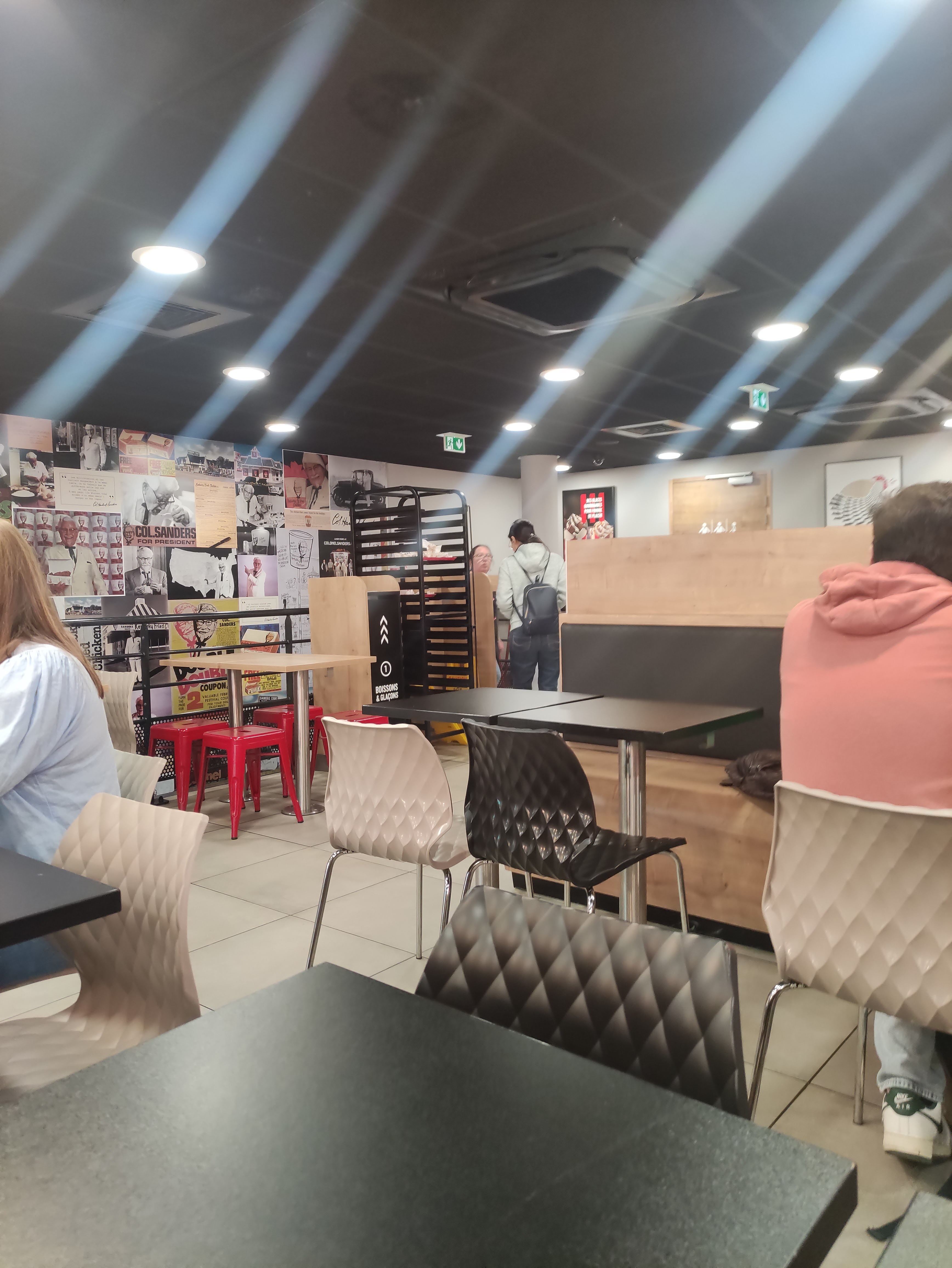 C'est un bon KFC, l'équipe est souriante et agréable et tout ce qu'il faut. Le problème c'est la place. Des tables en extérieur, ou alors à l'étage. On se retrouve forcément à devoir monter les marches avec le plateau pour aller manger et honnêtement c'est assez embêtant.