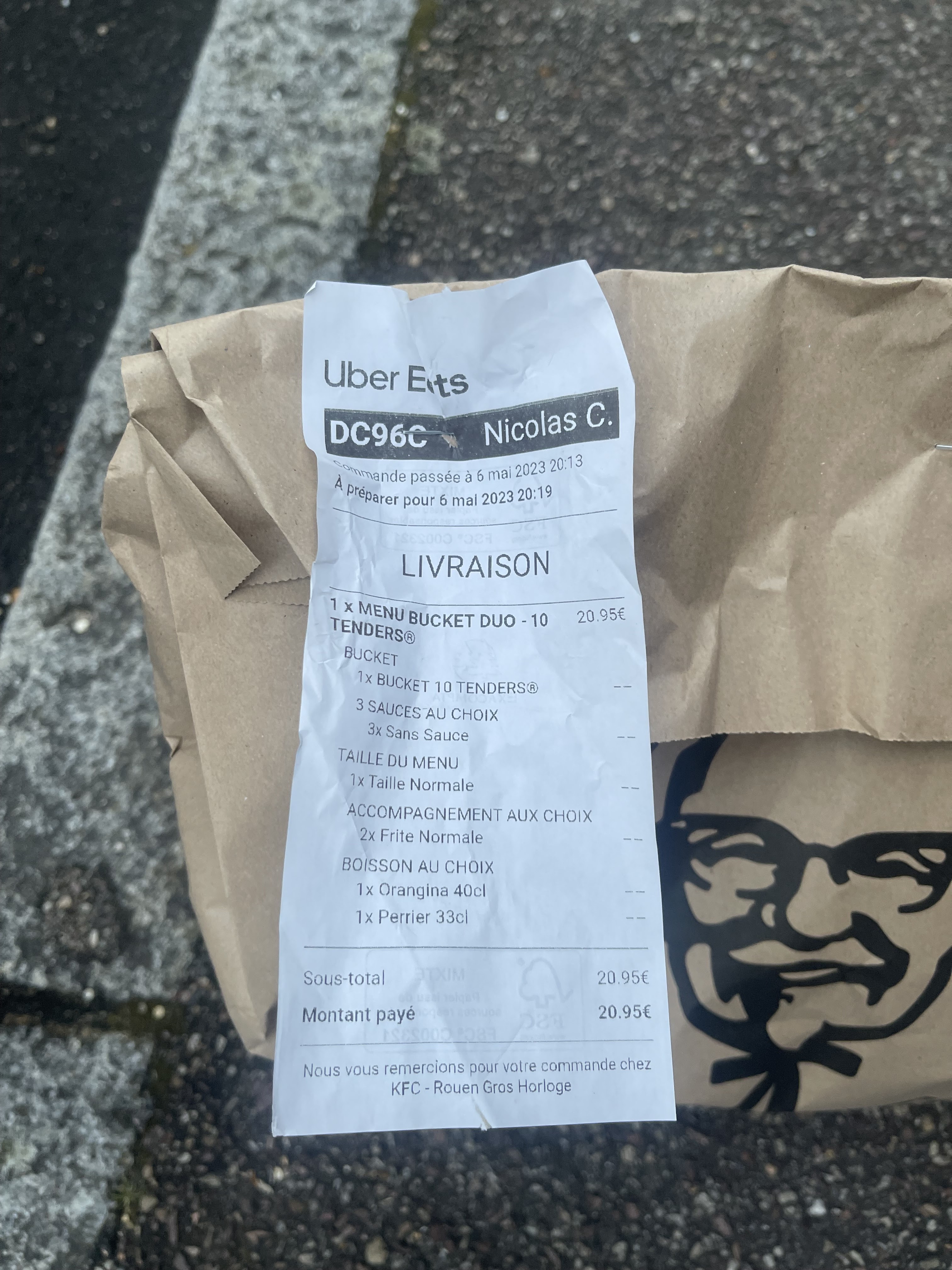 Commande passée par Uber ce soir (n° 442E6), un bucket en XL avec une boisson 2 litres pour 44 euros … jusque là tout est normal … le livreur arrive avec la commande d’un autre client (DC96C) loin d’être équivalente à la mienne puisque sa valeur marchande était de 20 euros … celui qui recevra la mienne va être content … bref une enseigne comme la vôtre n’a pas vraiment le droit à ce genre d’erreur, c’est lamentable ! Ça ne mérite qu’une étoile. Photo prise et envoyée à Uber … solidaire de ces pauvres coursiers qui bossent d’arrache pied, mais cette fois c’était pour repartir avec cette commande … soirée gâché… merci KFC !