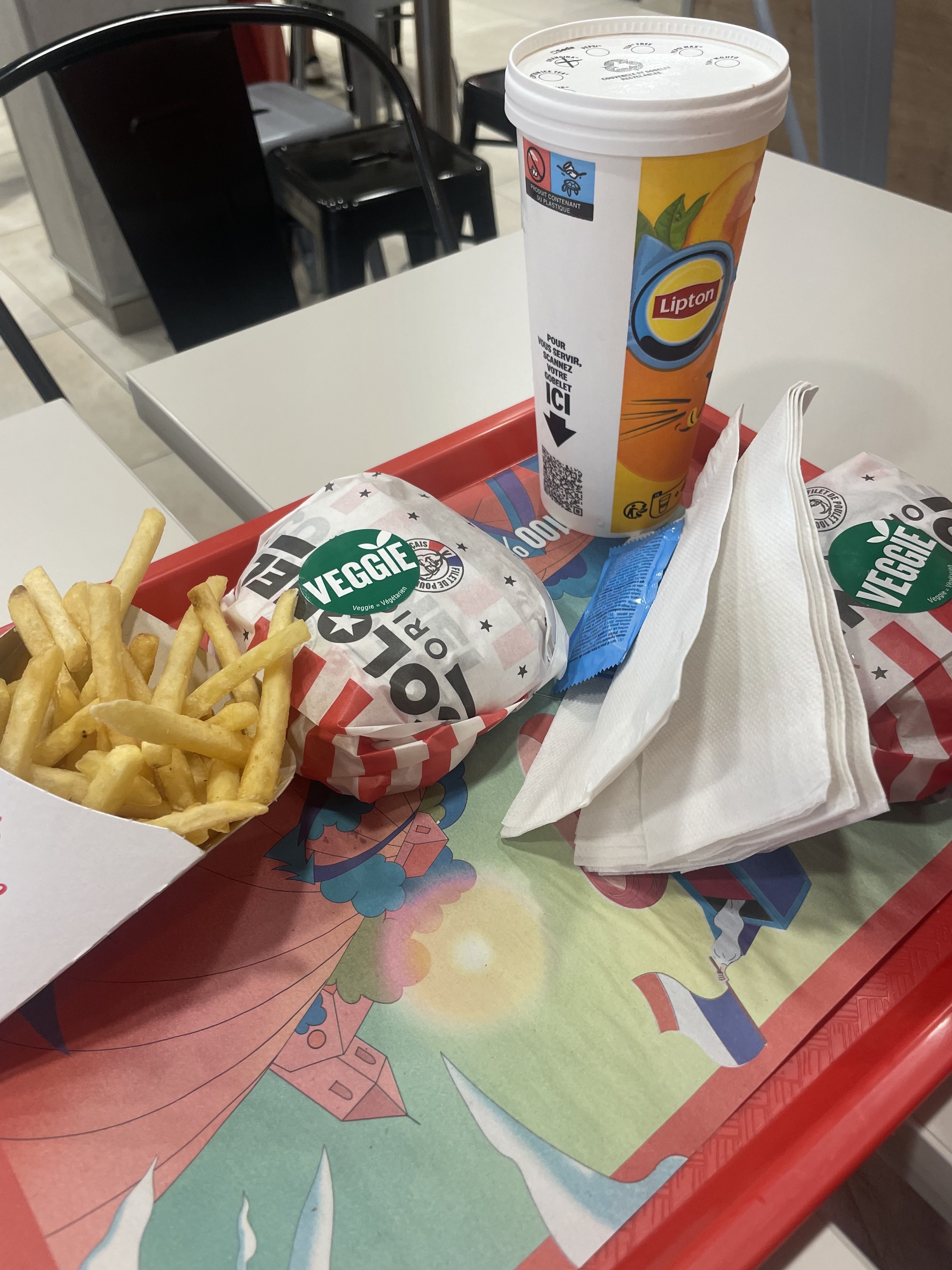 Un burger. 10 min d'attente, au moins 10g de moutarde (on ne sentait même plus le poulet), pas de mouchoirs. J'ai pu un peu rattrapé en essuyant la moutarde sur le papier mais normalement c'est pas possible