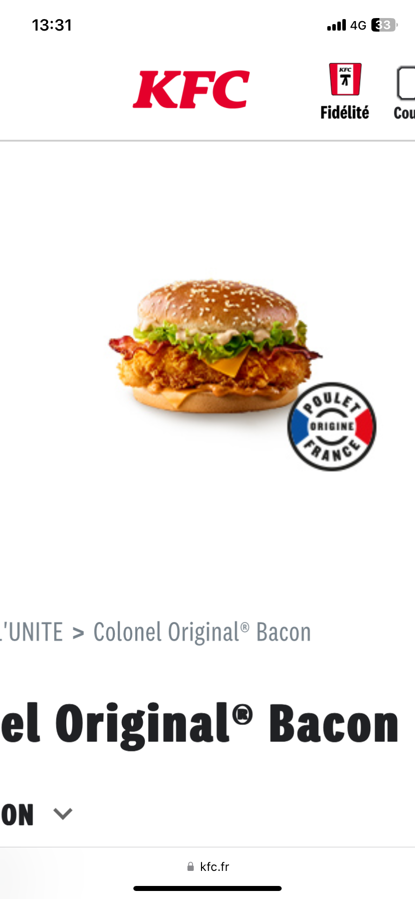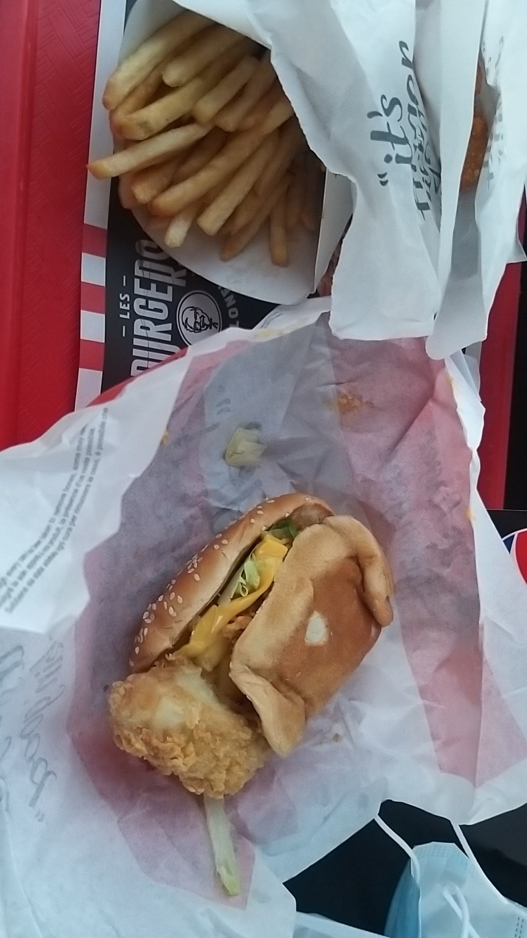 J ai commandé un Double Stacker, j ai reçu cette chose. Du pain et du poulet, pas de bacon ni de salade rien. Degueulasse, au bout de 3 bouffées j étais écoeuré et je l ai jeté. Honnêtement je n ai eu que des mauvaises expériences avec KFC horrible
