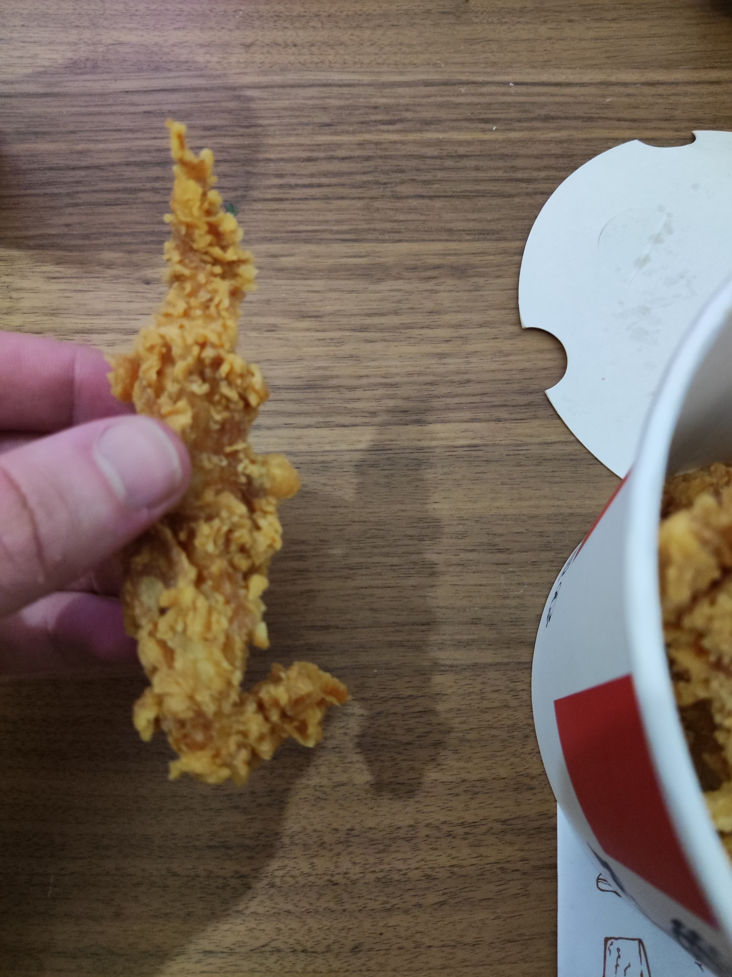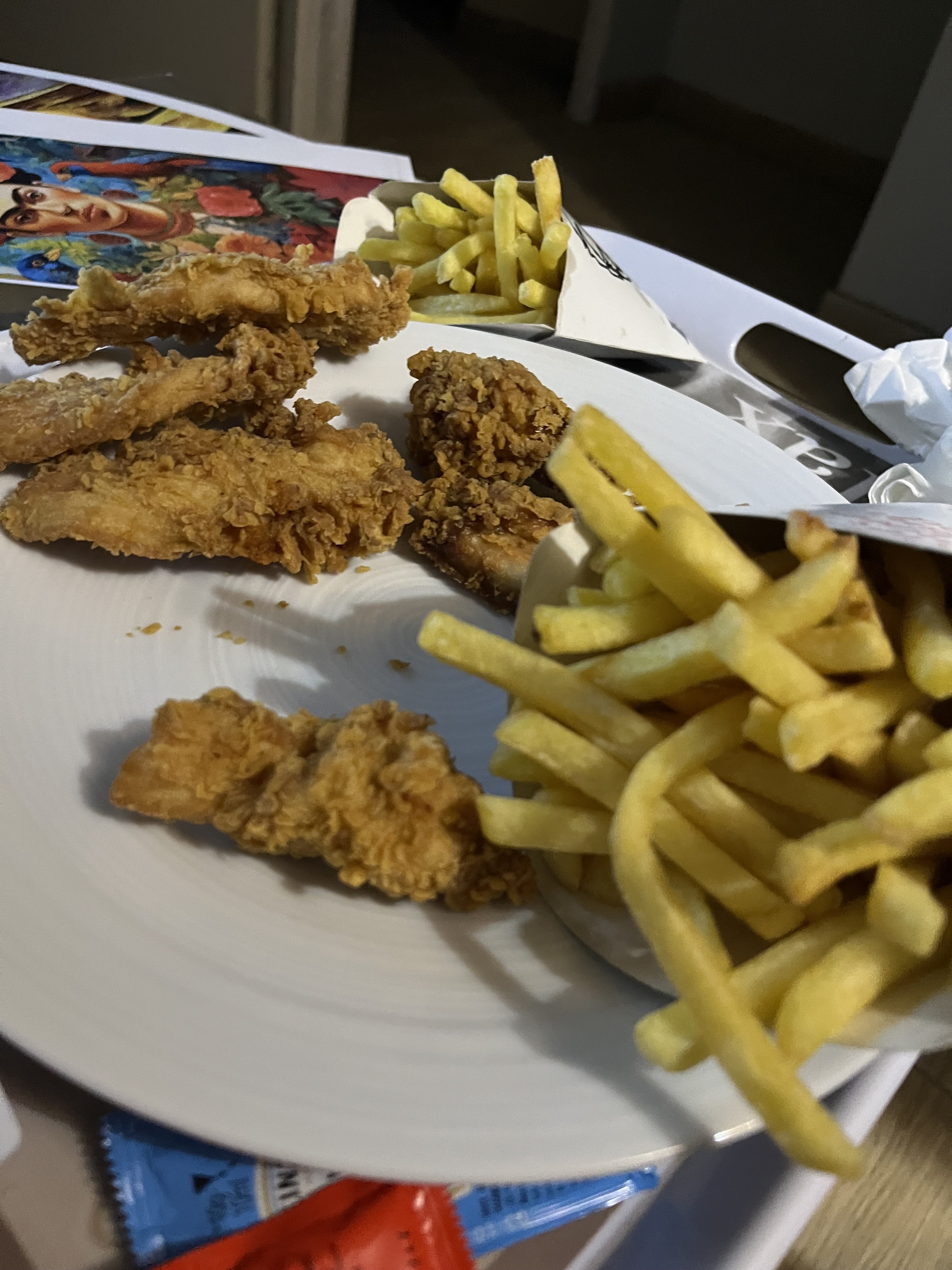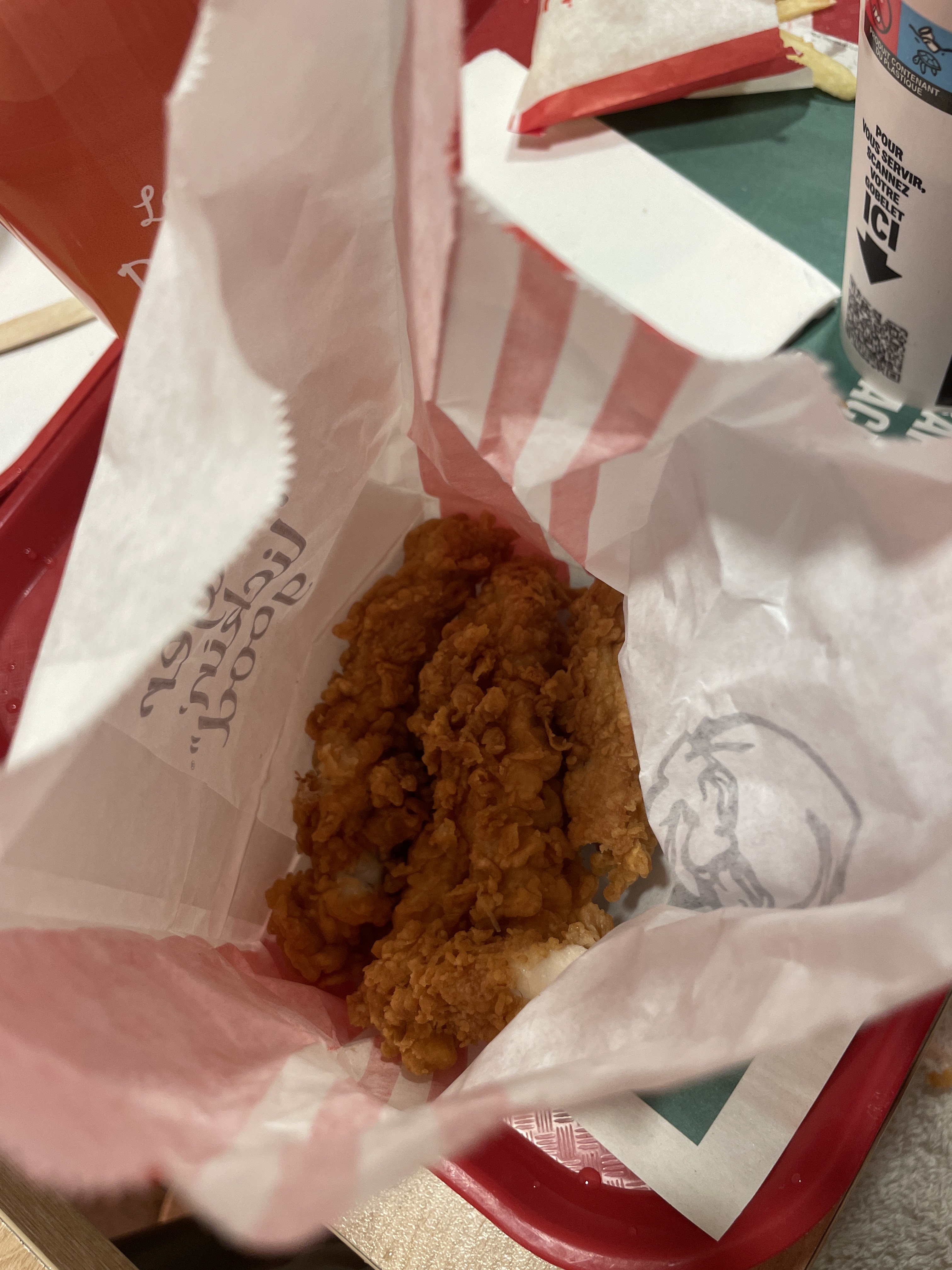 Le poulet est très bien, signature KFC rien a dire Les frites par contre, ne sont pas aussi bonnes ! Trop molle et pâteuse La température du poulet pourrait être moins chaud mais ce n'est qu'un plus et sans doute la température pas à mon goût Malgré tout j'ai tout mangé y a plus rien Cordialement La direction