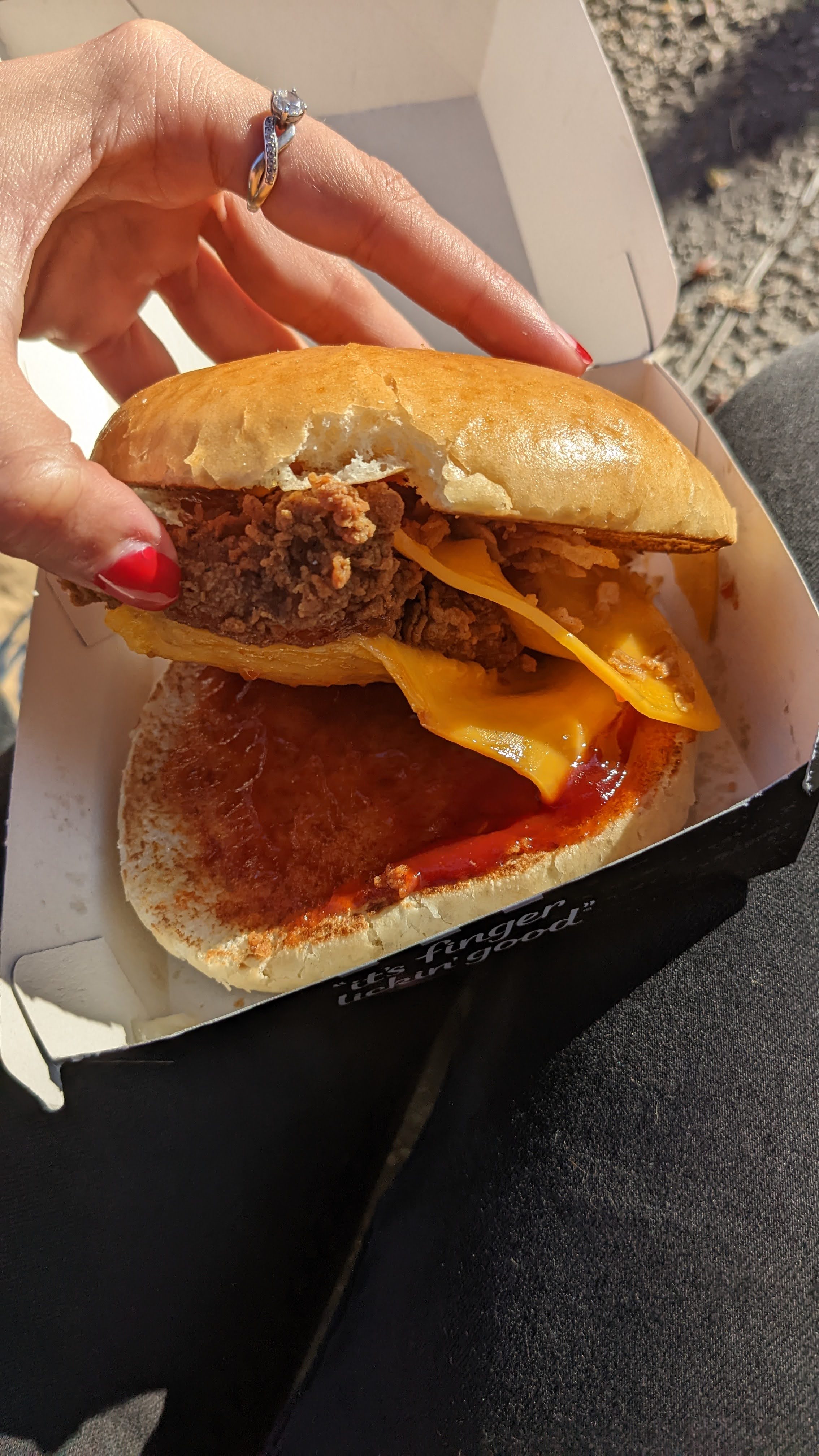 Une catastrophe, j’ai acheté un menu boxmaster, a emporter. Quand j’ai croqué c’était très dure. j’ai ouvert le sandwich voilà ce que j’ai eu. J’ai contacté le service client, très efficace, elle m’a pris en charge, j’ai renvoyer les photos et le ticket. On m’as rappelé et proposé de me refaire le menu. C’est pas la première fois que j’ai des mauvaises surprises avec ce kfc. Je ne le recommande pas et l’étoile c’est pour le service client.