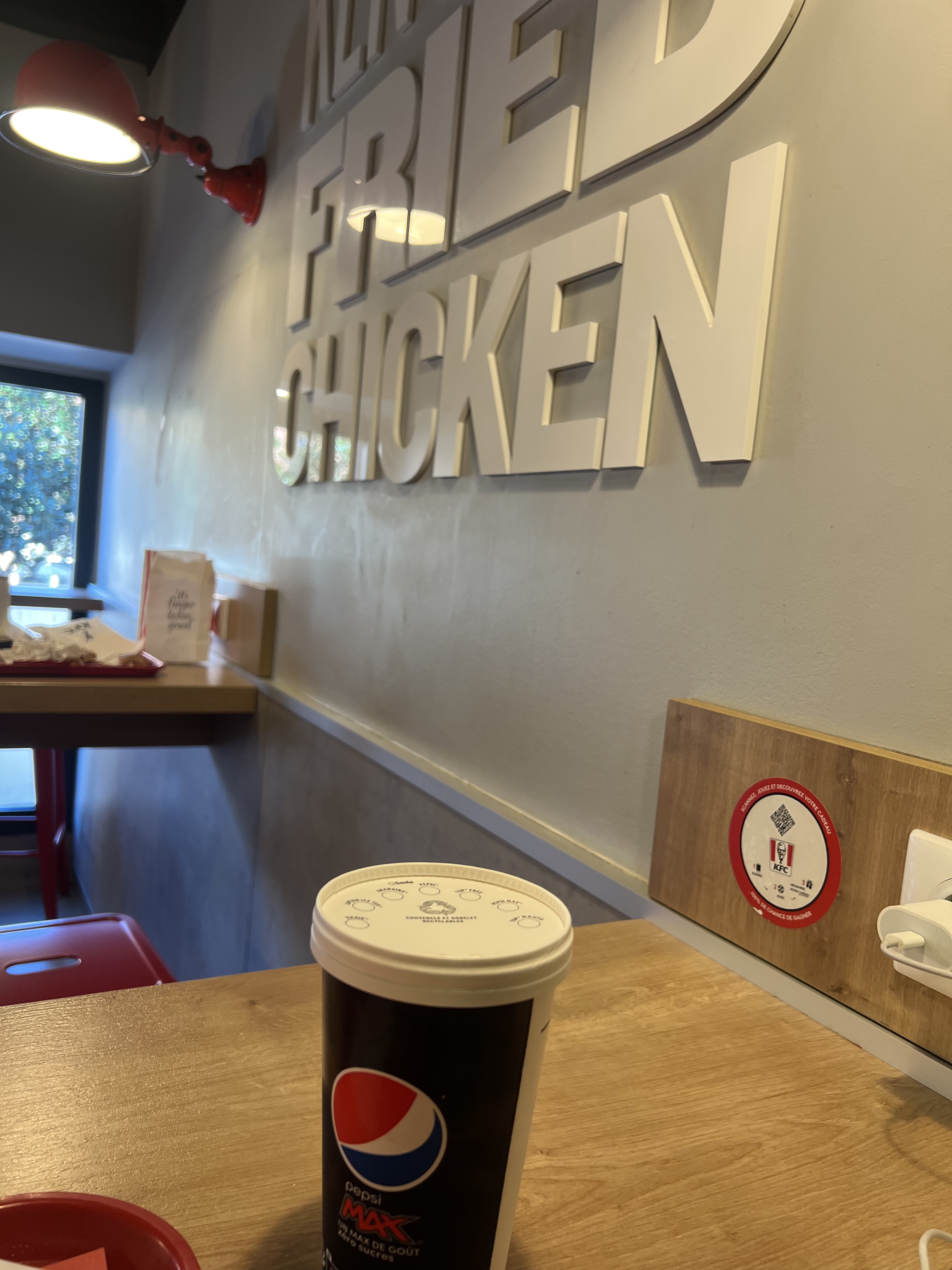 C'est un KFC. La bouffe a goût du KFC. J'aurai mis 5 étoiles mais j'ai pas eu mes glaçons avec mon 7up (quel malheur) ni les sauces pour tremper mes frites (journée ruinée) La salle en haut est un peu petite mais c'est marrant de regarder les gens depuis l'étage d'un KFC du coup ça compense pas mal. A votre place j'aurai retapé le bâtiment pour qu'il aie une forme de bucket pour vraiment pousser l'expérience jusqu'au bout.