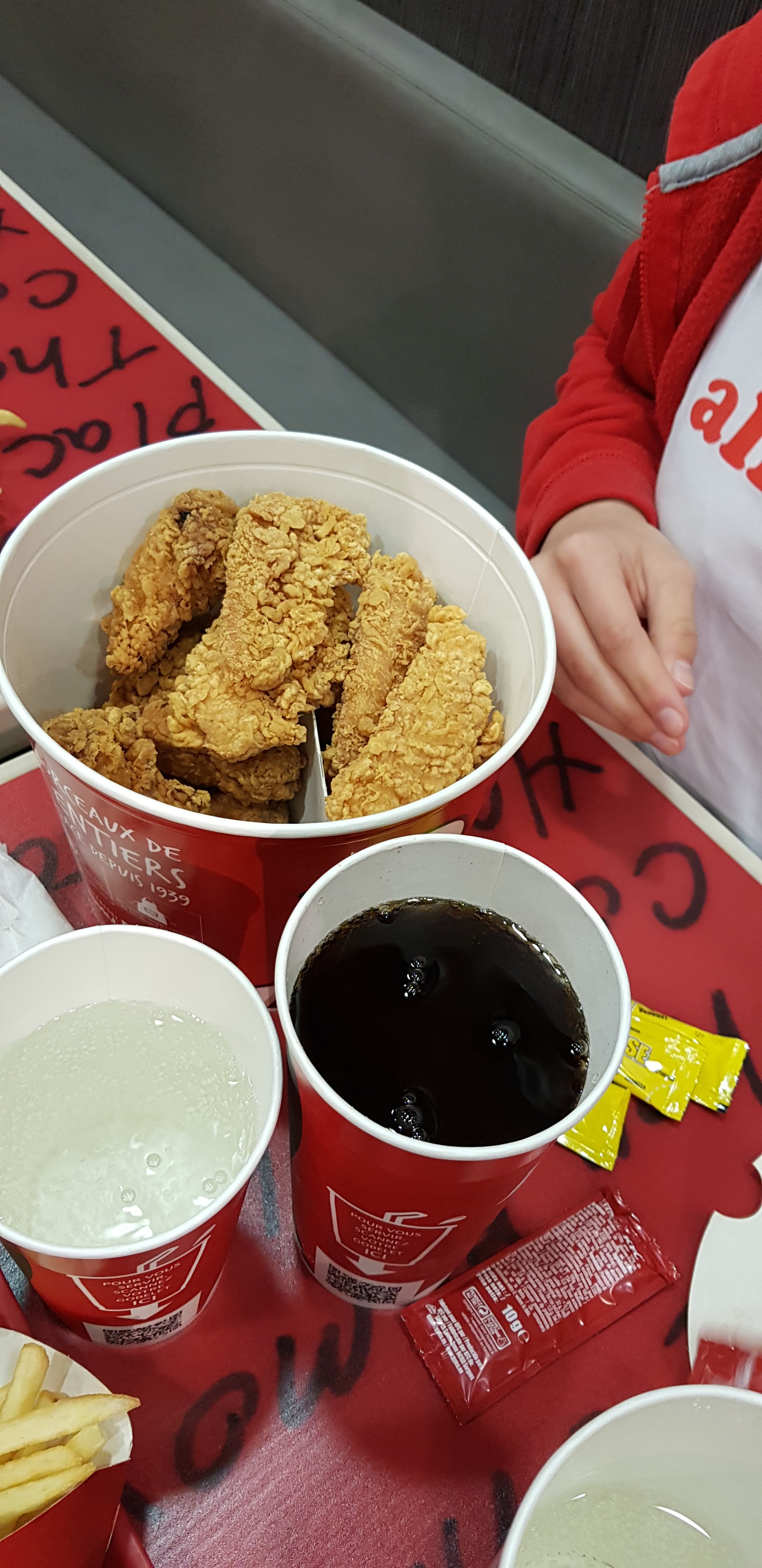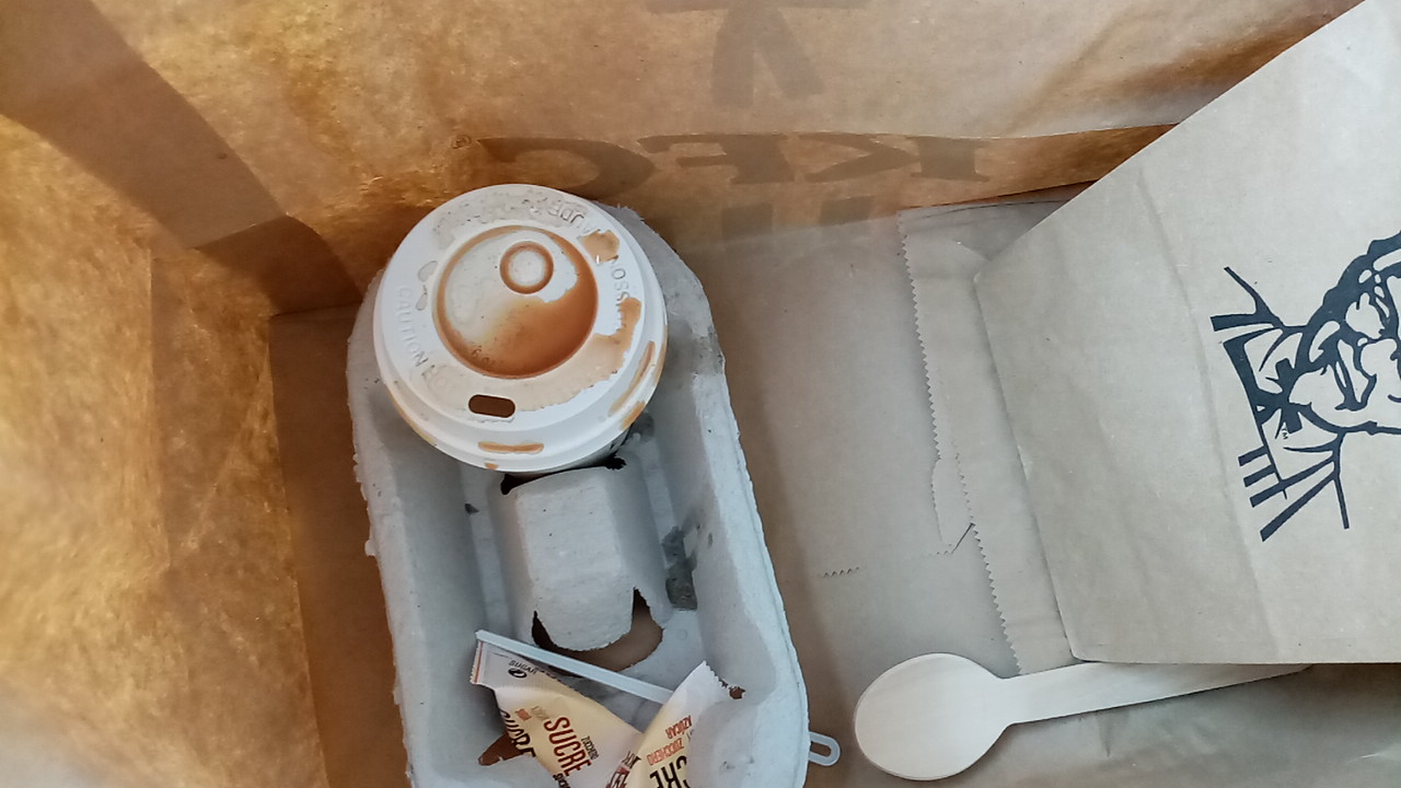 Super la taille des tenders déjà que l'on mange dehors en plus c'est tout petit, pour le cappuccino bravo à emporter et ça déborde Donc un 2 pour ce KFC pas terrible