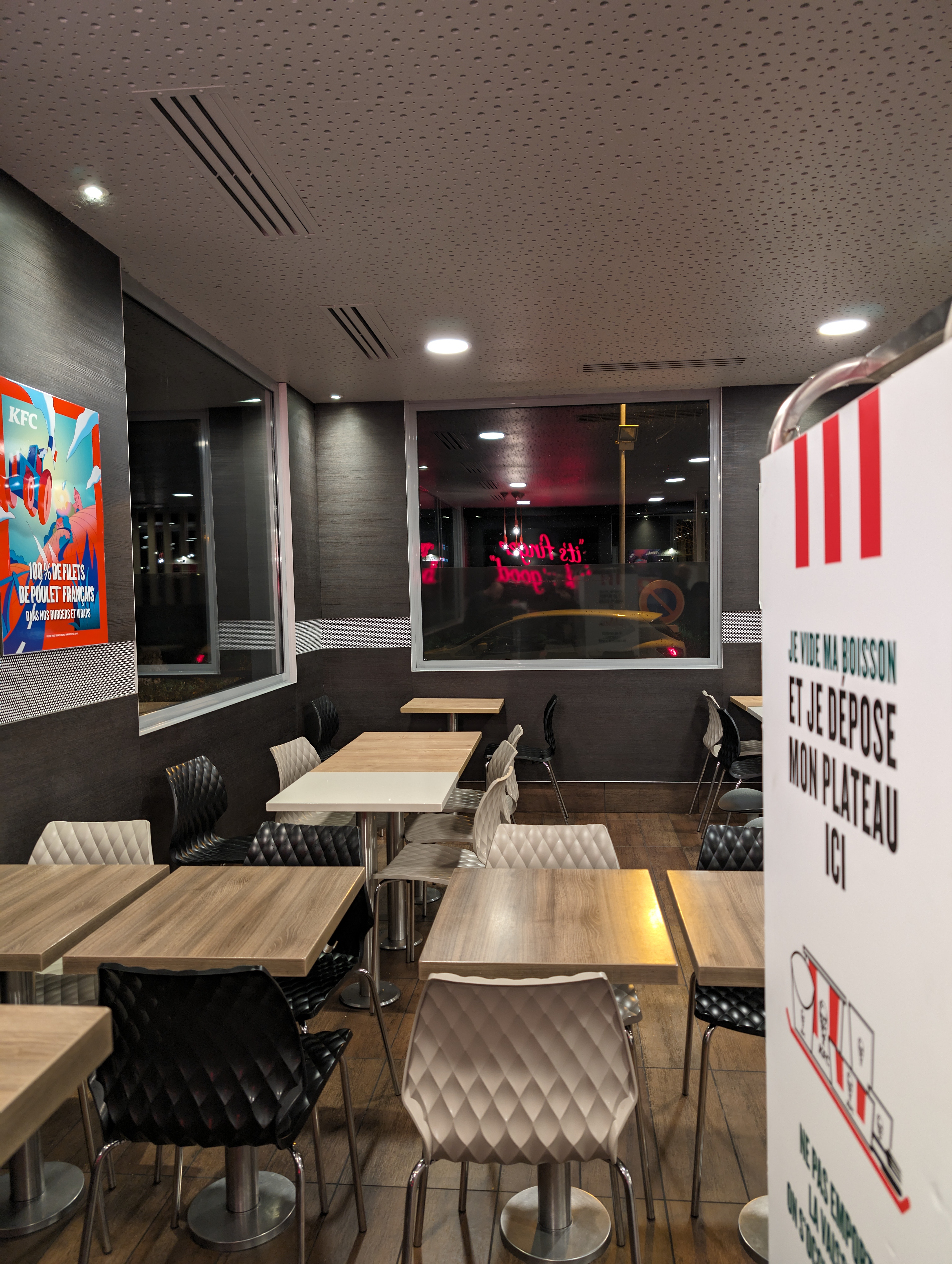 Arrivée à 21h45 , nous avons donc mangé sur la terrasse , cependant avant de manger et de passer commande direction les toilettes, et là l'enfer des serviettes hygiénique , de la pisse partout , des gants en latex usagé , le sol tout collant , enfin bref nous décidons tout de même de manger car on aime le KFC..Ce n'est pas fini on s'installe à table qui ne sont bien évidemment pas propre...22h10 je décide d'aller me chercher à boire et surprise nous somme enfermé à l'extérieur car le restaurant ferme à 22h30.... Svp faites quelques en terme de management et formation pour vos collaborateurs. Honteux...
