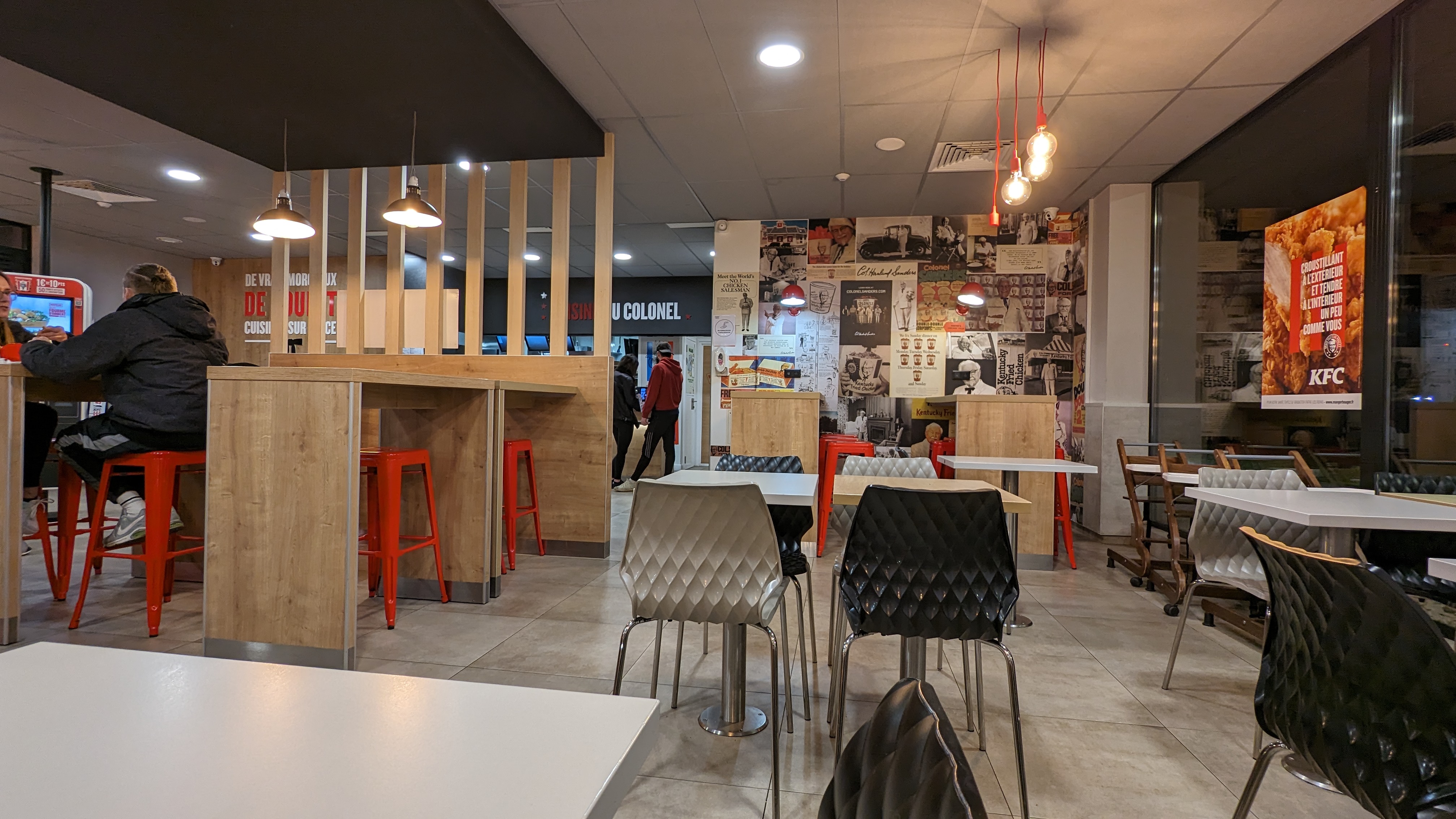 Un KFC comme un autre, en revanche pas très grand, établissement propre, service rapide. RAS de mon côté. Je trouve KFC légèrement plus cher que ses concurrents.