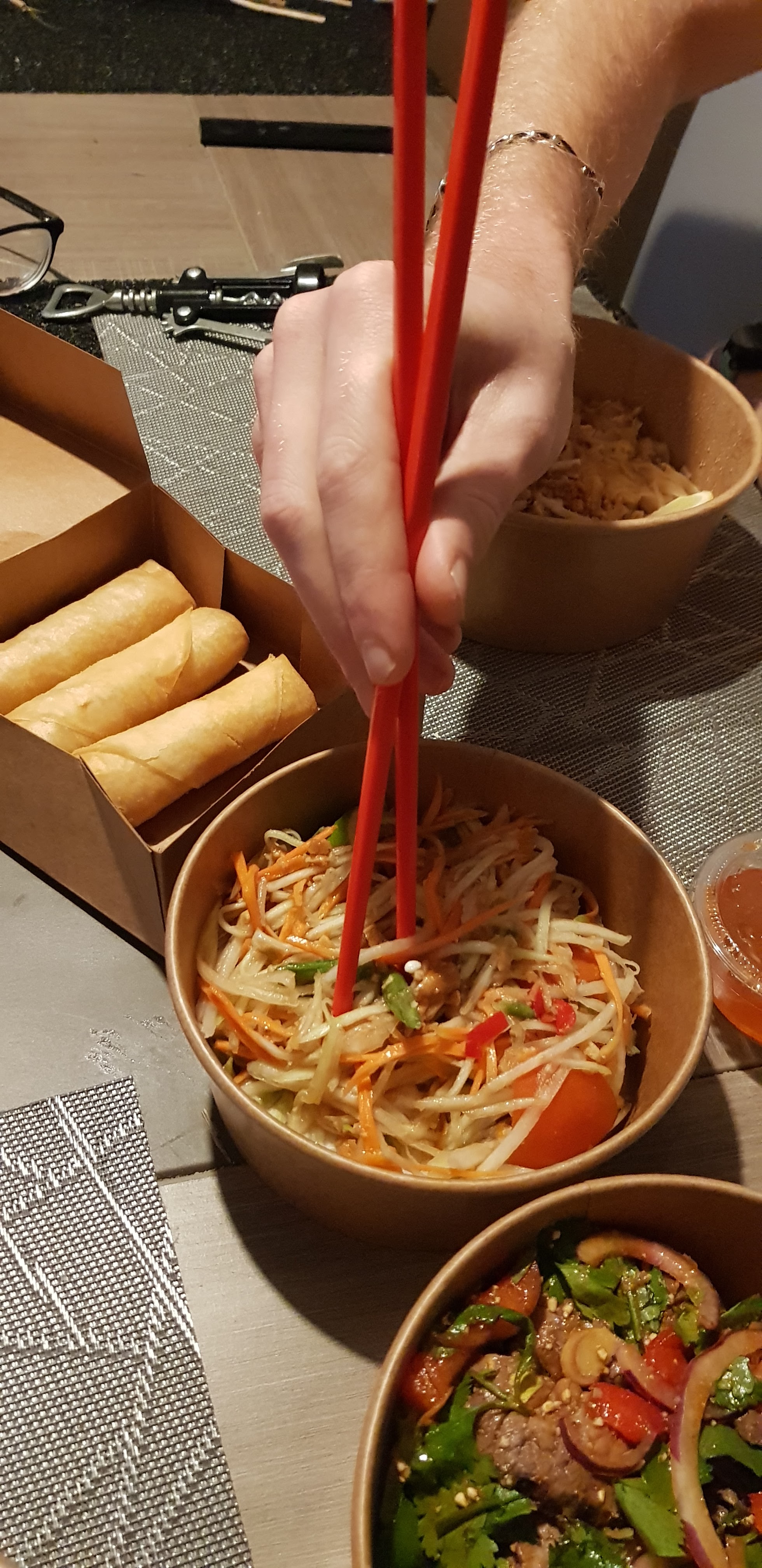 J'ai testé une soupe Pho et un Pad Thai. Déçue par les goûts. Soupe Pho un peu fadasse. Le pad thai quant à lui baignait dans une sauce très sucrée, le rendant presque écœurant. Bref, expérience que je n'ai pas envie de renouveler, moi qui aime pourtant tant la cuisine thaï !