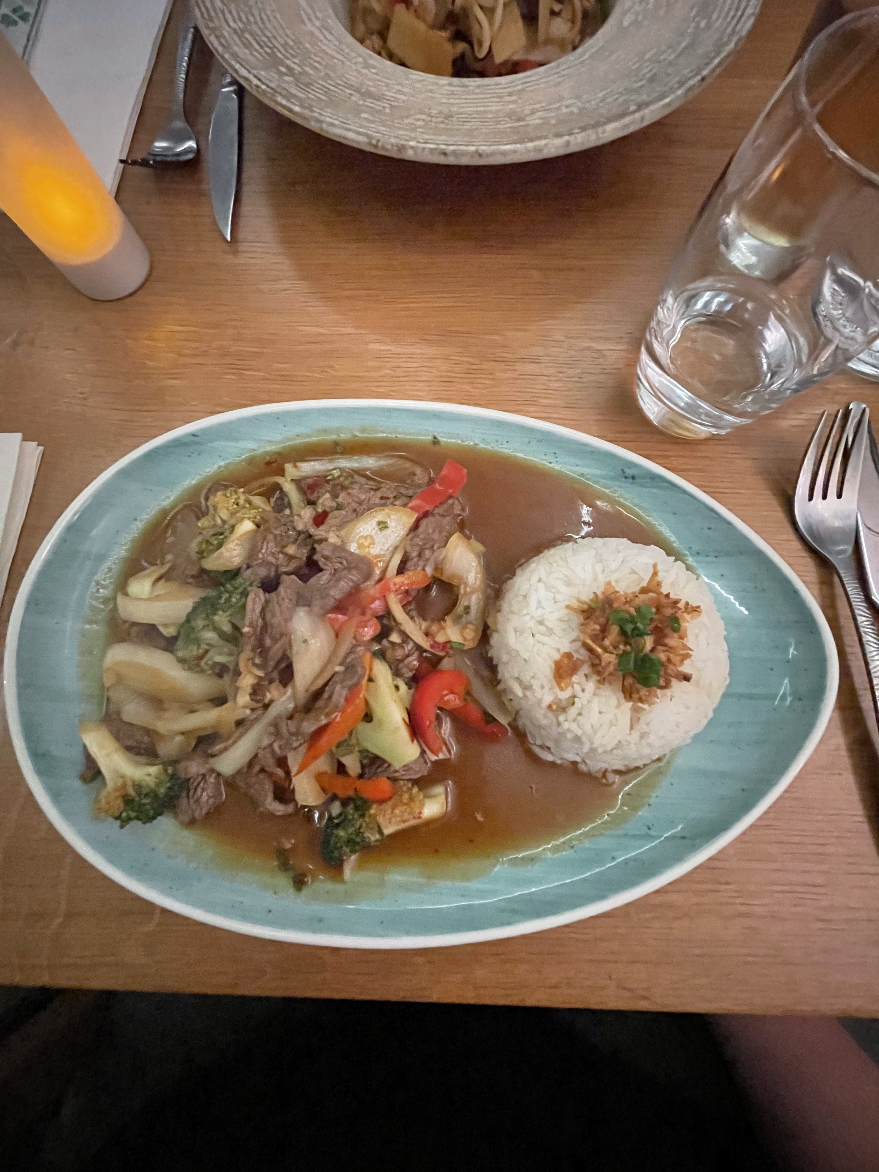 C'était de mon goût correct et sans plus. Sauce trop sucrée et pas assez goûteuse et relevée. En Thaïlande, ce plat ne se sert pas ainsi. Viande plus émincée, davantage de basilic et d'ail et bien épicée. Souvent, le riz blanc vient avec un oeuf frits au dessus. Prix correct. Bonne portion cela dit.