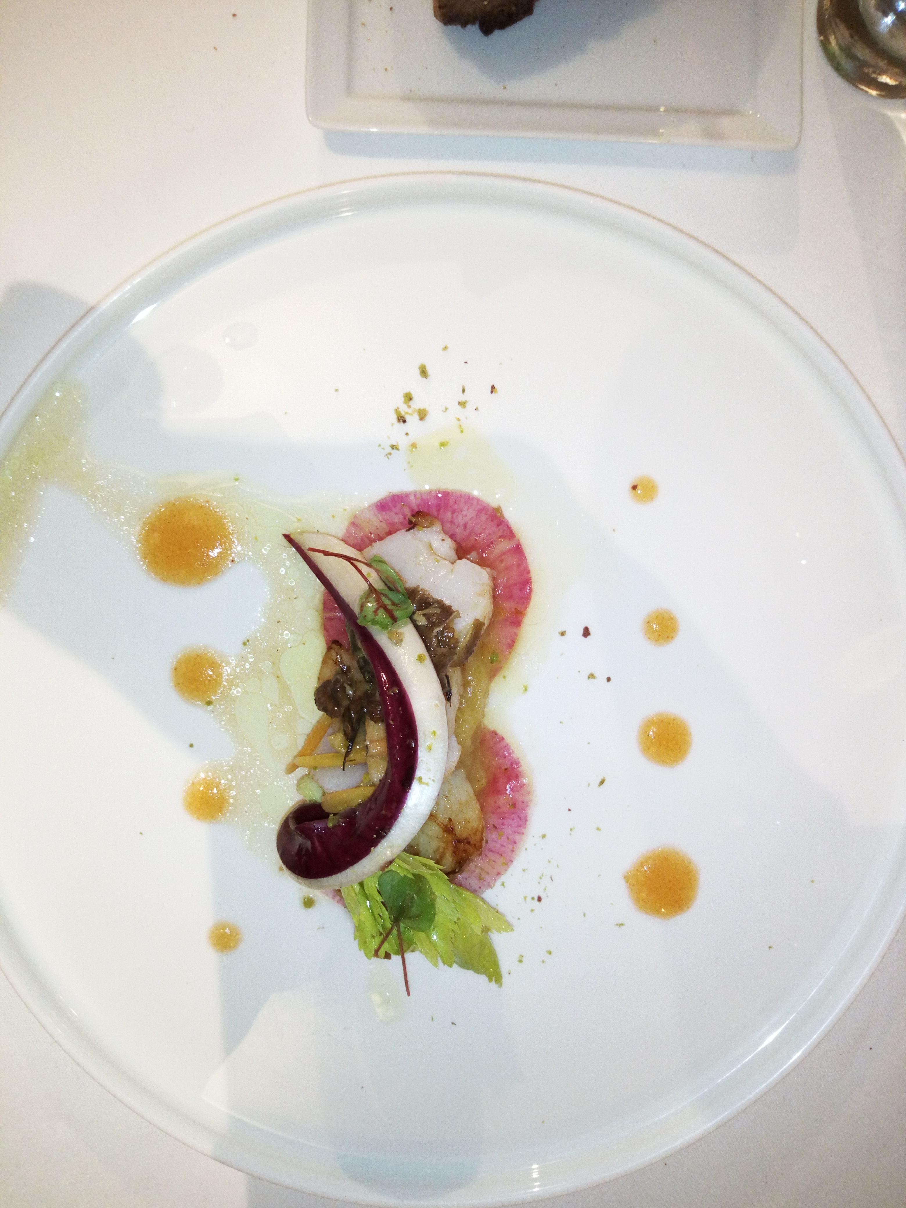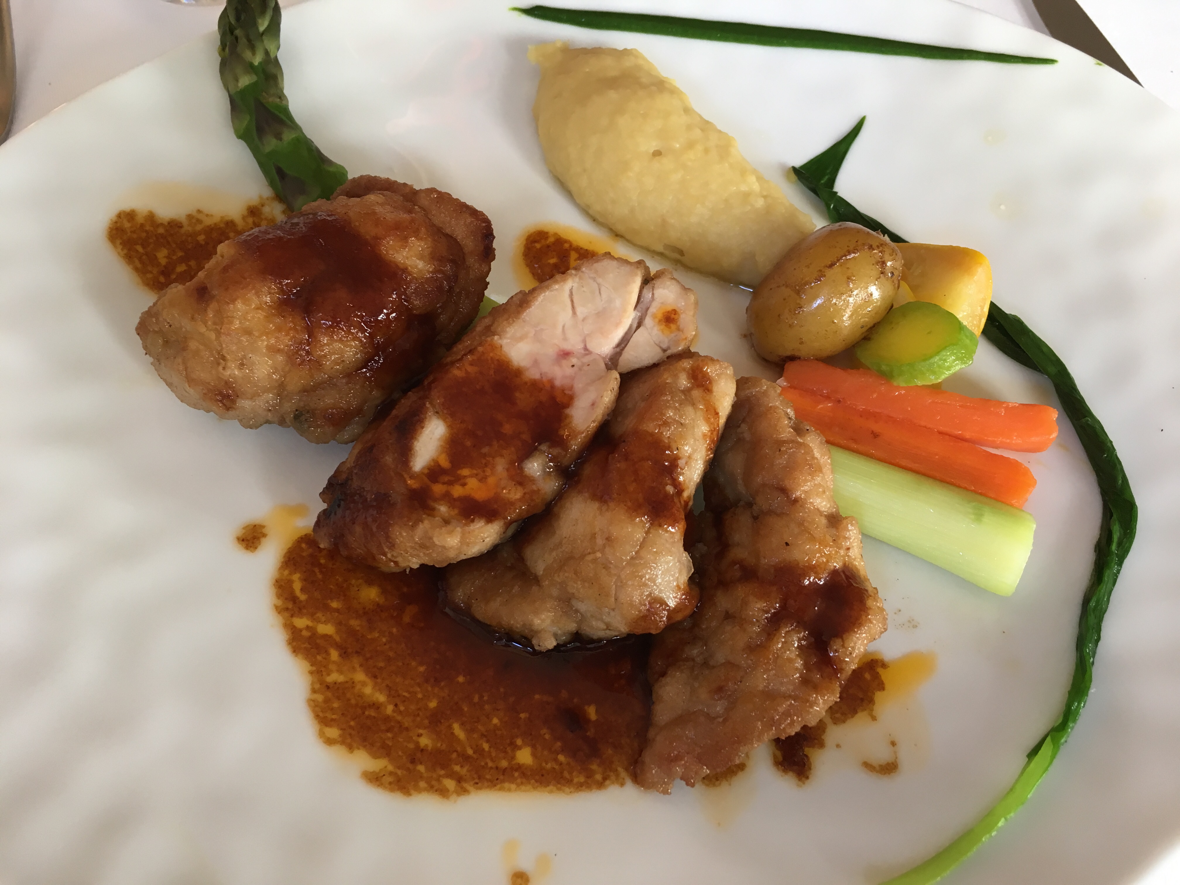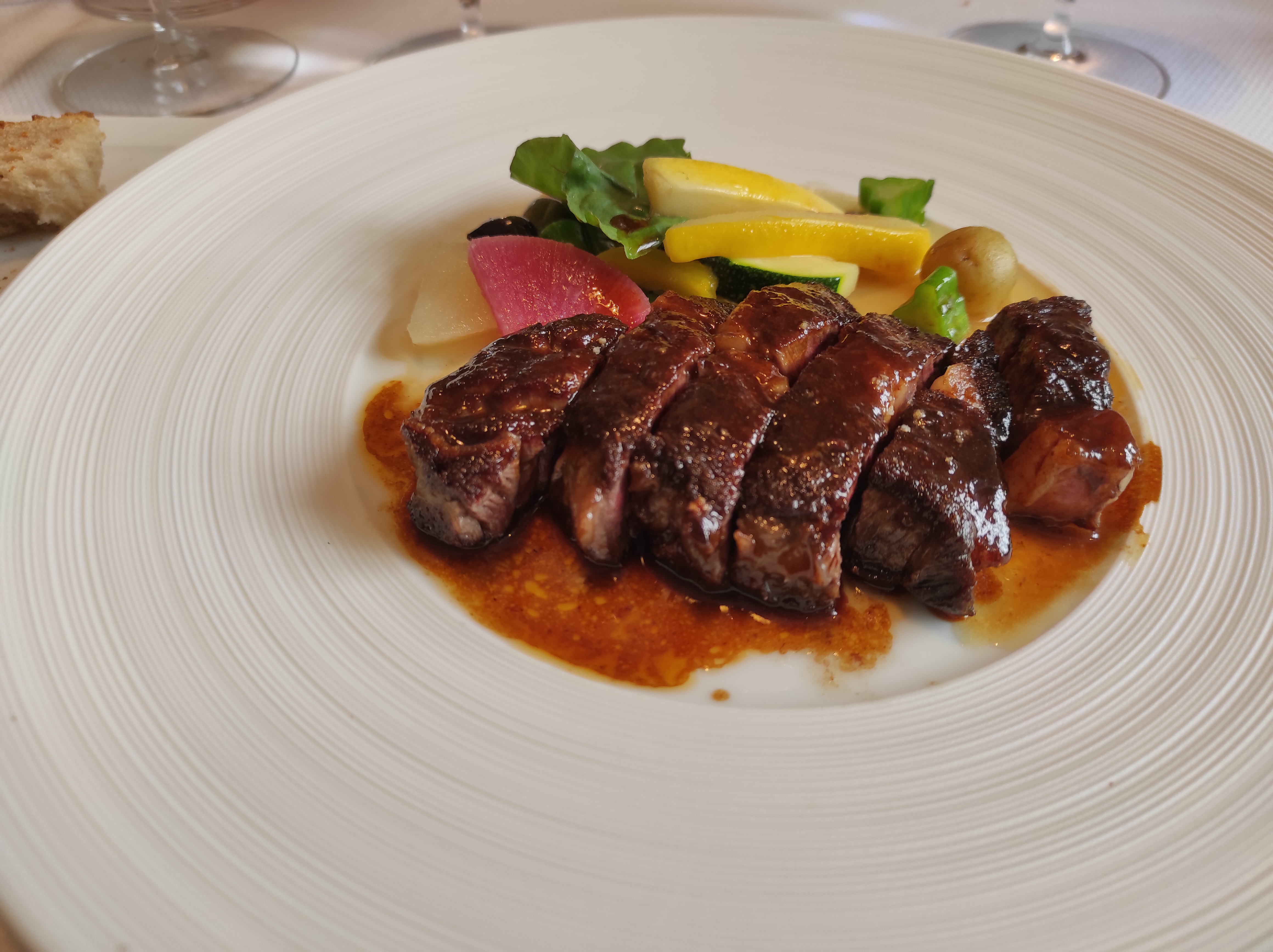 Belle expérience et belle cuisine d'un chez généreux. C'est une cuisine en douceur, tout est maîtrisé et équilibré et c'est la qu'on retrouve la touche japonaise du chef : il s'agit d'être précis et excellent, pas de vous en mettre plein la vue. Ça n'explose pas en bouche cela se construit sur la longueur de bouche. La maîtrise des cuissons est exceptionnelle et les ris de veau et langue croustillante est une expérience à faire tant le travail sur les contrastes est passionnante : fondant croustillant, doucereux salé, fibreux gélatineux.. Génial ! En dessert ? Un soufflé au fruit de la passion juste dans les règles de l'art et pas trop sucré. Vivement la carte d'automne