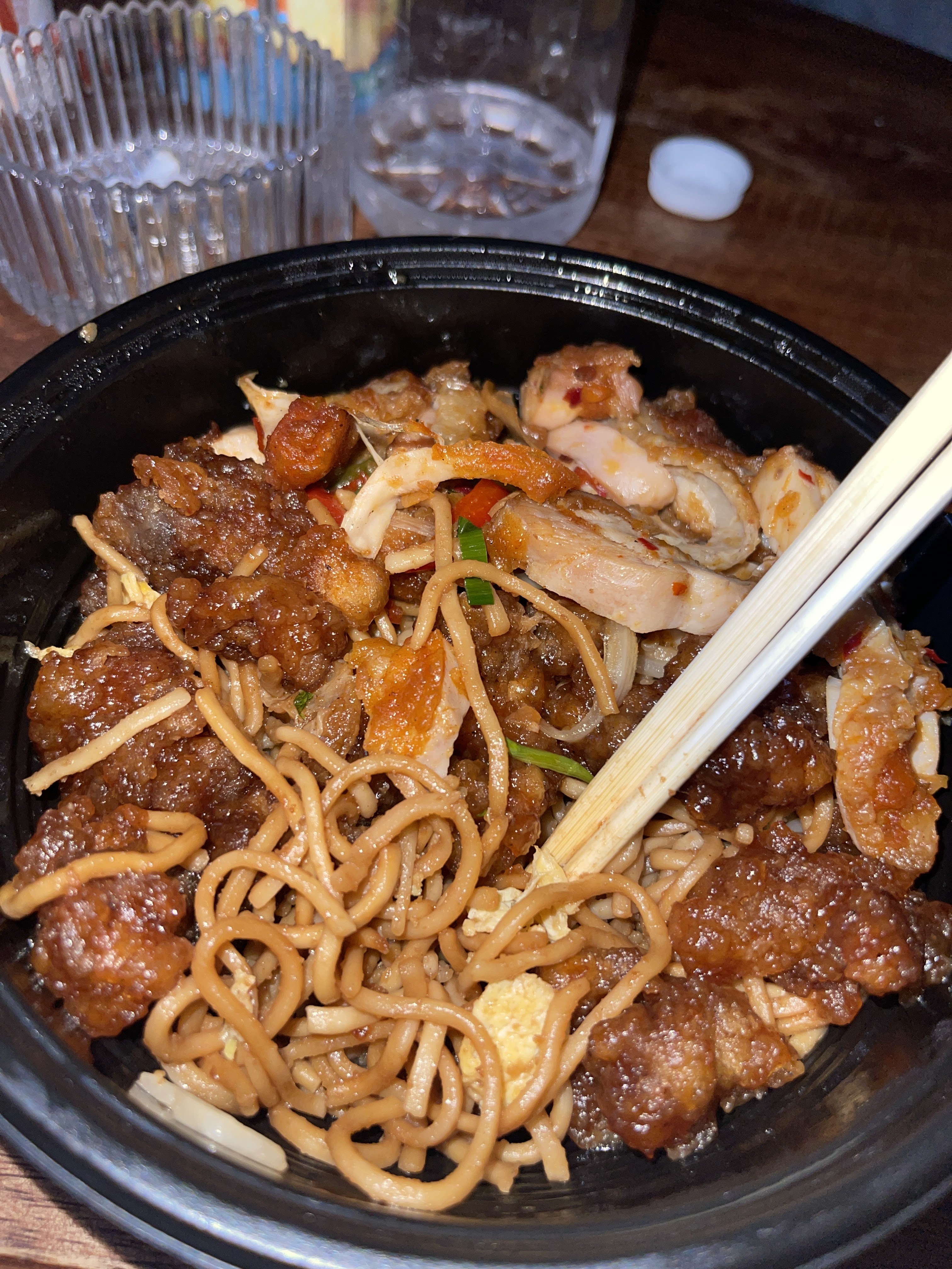 C’est trop bon ! Base nouille avec porc caramel et poulet du chef !
