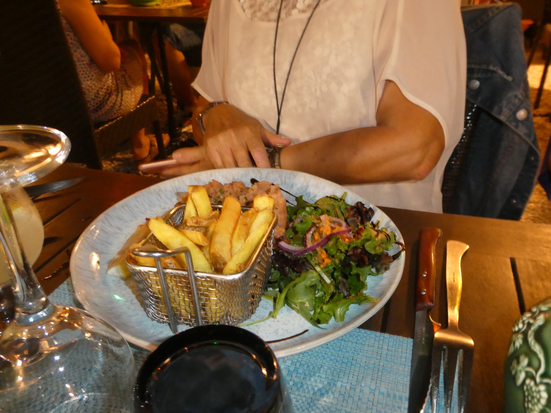emplacement merveilleux, nourriture correcte, viande excellente, pas de tartare, excellents desserts, bon service.