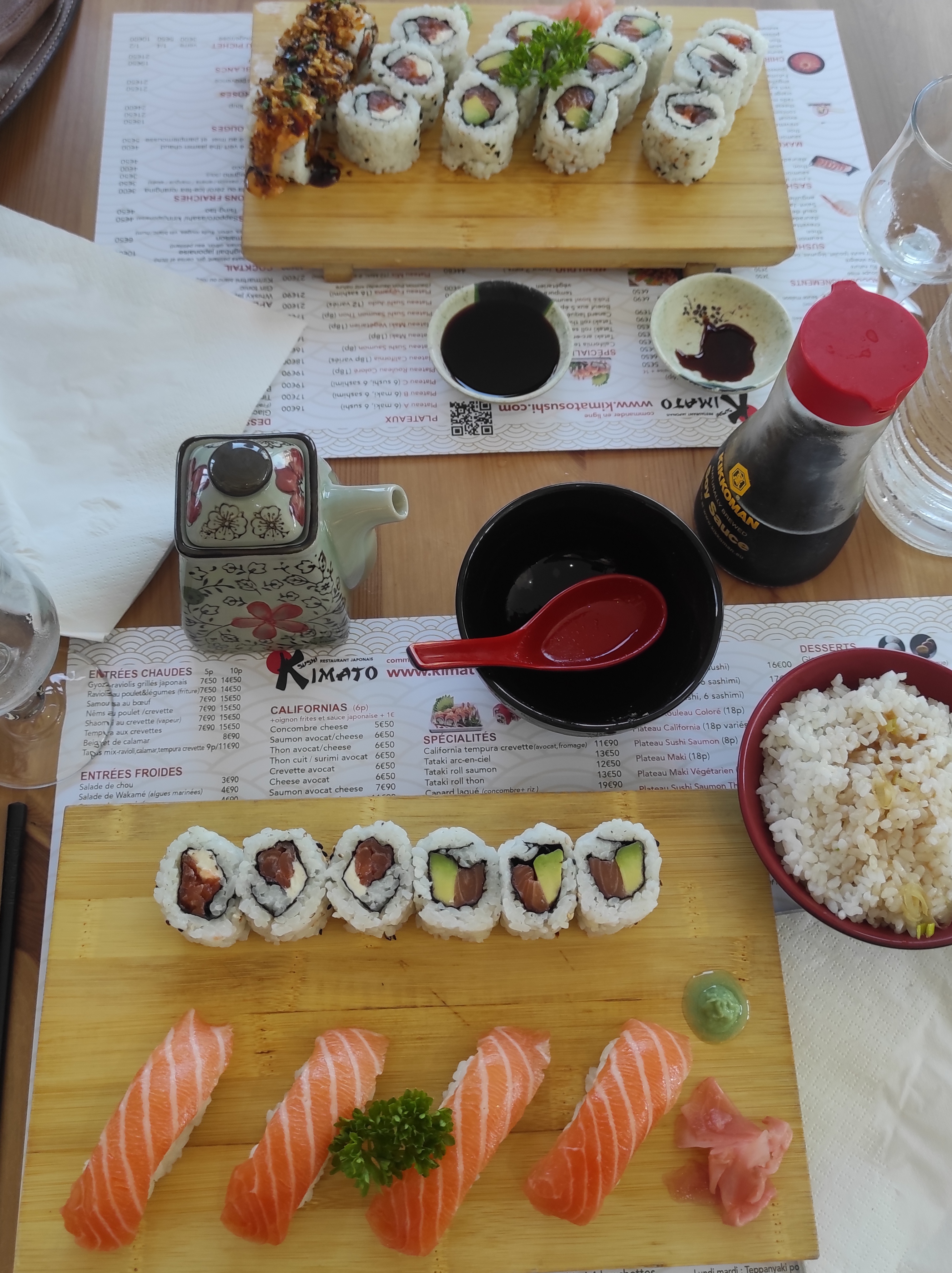 Extrêmement déçu de ma dernière commande alors que ça fait des années que je vais chez Kimato. Plus de takoyaki dans leur carte, des portions de wakame anémiques, les sashimis sont très mal découpés, le tartare saumon/avocat de ma compagne ne comporte pas d'avocat et est composé de 80% de choux... Bref, c'était un excellent restaurant, mais au vu de leur dernier service, je ne suis pas prêt d'y revenir.
